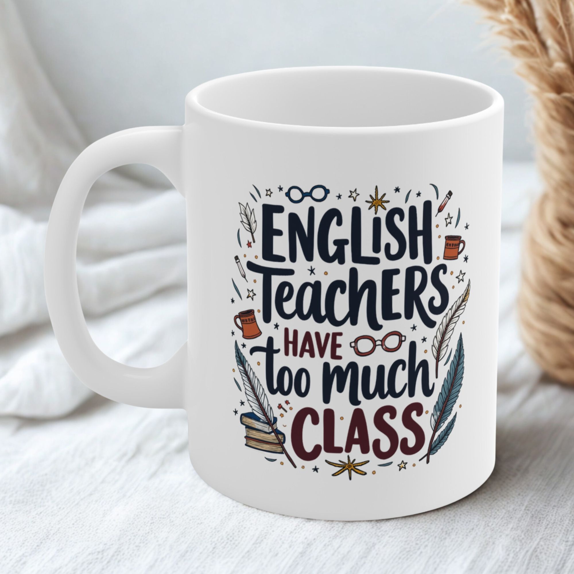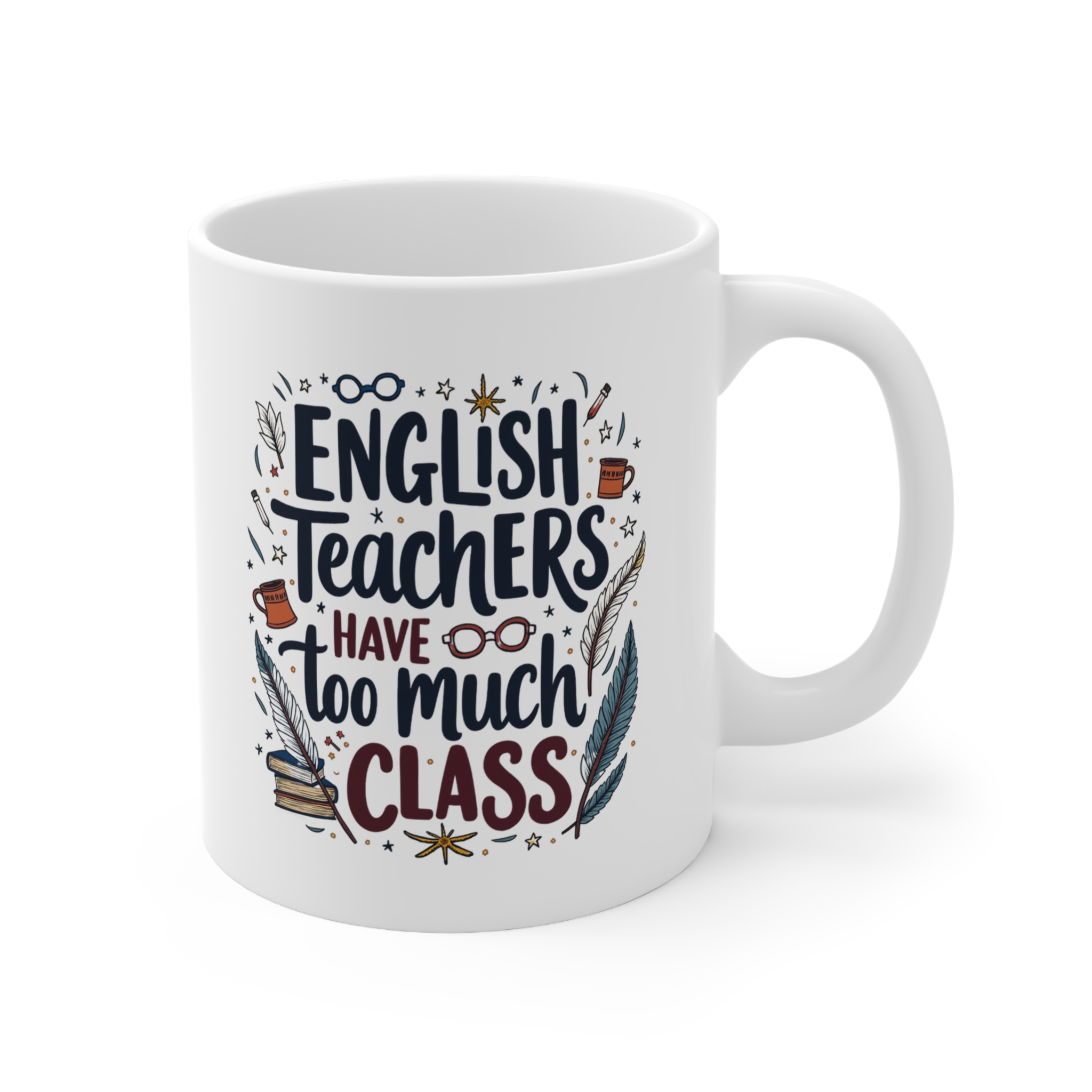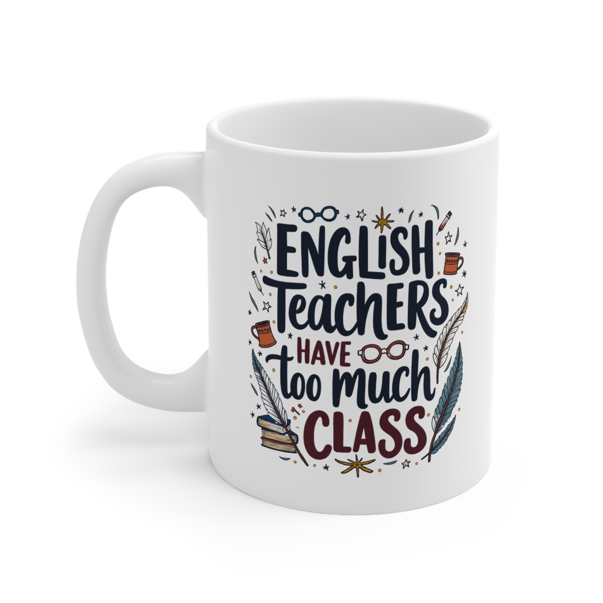 The English teacher mug that perfectly pairs grammar pride with classic wit! Featuring the clever quote “English Teachers Have Too Much Class” and surrounded by charming illustrations of vintage quills, books, reading glasses, and stars, this design is ideal for the literary genius in your life.