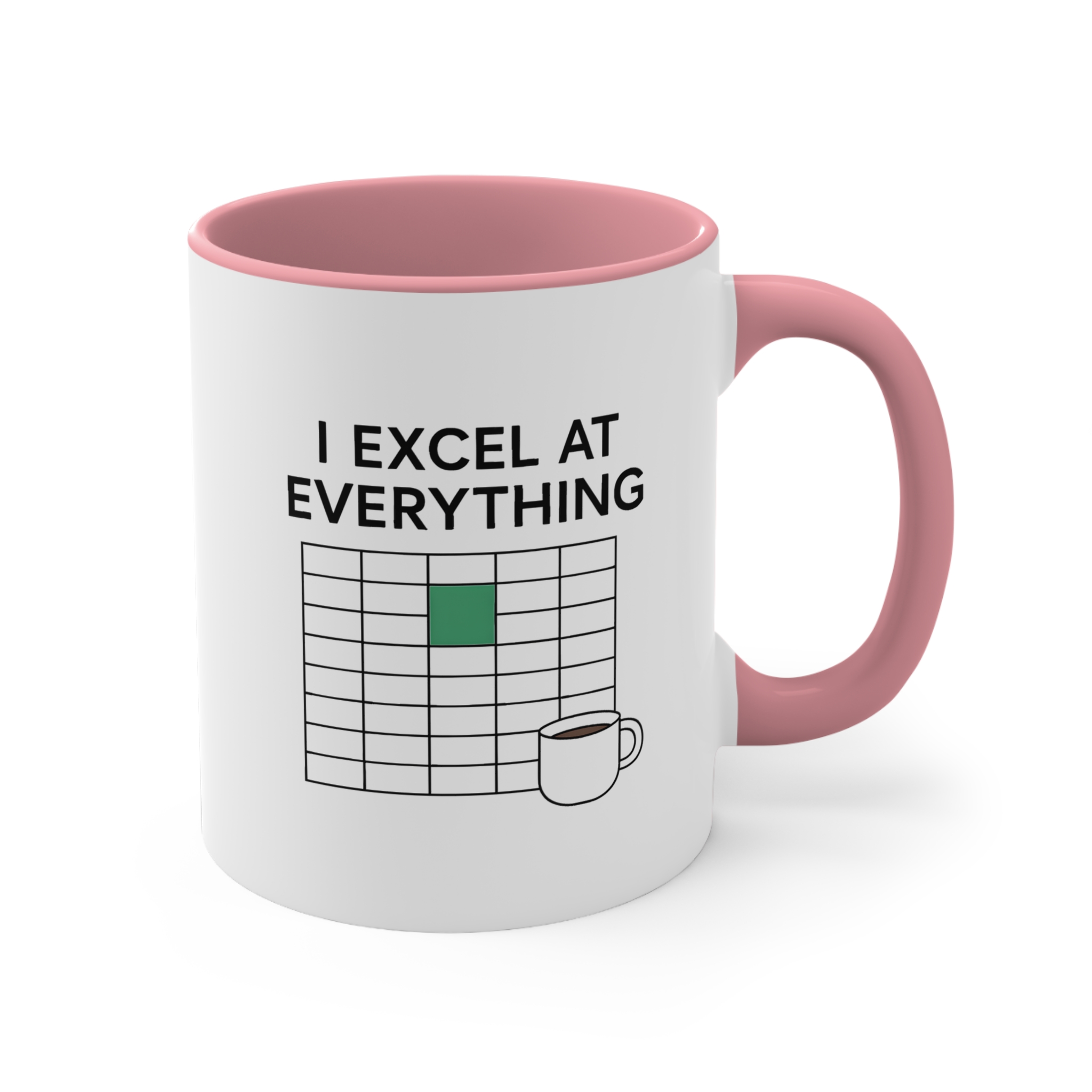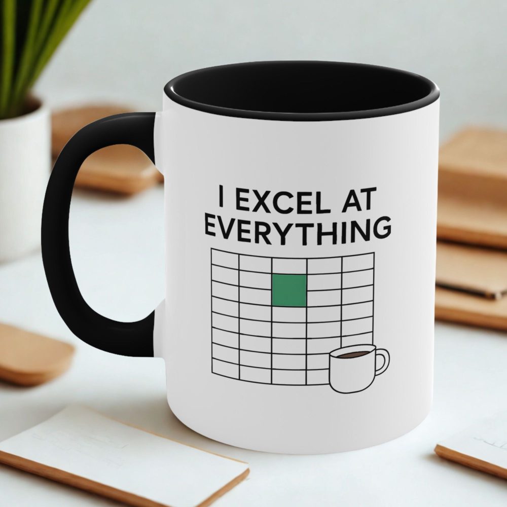 Funny Excel mug with “I Excel at Everything” pun and spreadsheet graphic. Perfect gift for office coworkers, spreadsheet wizards, and number nerds.