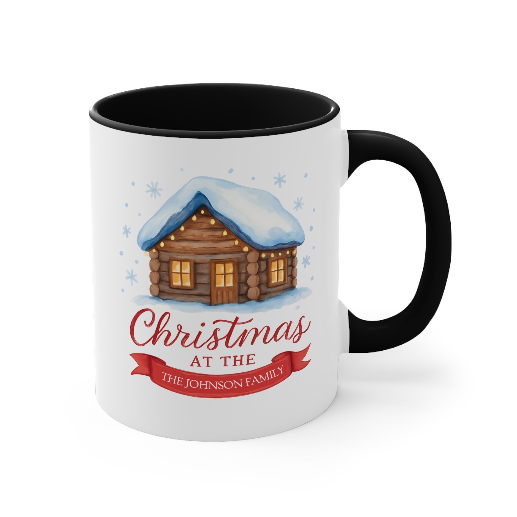 Bring the warmth of home to your holiday celebrations with this Family Christmas Mug, featuring a charming log cabin dusted with snow and soft Christmas lights. Customise it with your family name to make it truly one-of-a-kind — just like your festive traditions.