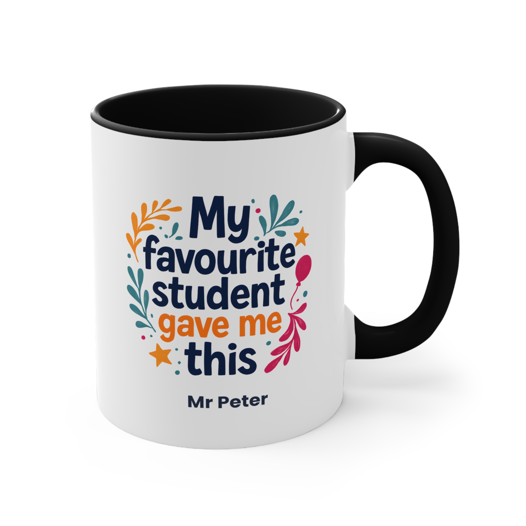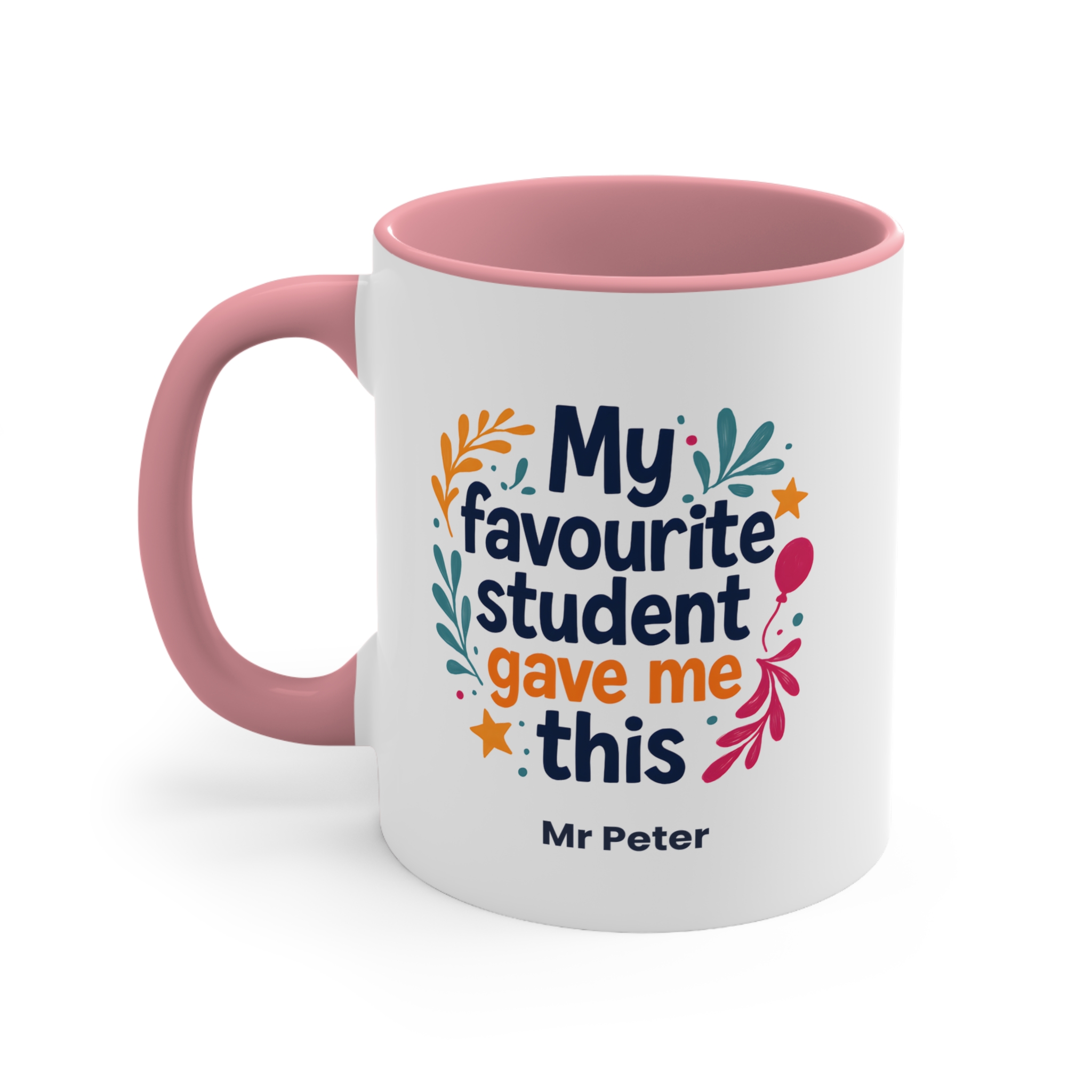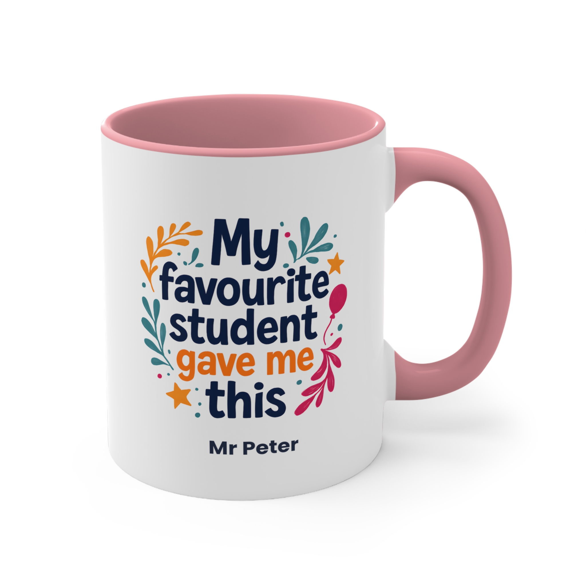 Personalised favourite student mug with the cheeky quote “My Favourite Student Gave Me This.” Add a teacher name (e.g., Mr Peter). 11oz accent mug, microwave safe, hand wash only, available in 4 handle colours.