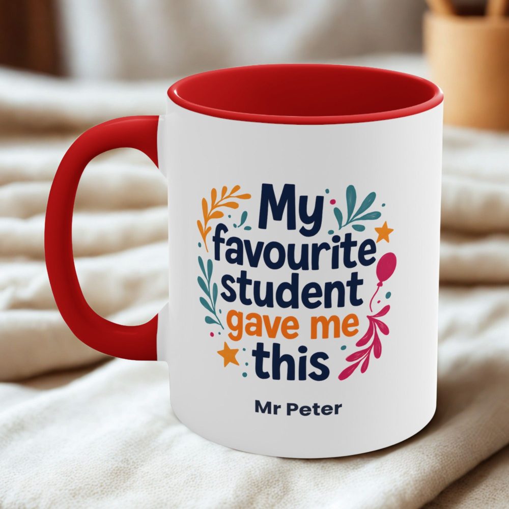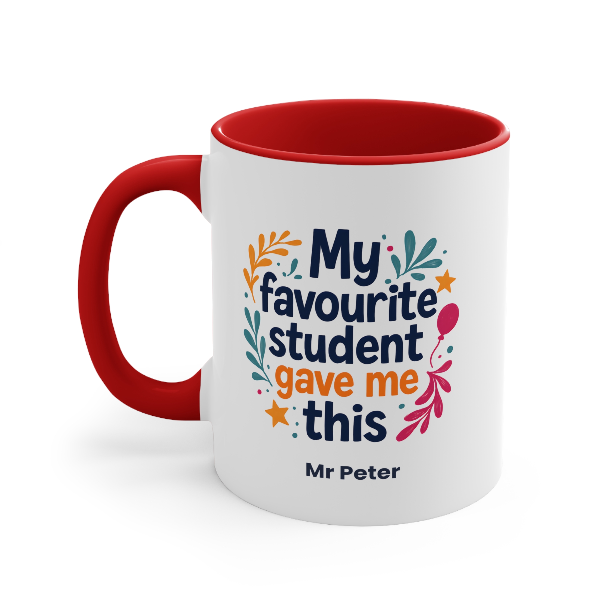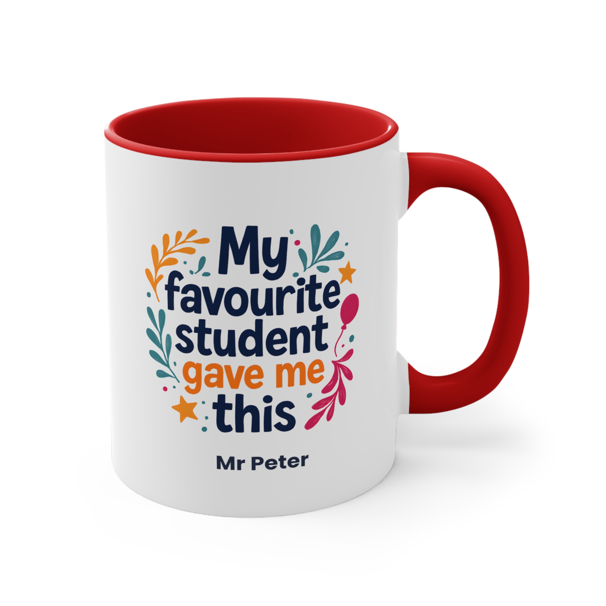 Personalised favourite student mug with the cheeky quote “My Favourite Student Gave Me This.” Add a teacher name (e.g., Mr Peter). 11oz accent mug, microwave safe, hand wash only, available in 4 handle colours.