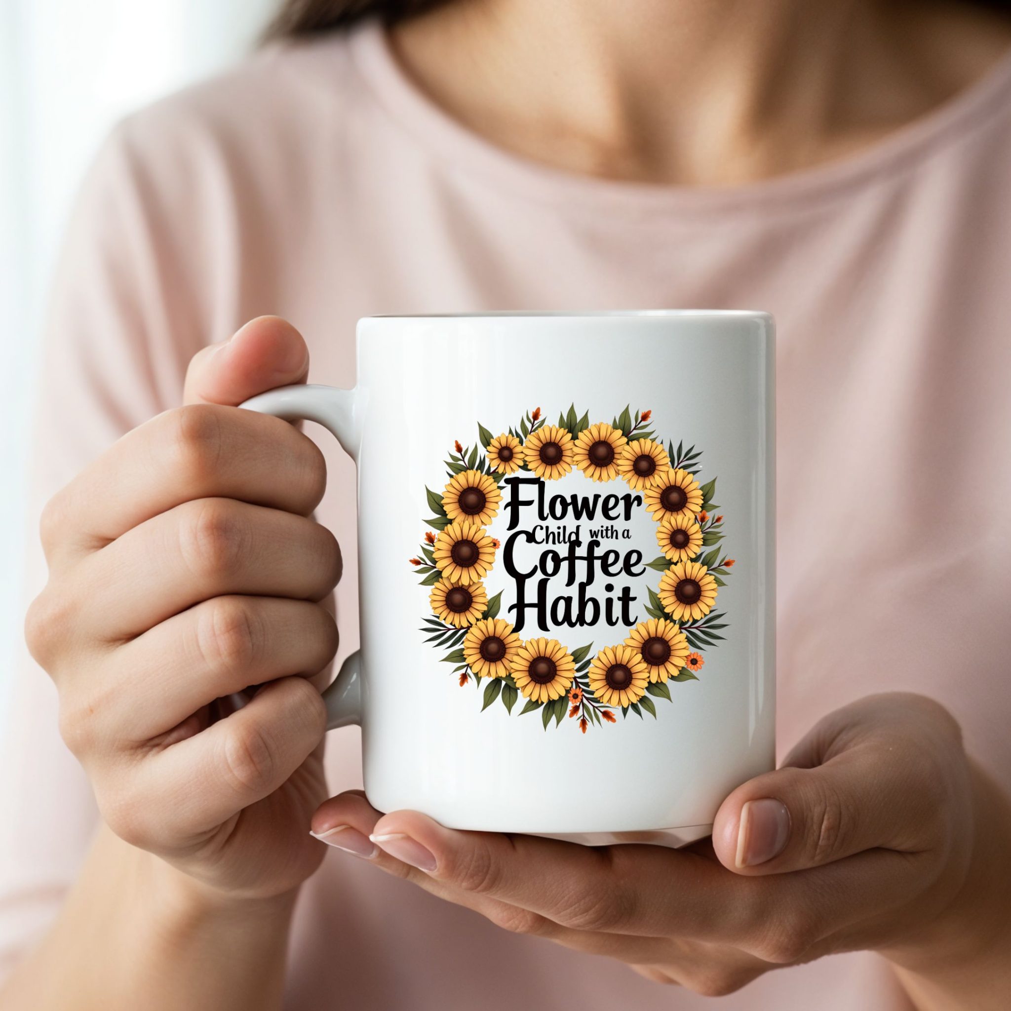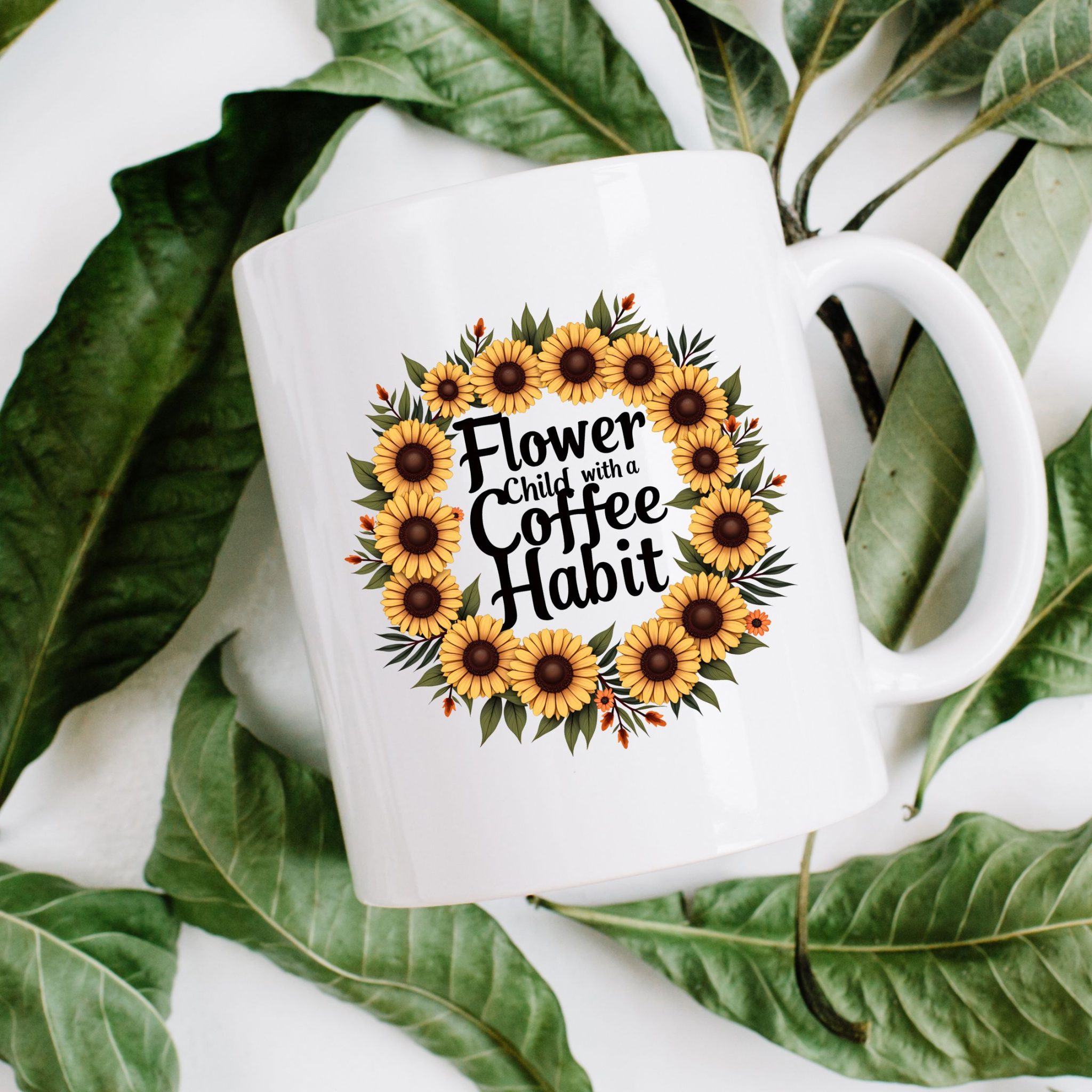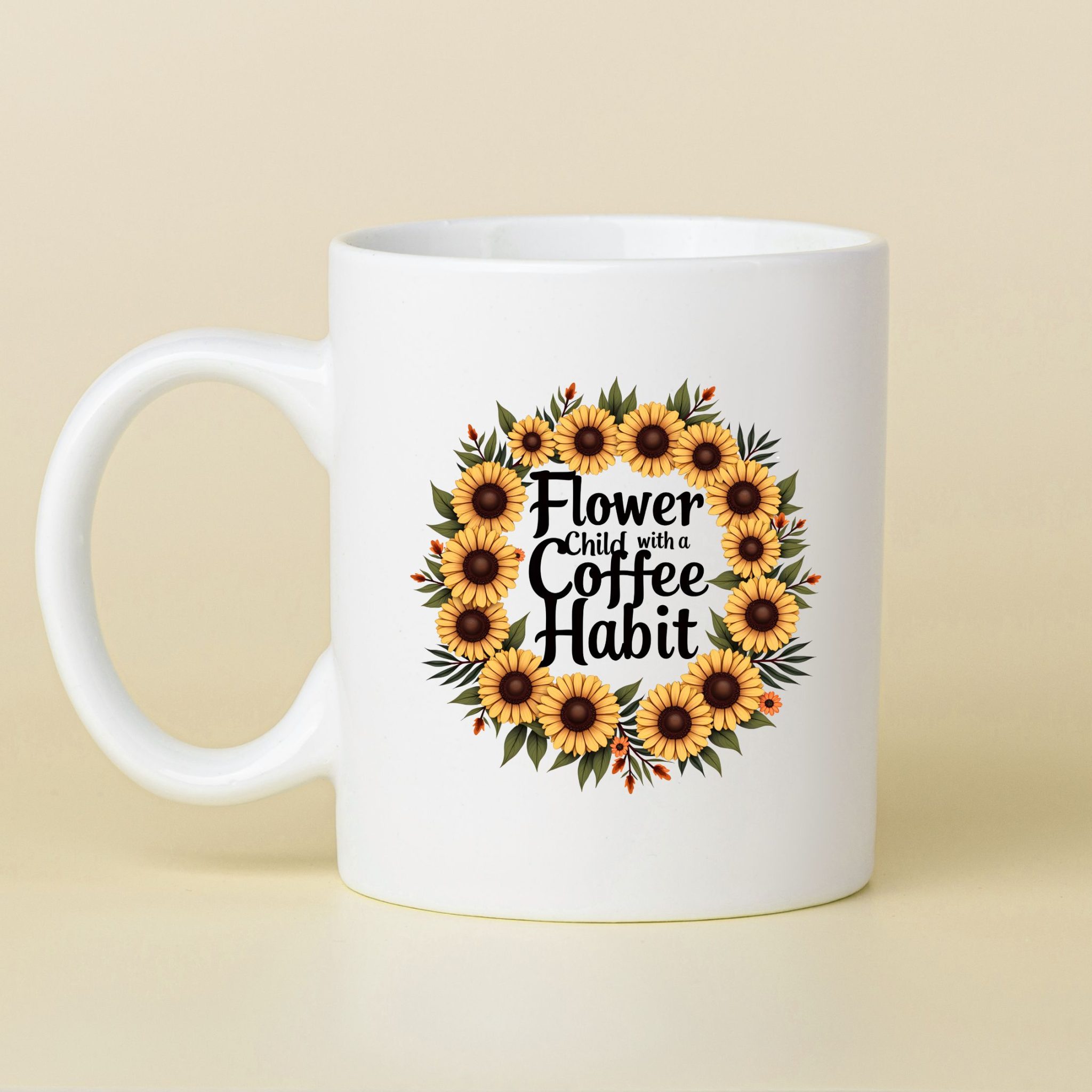 Boho “Flower Child with a Coffee Habit” mug with sunflower wreath design. A bright, bold cup for free spirits who run on caffeine.