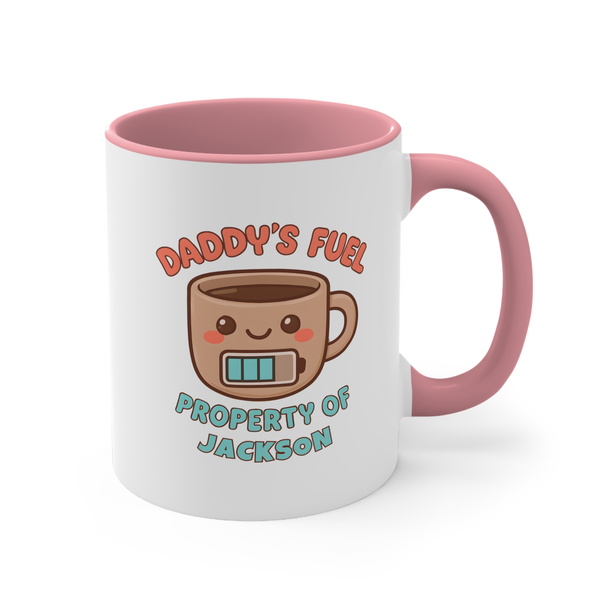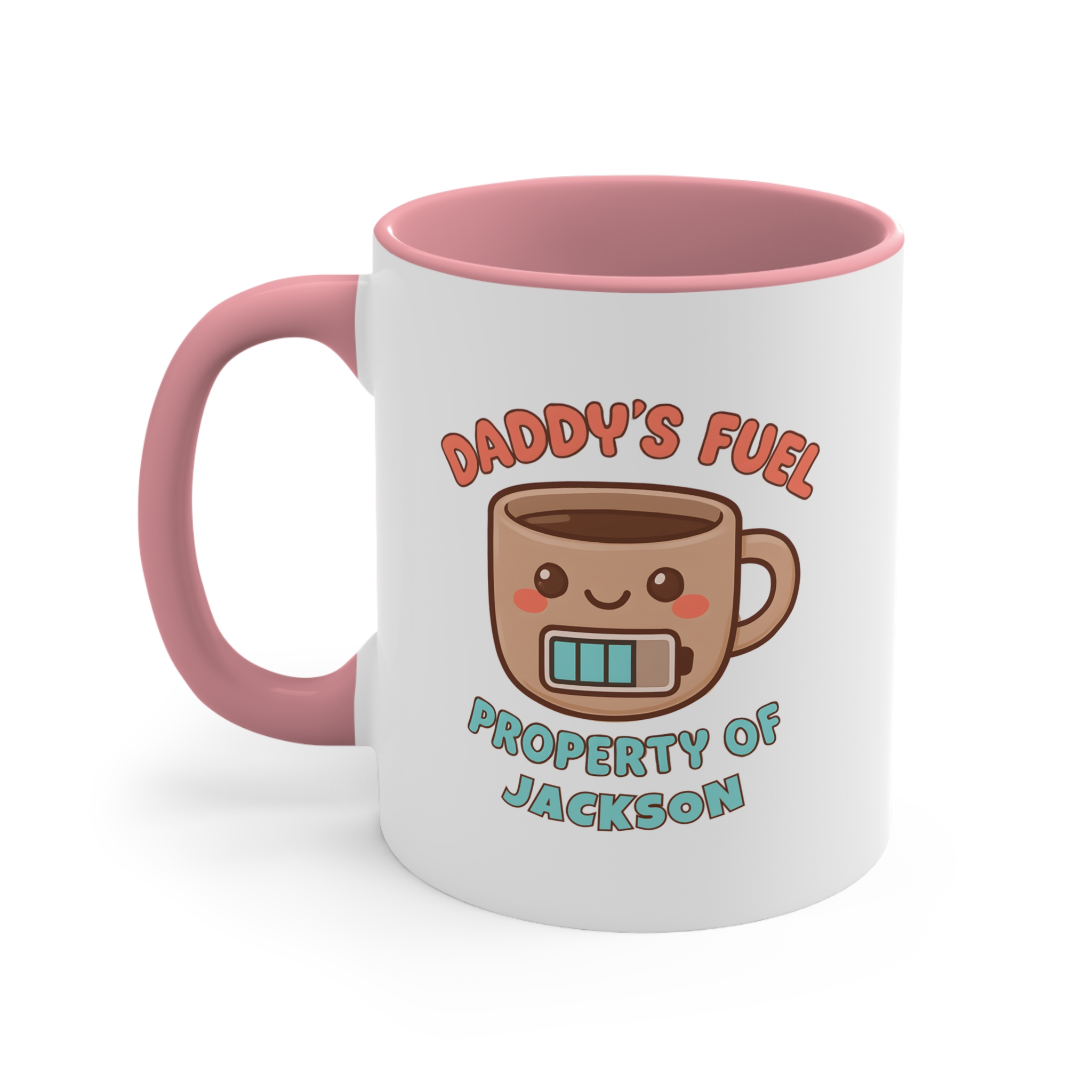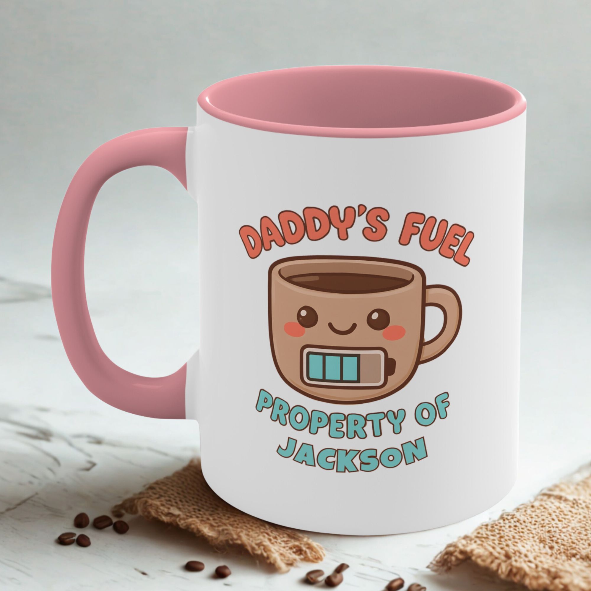 Make Dad smile every morning with this funny daddy mug featuring an adorable smiling coffee cup and a charging battery icon — because caffeine is Daddy’s fuel! Topped with the phrase “Daddy’s Fuel” and customised with “Property of [Child’s Name],” this pink-handled mug is as cute as it is funny. A perfect gift from little ones who know just how important Dad’s coffee really is.