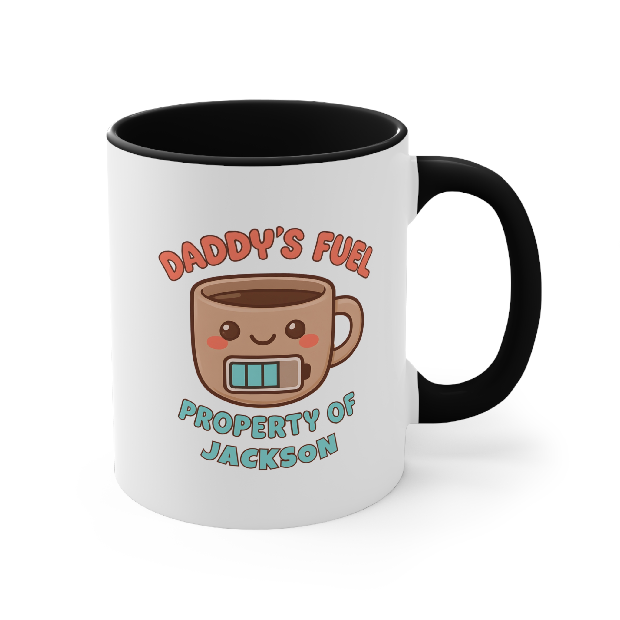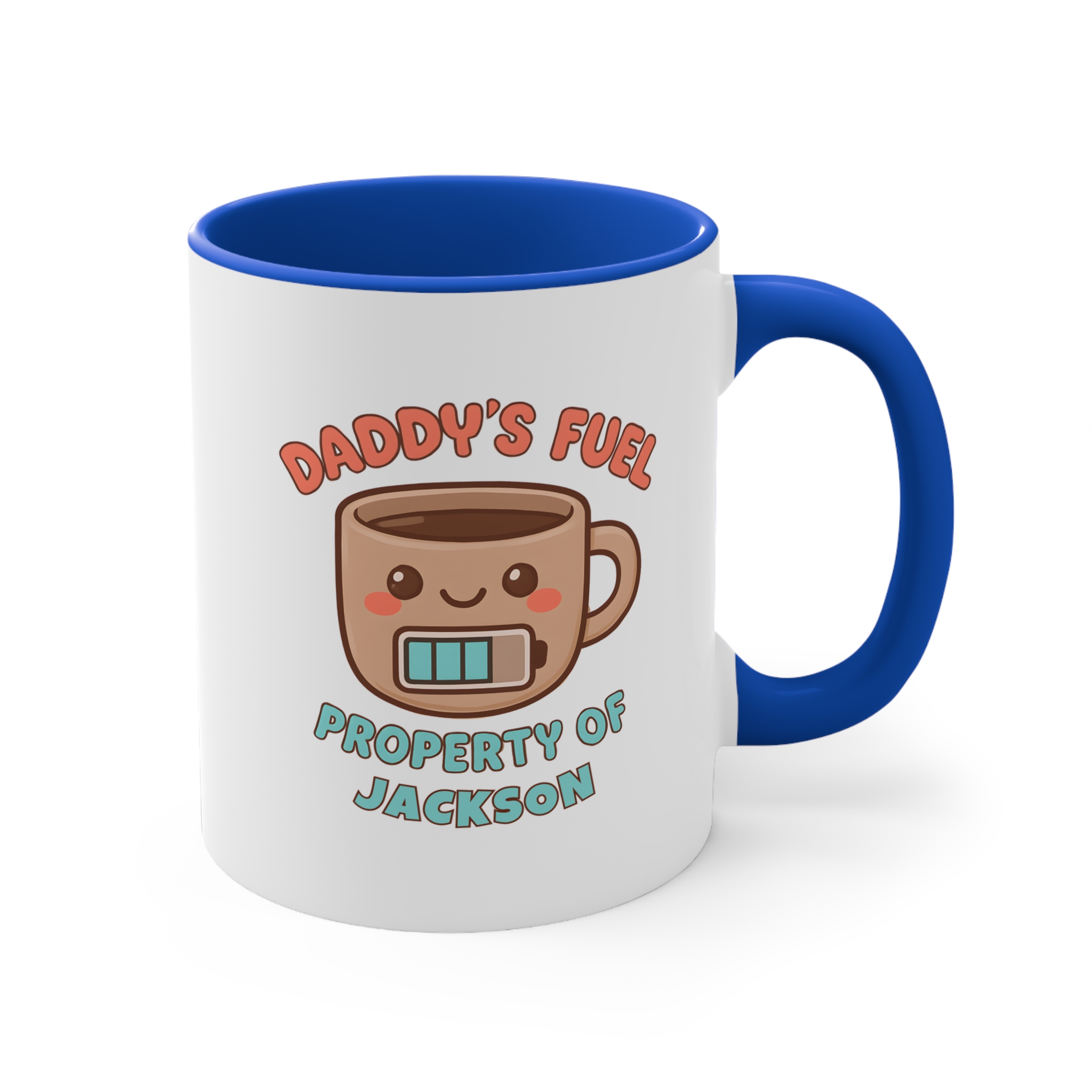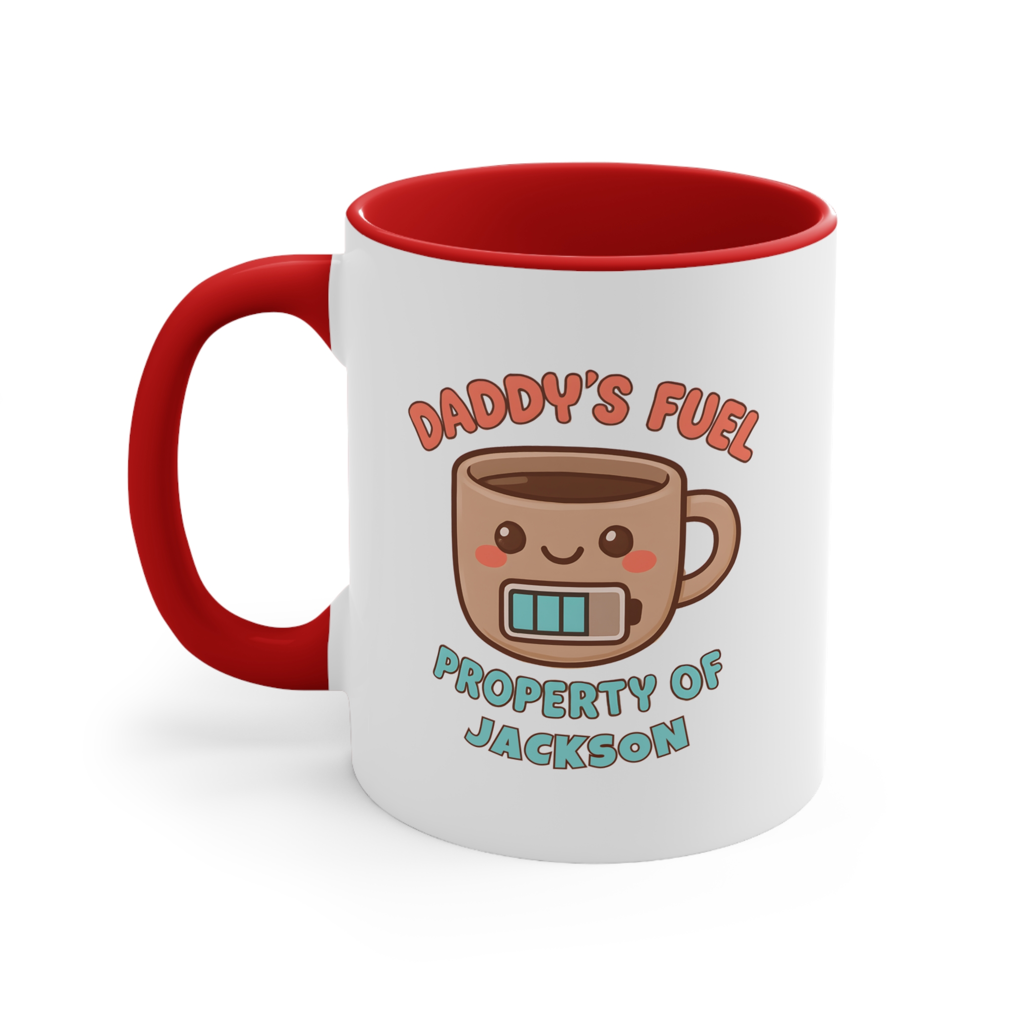Make Dad smile every morning with this funny daddy mug featuring an adorable smiling coffee cup and a charging battery icon — because caffeine is Daddy’s fuel! Topped with the phrase “Daddy’s Fuel” and customised with “Property of [Child’s Name],” this pink-handled mug is as cute as it is funny. A perfect gift from little ones who know just how important Dad’s coffee really is.