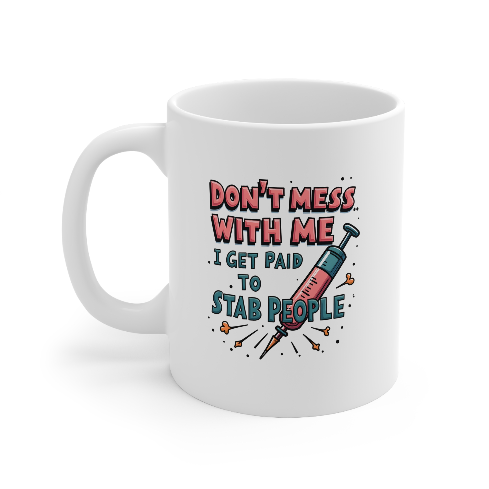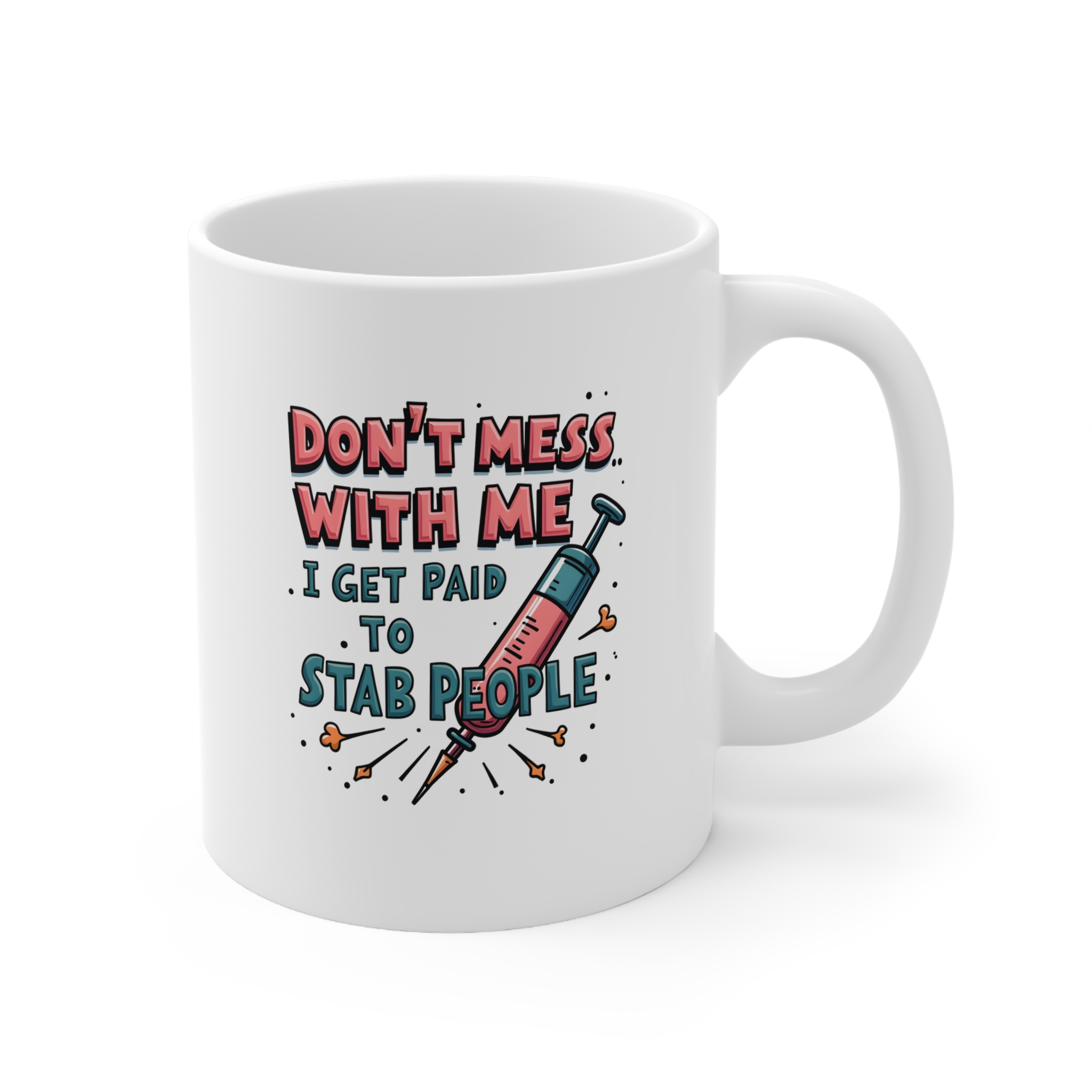 Bring bold humor to your morning routine with the “Don’t Mess With Me—I Get Paid to Stab People” Mug. Styled in a comic book-inspired font with punchy 3D flair, this design is paired with a cartoon-style syringe that adds playful edge to every sip. With pastel accents and a dose of sarcasm, it’s perfect for nurses who aren’t afraid to make a statement—one needle (or coffee) at a time.