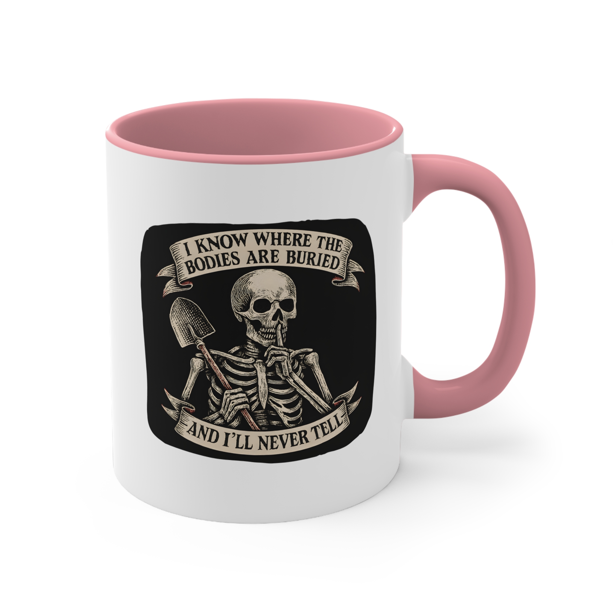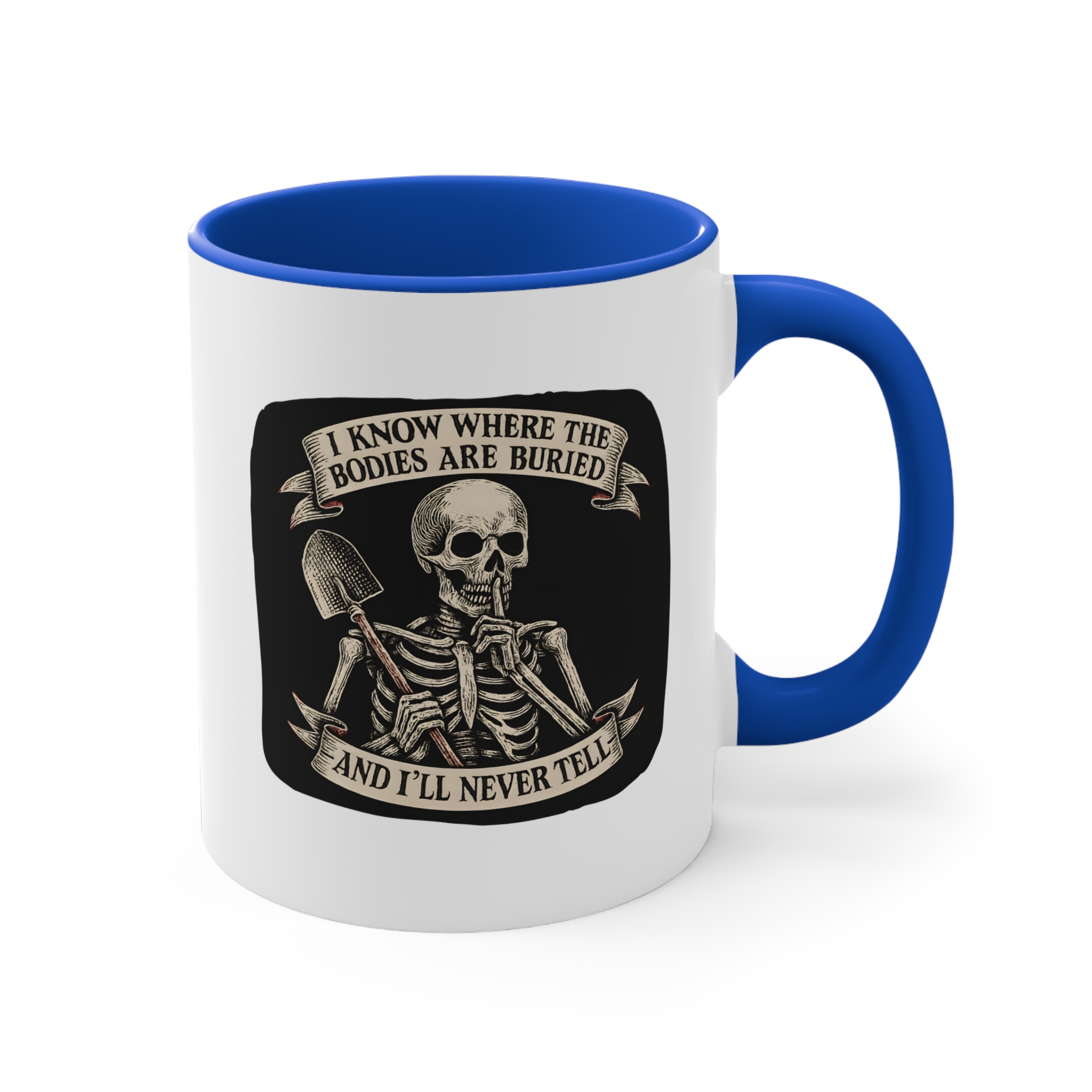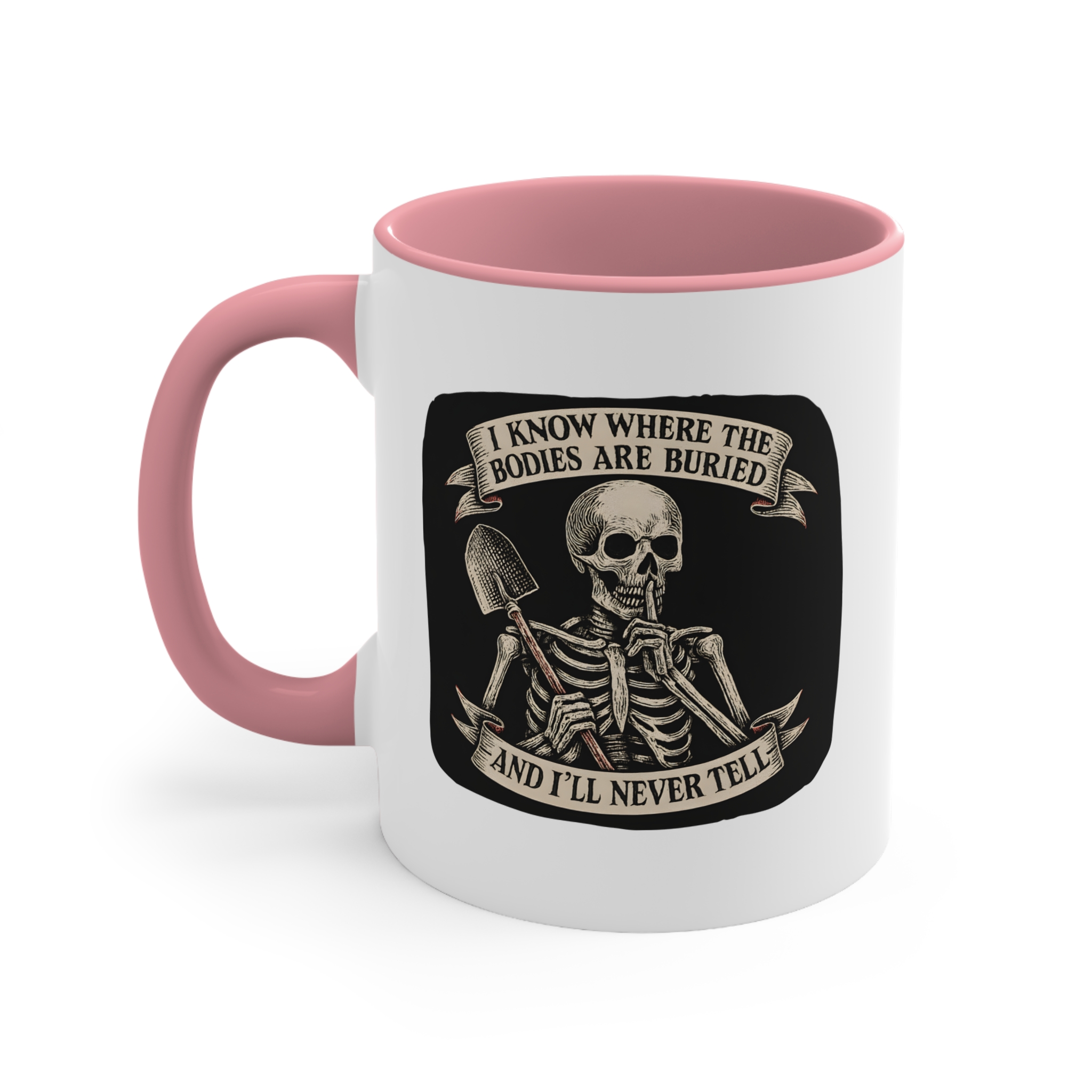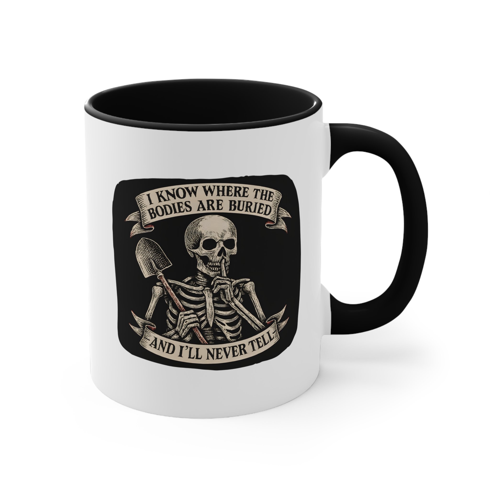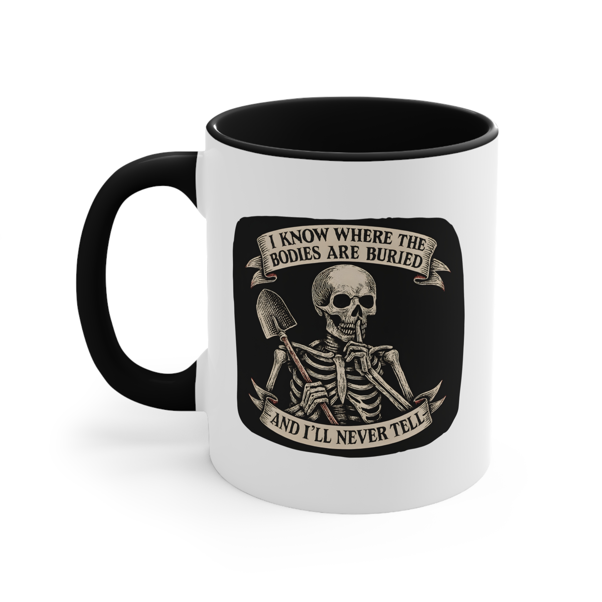 Got a dark sense of humor and loyalty that goes six feet deep? This funny skeleton mug has your name written all over it. Featuring a vintage-style skeleton holding a shovel and a finger to its lips, this mug screams, “Your secret’s safe with me… forever.”
