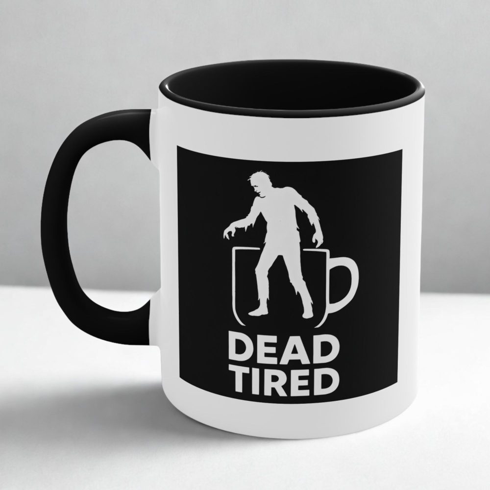 Funny zombie mug with “Dead Tired” design, 11oz ceramic, microwave safe, hand wash recommended, available in 4 accent colours.