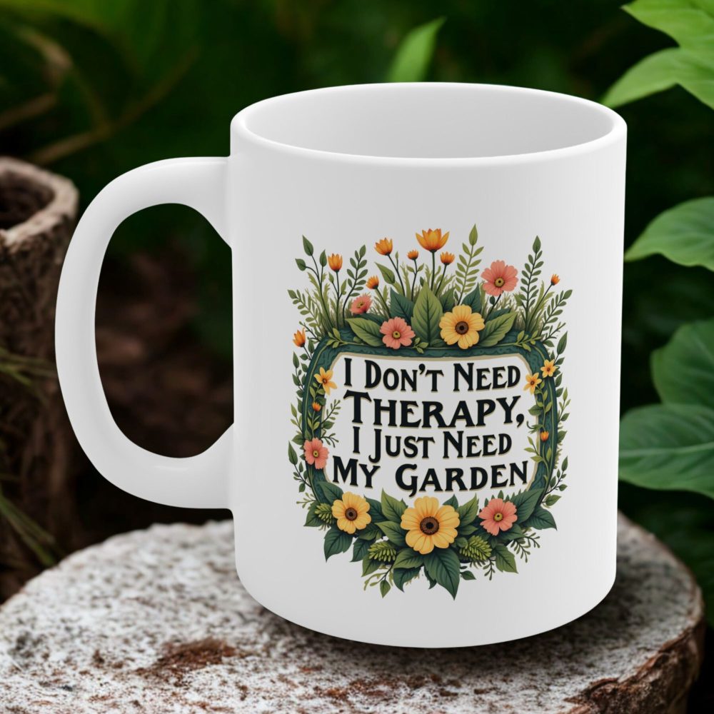 “I Don’t Need Therapy, I Just Need My Garden”—a striking floral mug with vintage typography and art nouveau charm for garden enthusiasts.
