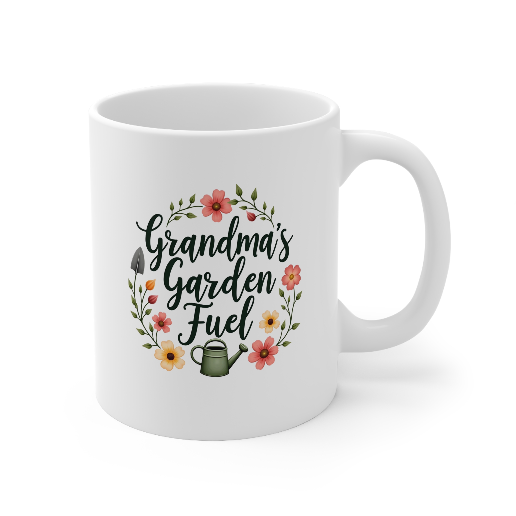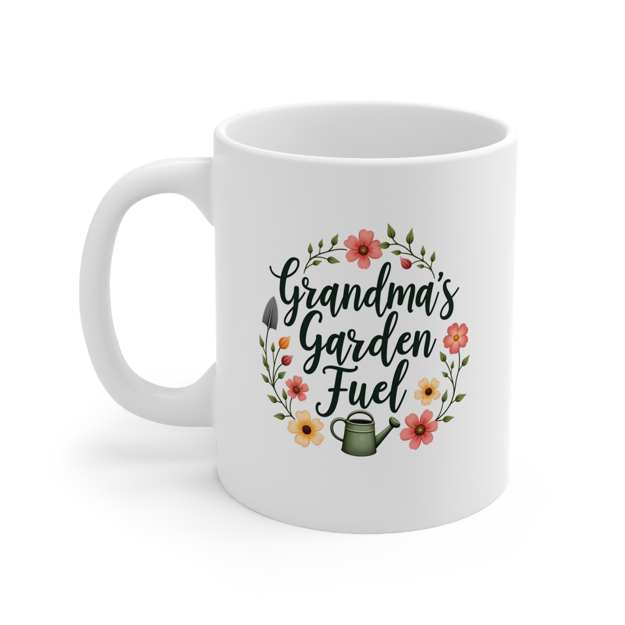 Every green thumb needs a little fuel. Our “Grandma’s Garden Fuel” Mug celebrates the joy of gardening and the warmth of a grandmother’s love. Featuring elegant, flowing cursive typography at the center, the design is surrounded by a charming mix of blooming flowers, curling vines, and tiny gardening tools—including a trowel and a watering can—all illustrated in a soft, nature-inspired style. With pastel greens, gentle pinks, and warm yellows, the design evokes the cozy, content feeling of mornings spent tending to the garden, cup in hand.