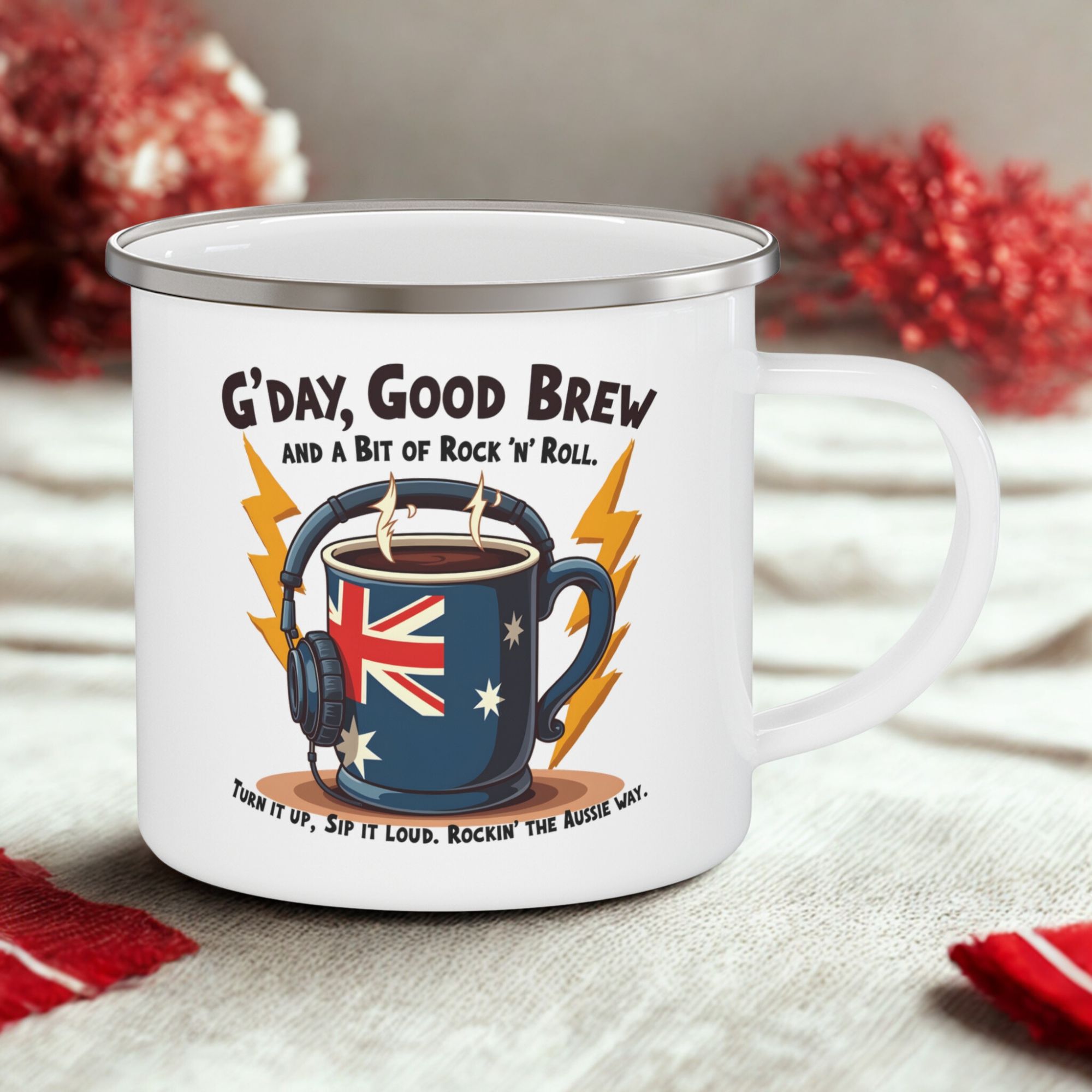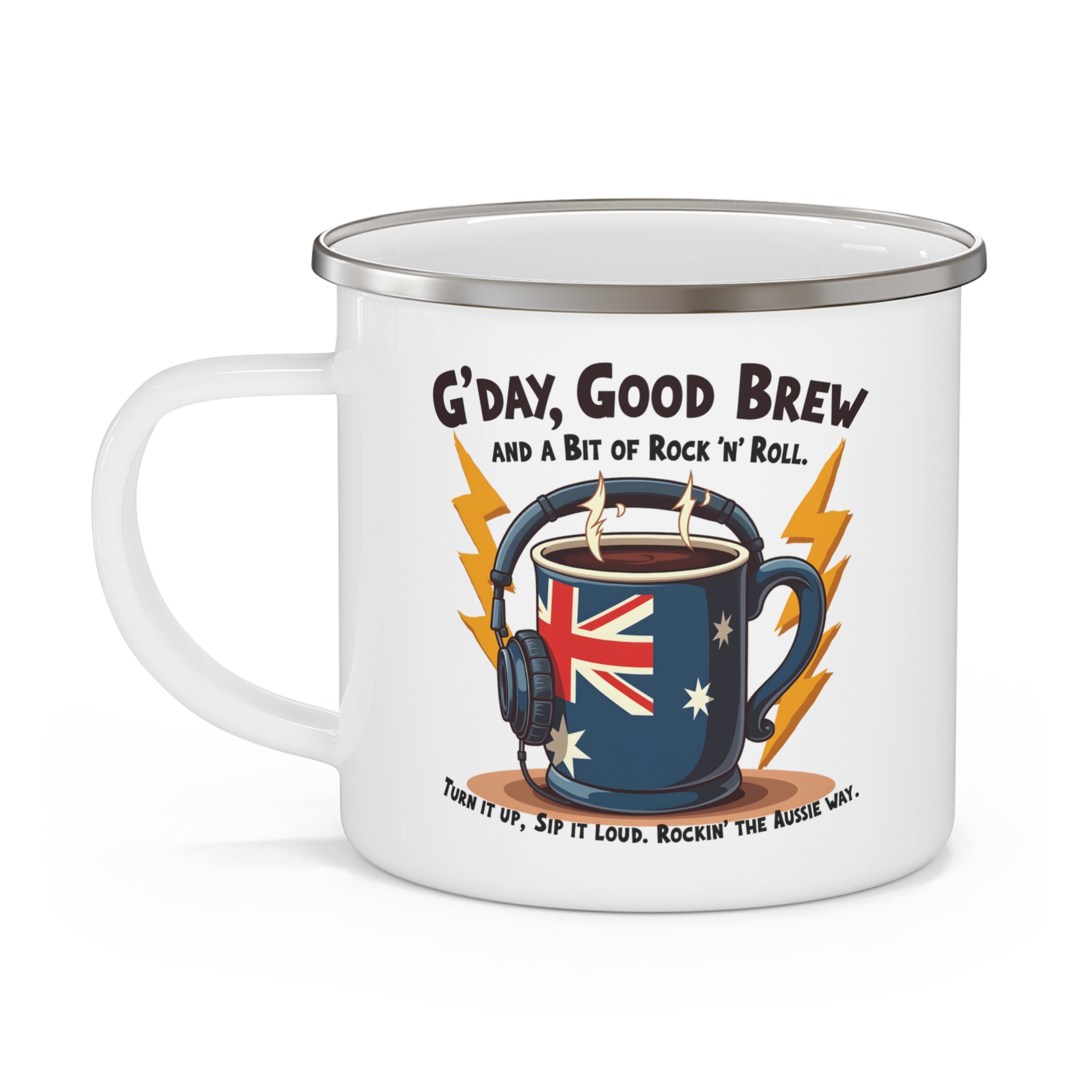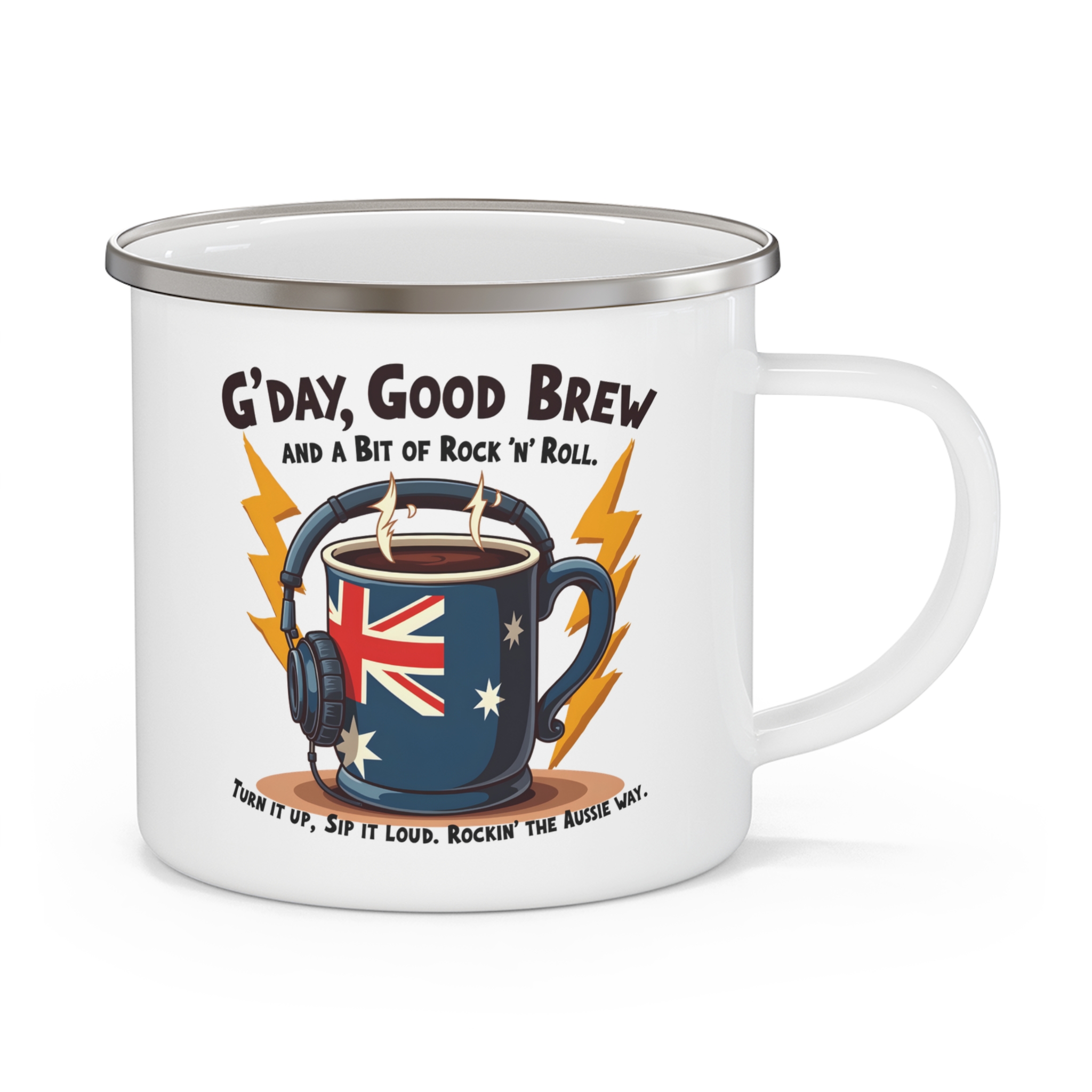 Start your day the Aussie way with this gday coffee mug. Featuring the bold phrase “G’Day, Good Brew and a Bit of Rock ’n’ Roll,” this enamel camping mug blends classic Australian slang with coffee culture and a fun rock-inspired design.