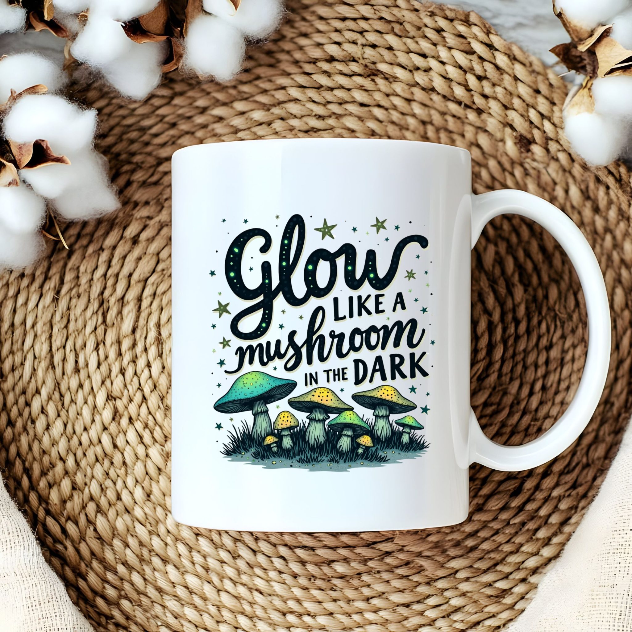Shine bright with our “Glow Like a Mushroom in the Dark” mug! Featuring a glowing mushroom design, this fun and whimsical mug is perfect for those who love a little magic with their coffee. The glowing graphics make this mug extra special, lighting up your space in the dark for a unique twist on your morning routine. Made from durable white ceramic with a glossy finish, it’s not just about looks—it’s functional, too. The C-shaped handle makes it easy to hold, and it’s lead and BPA-free, ensuring a safe sip every time.