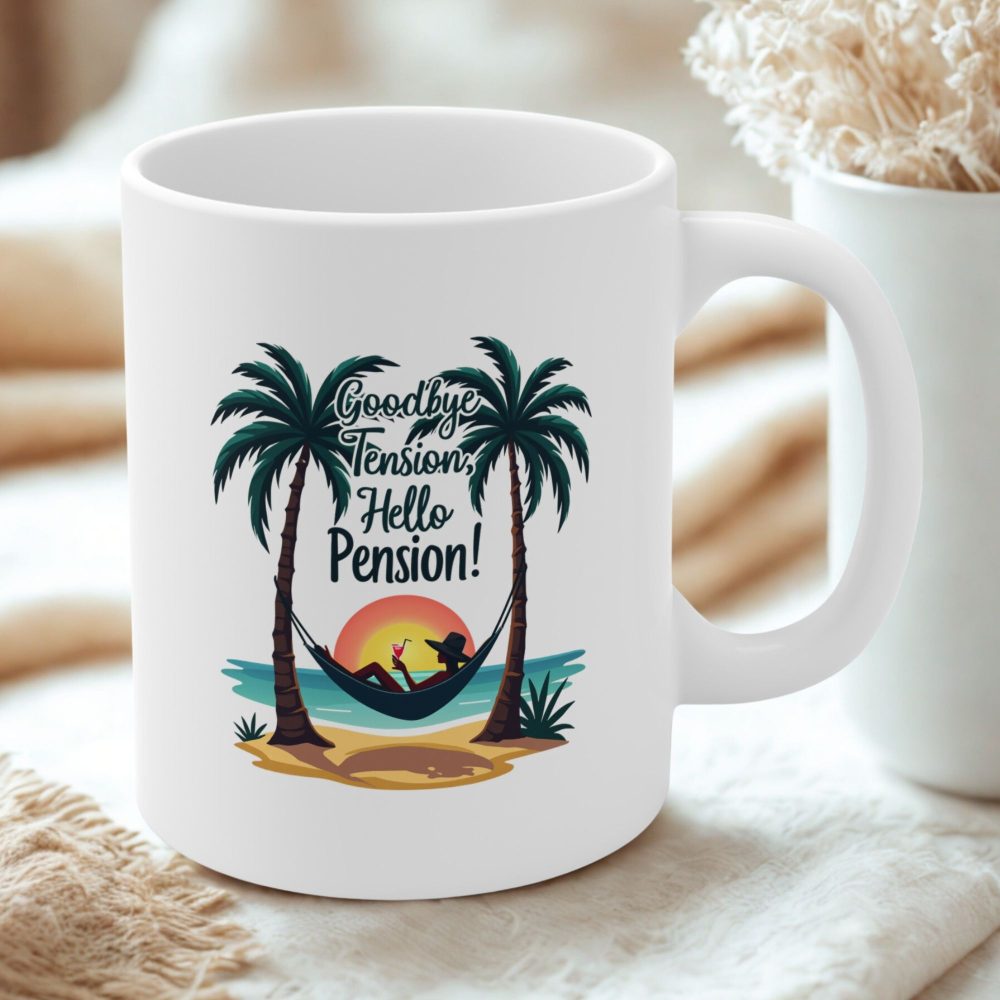 Funny Retirement Gift mug, Celebrate retirement with the “Goodbye Tension, Hello Pension” mug! A fun and thoughtful 11oz ceramic cup for those enjoying a stress-free life.