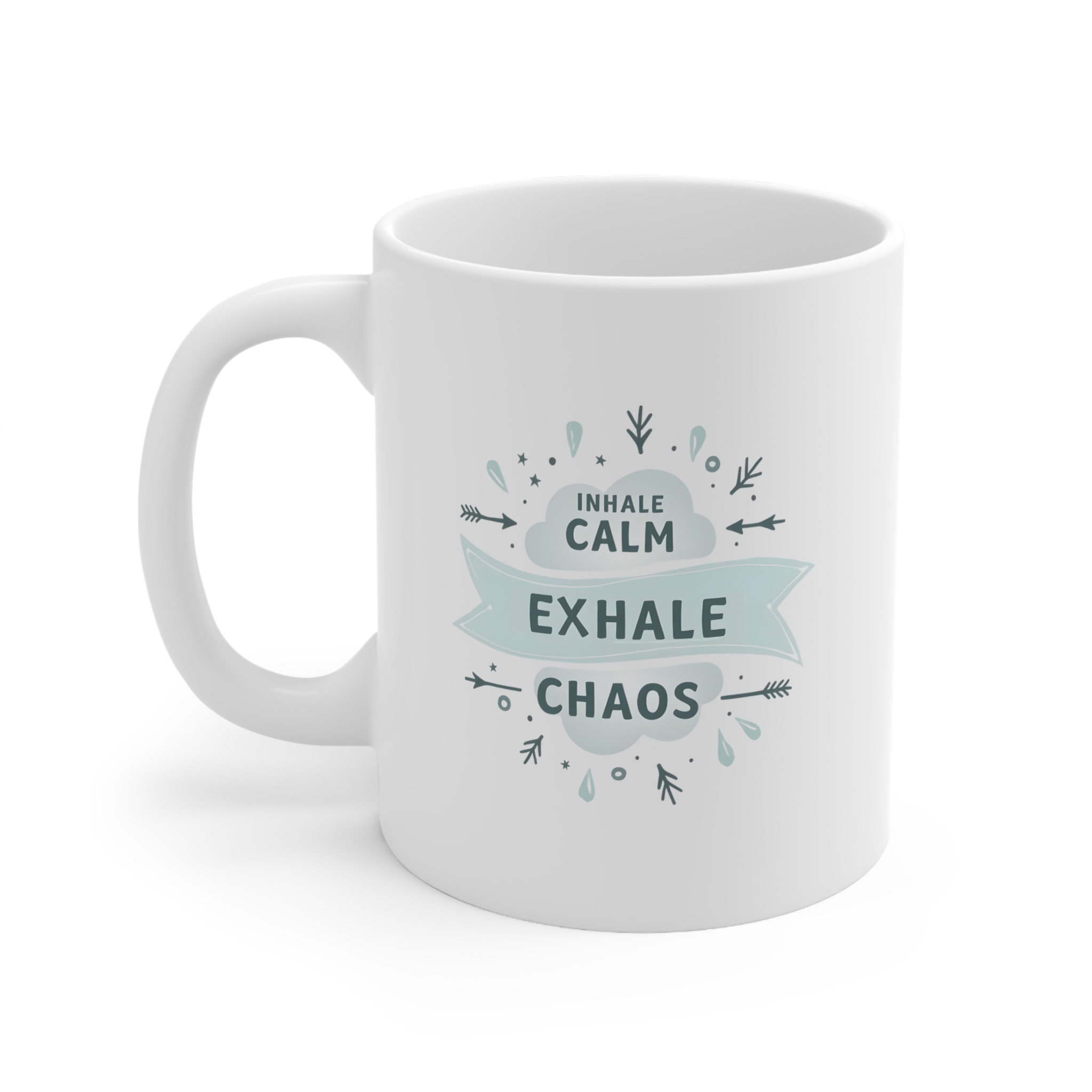 Mindful breathwork mug with flowing arrows, cloud art, and “Inhale Calm, Exhale Chaos” quote—your daily pause in ceramic form.