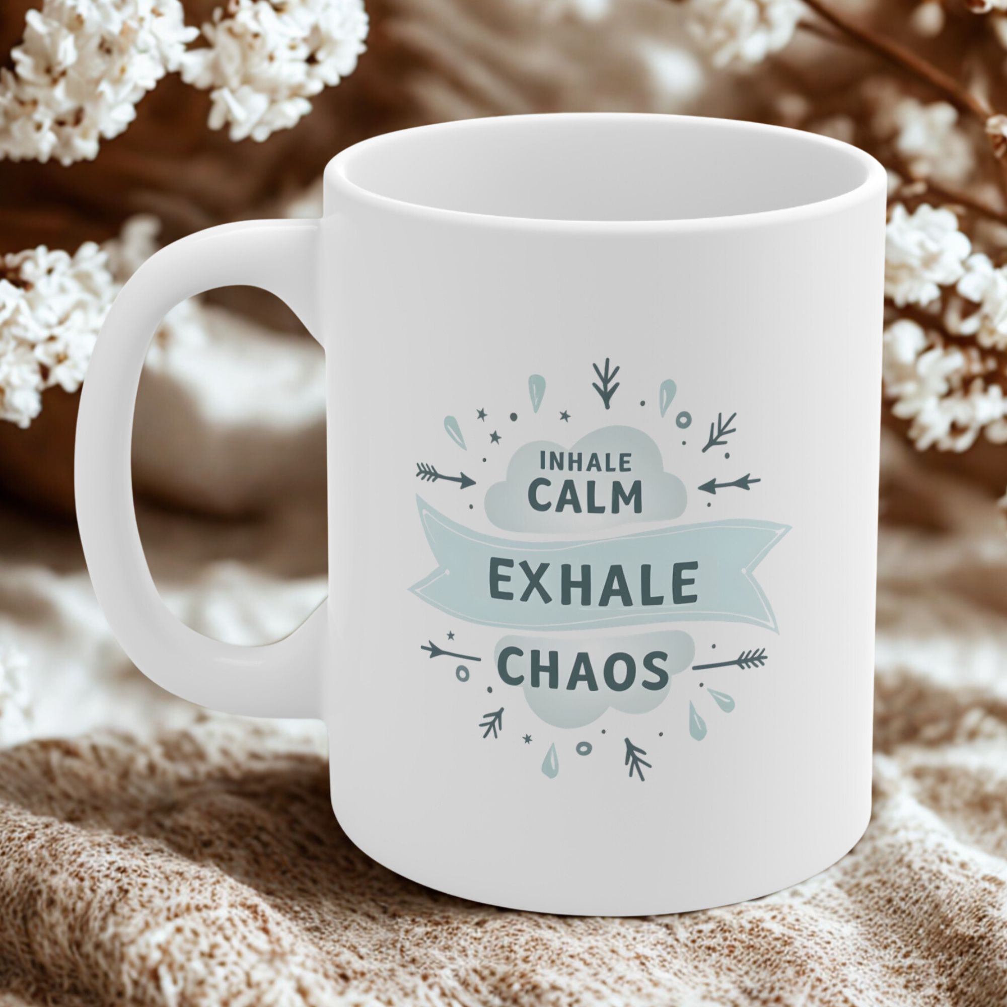 This inhale calm exhale chaos mug delivers more than warmth—it offers a gentle, visual reset every time you pick it up.