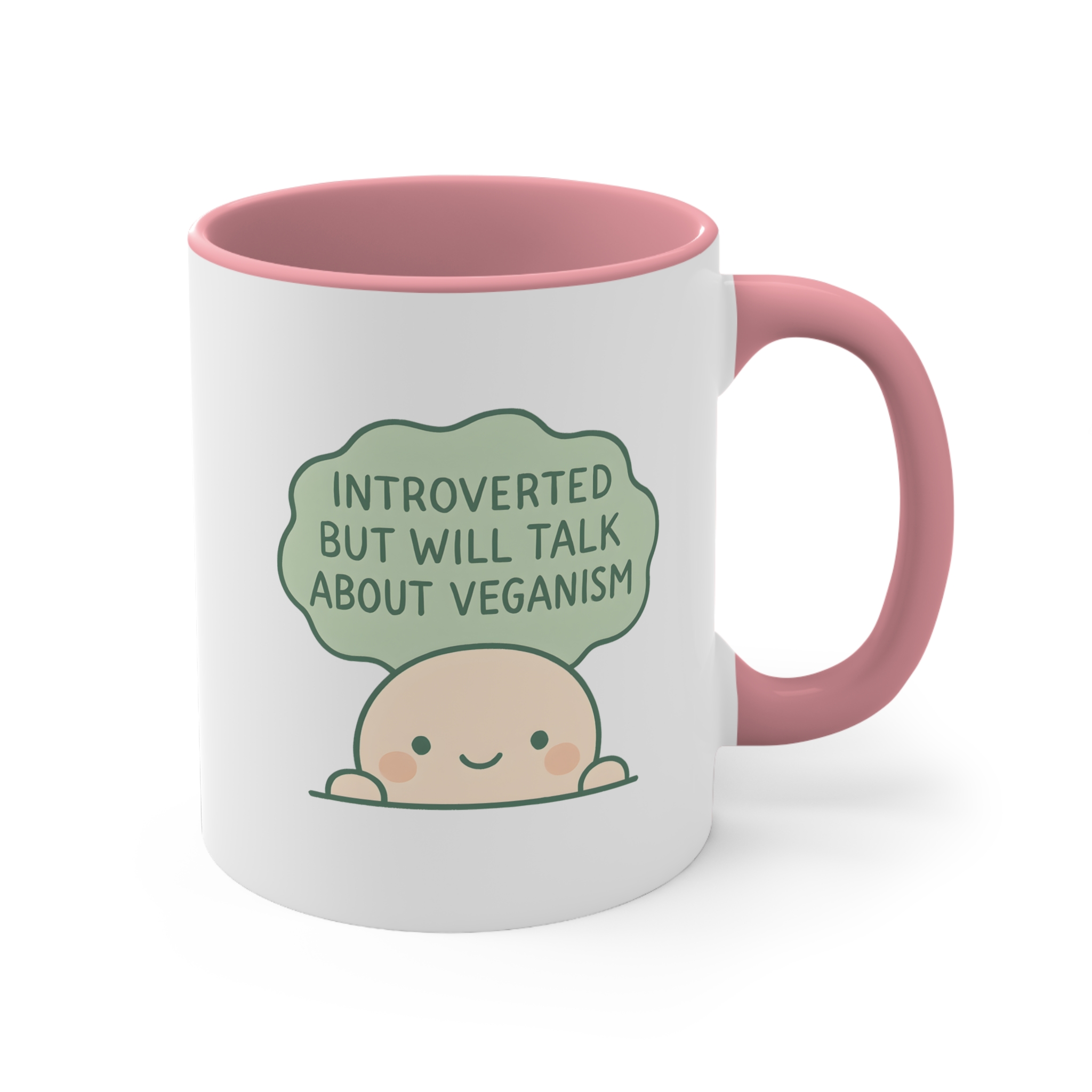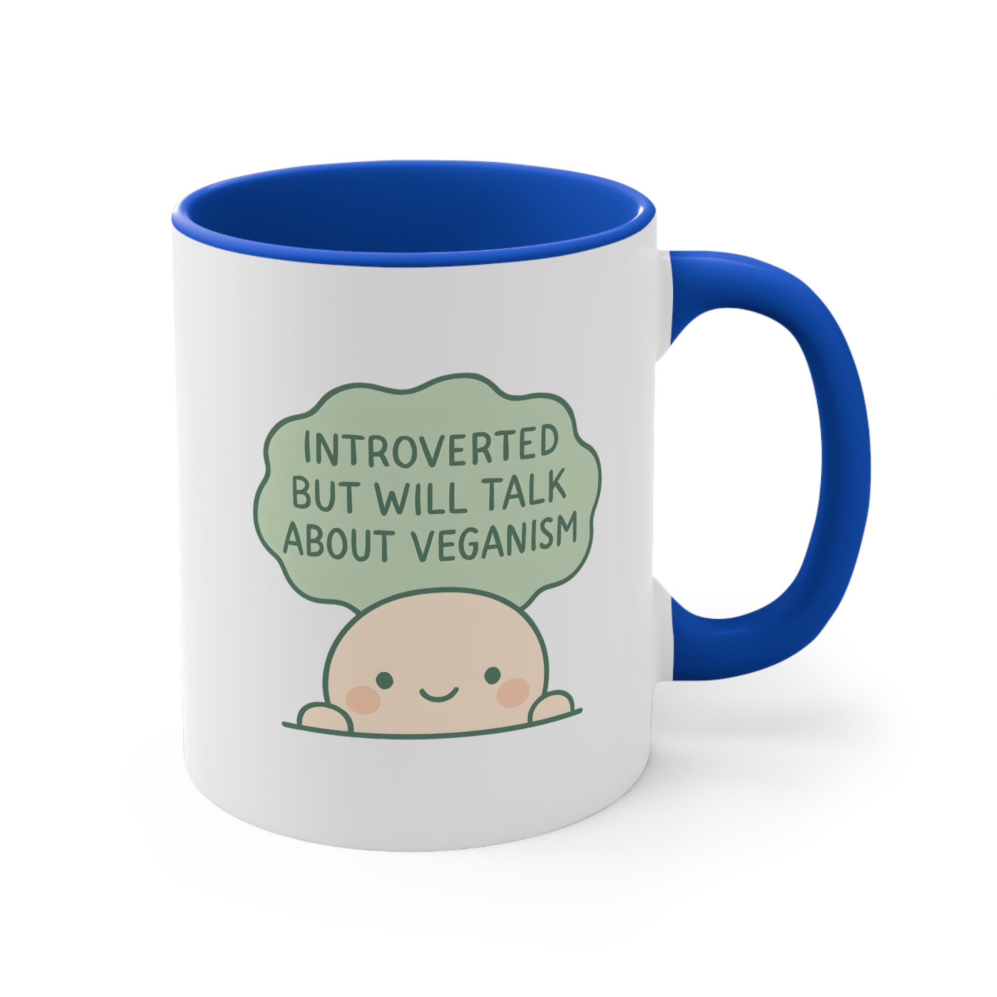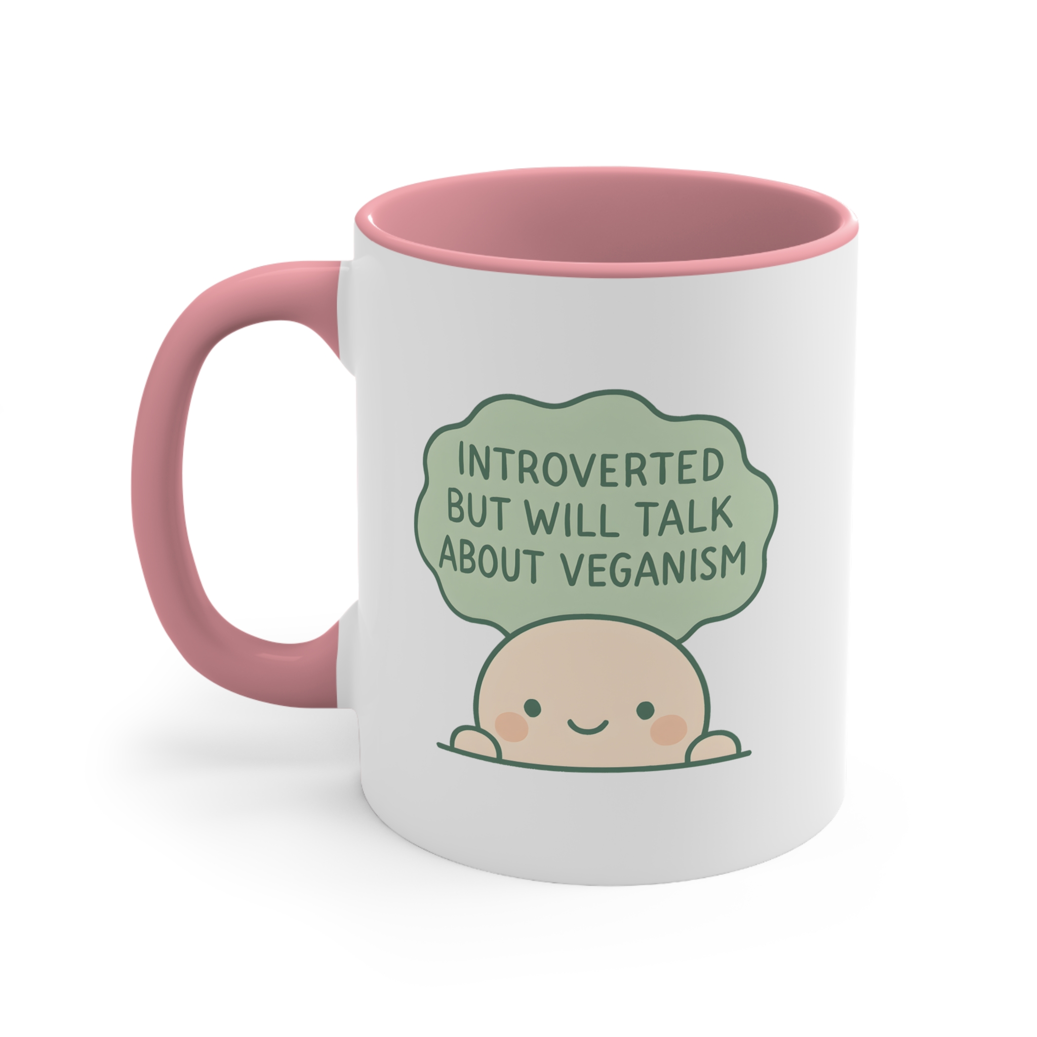 This introvert vegan mug perfectly sums up that quiet energy — until someone mentions animals or tofu. Featuring a blushing cartoon character with the quote: