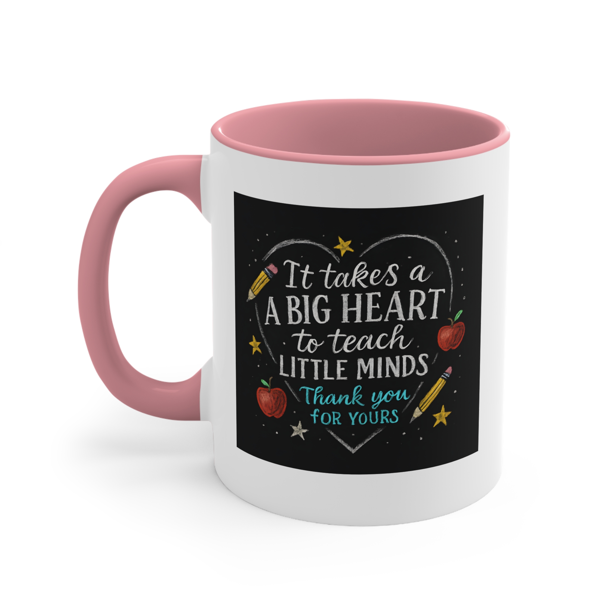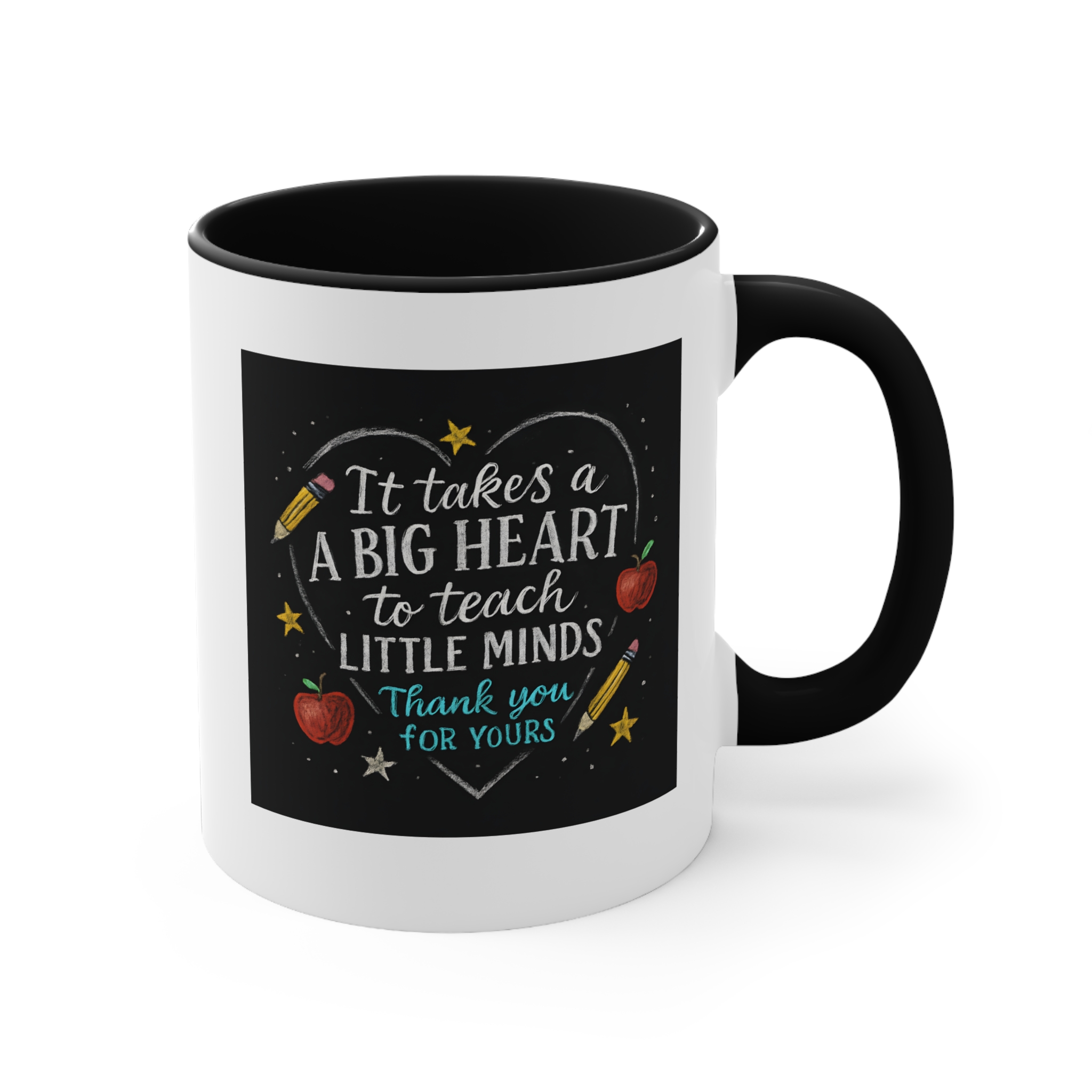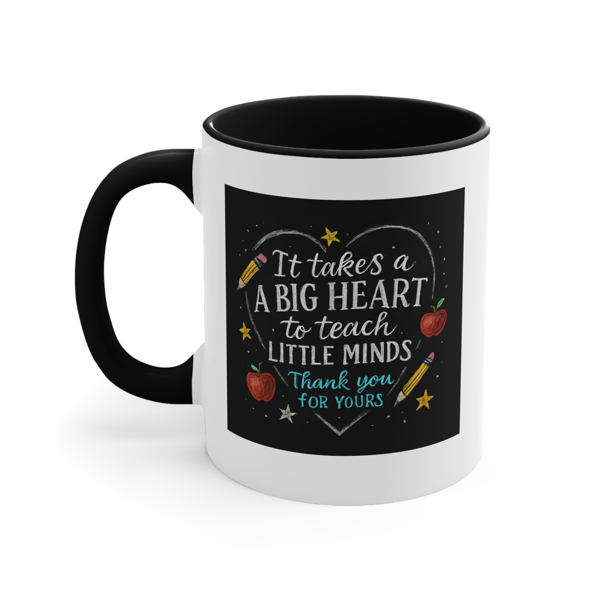 The It takes a big heart to teach little minds mug is a heartfelt tribute to the teachers who shape our future. Featuring a hand-drawn chalkboard design with stars, apples, and pencils surrounding the quote, it captures the warmth and dedication that define every great educator.