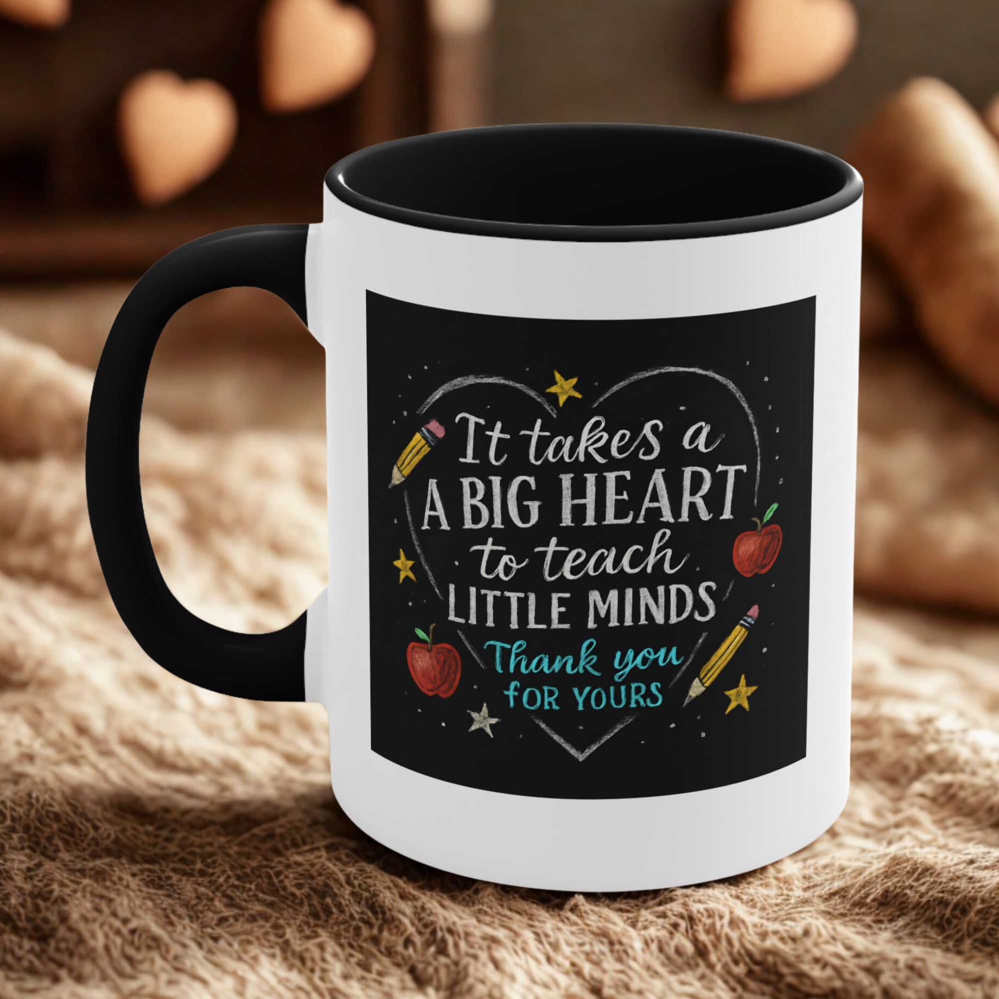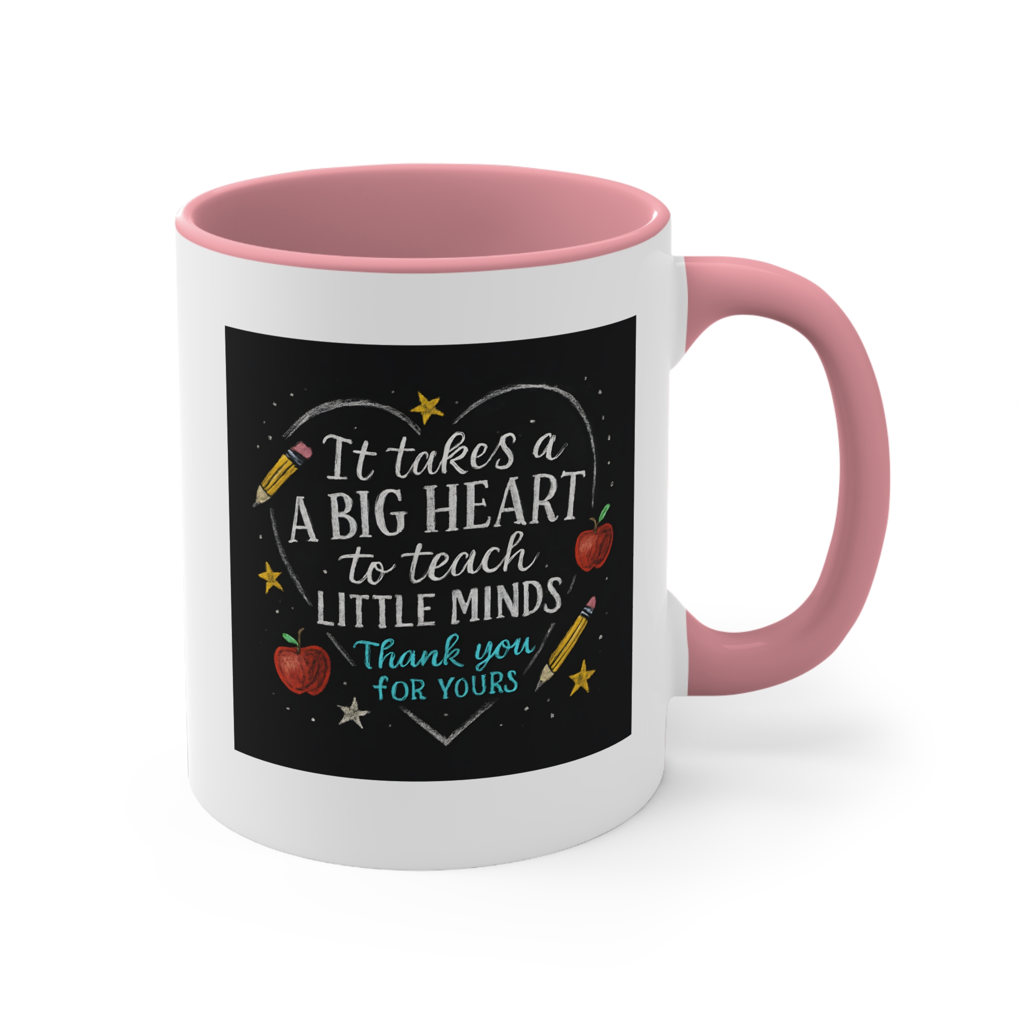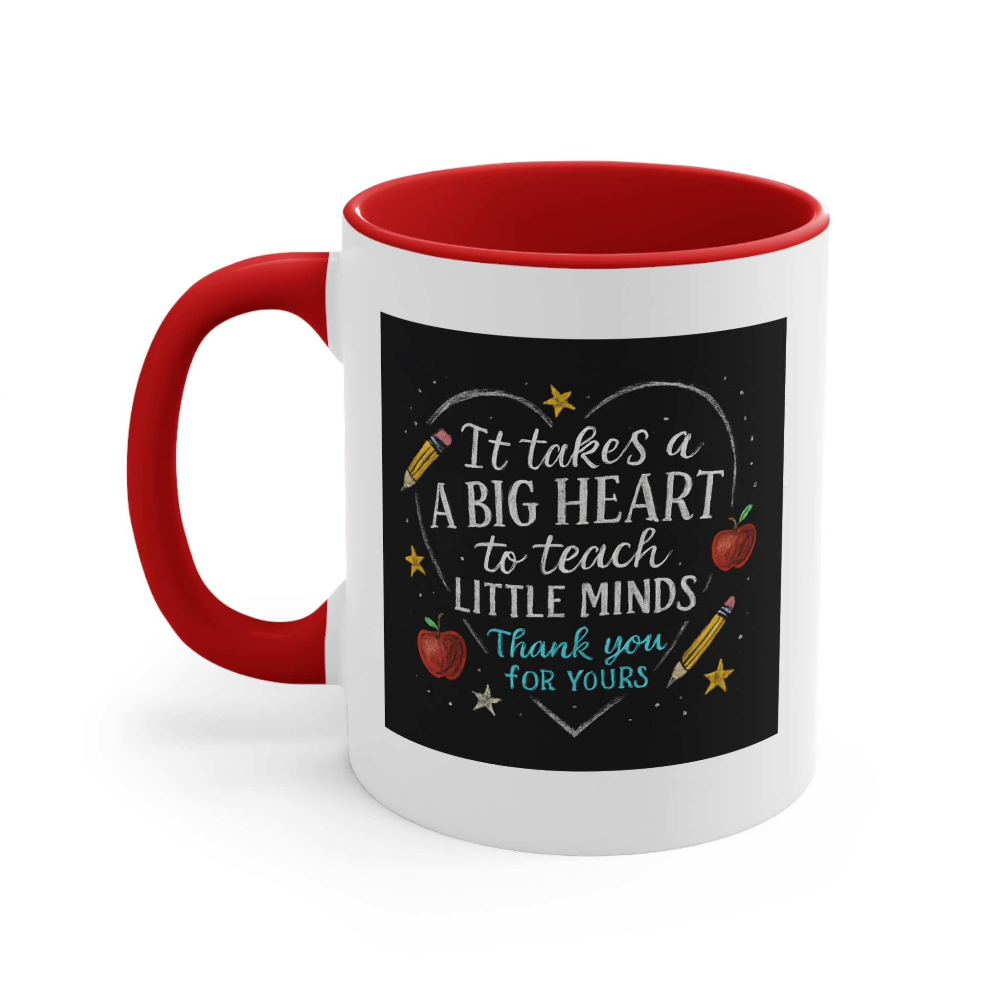The It takes a big heart to teach little minds mug is a heartfelt tribute to the teachers who shape our future. Featuring a hand-drawn chalkboard design with stars, apples, and pencils surrounding the quote, it captures the warmth and dedication that define every great educator.