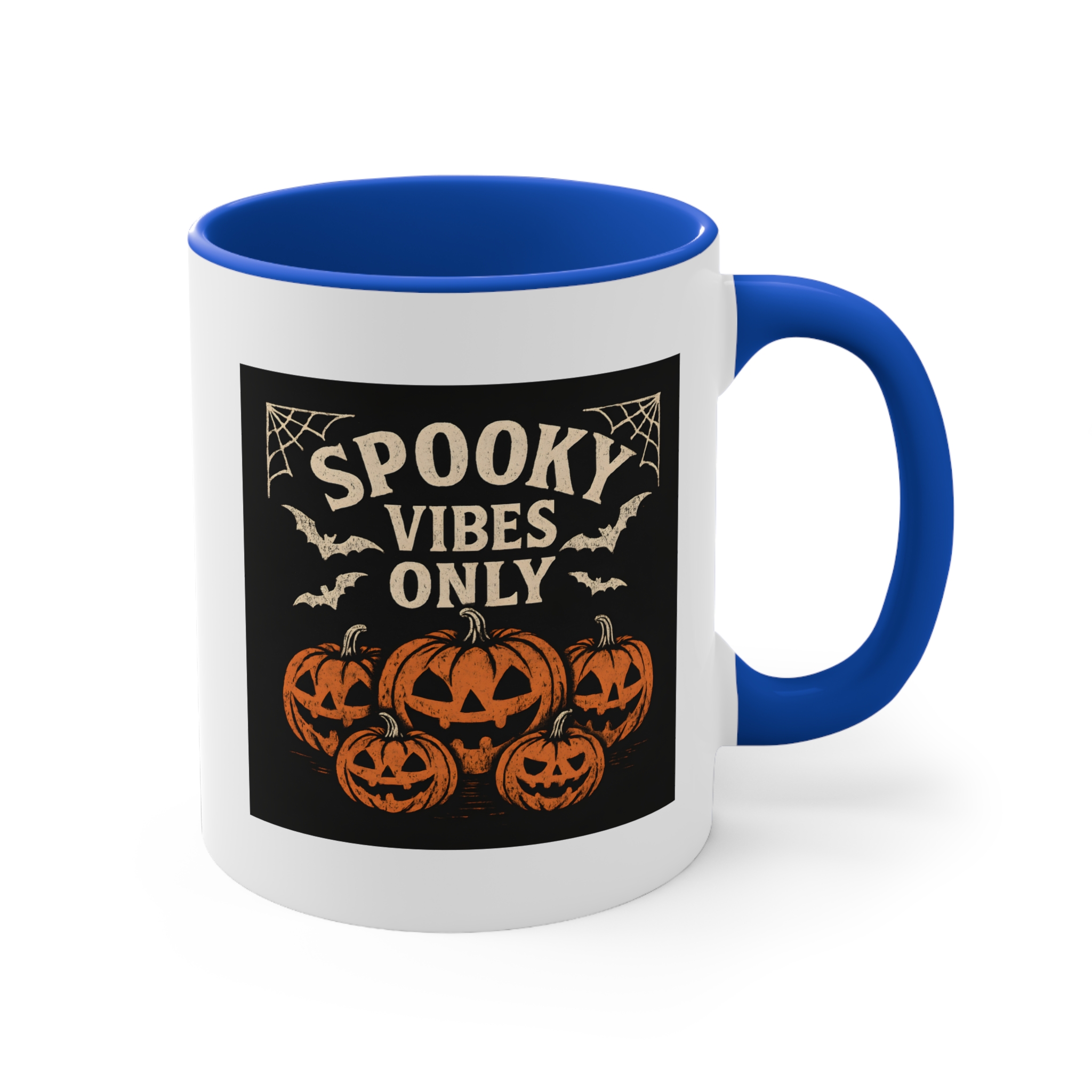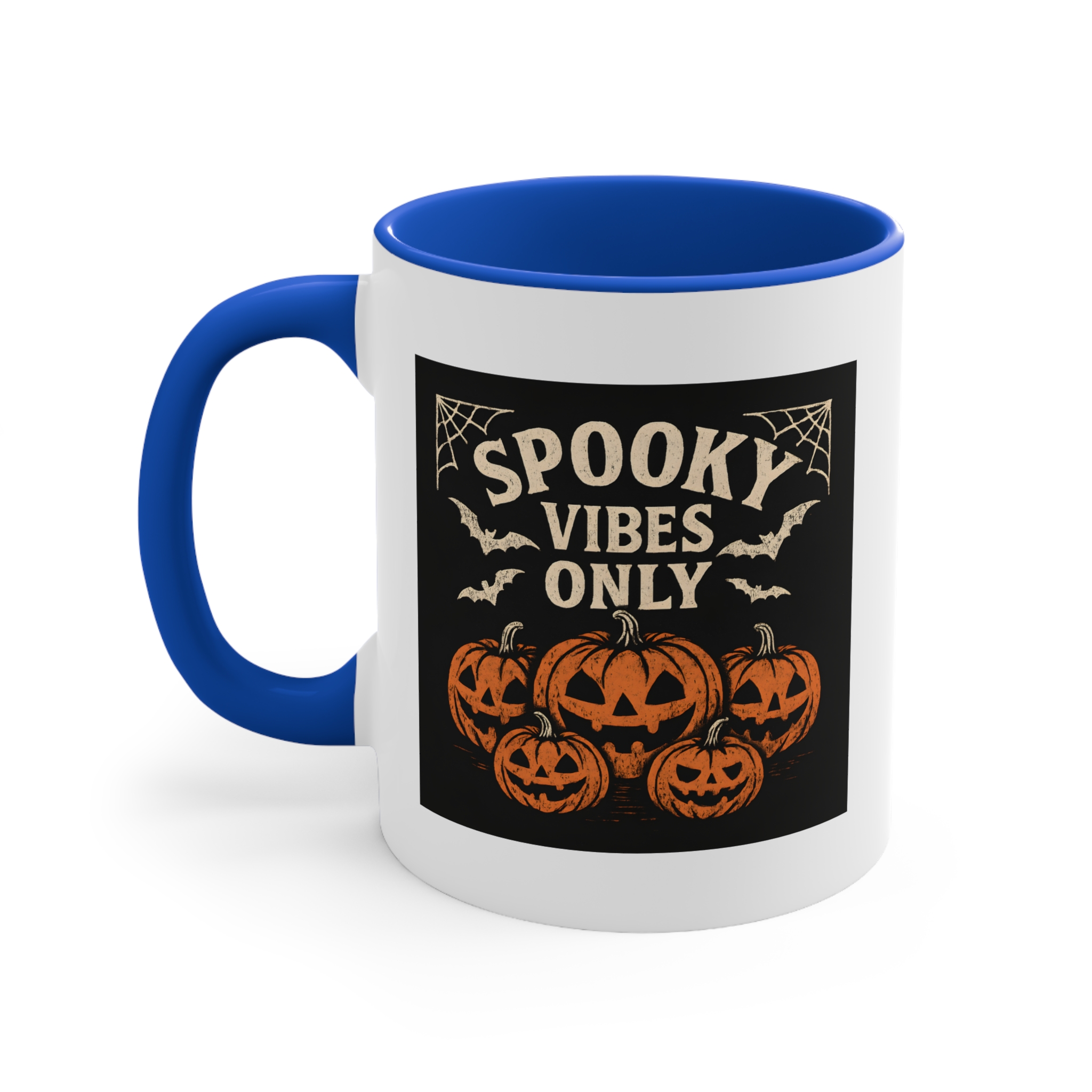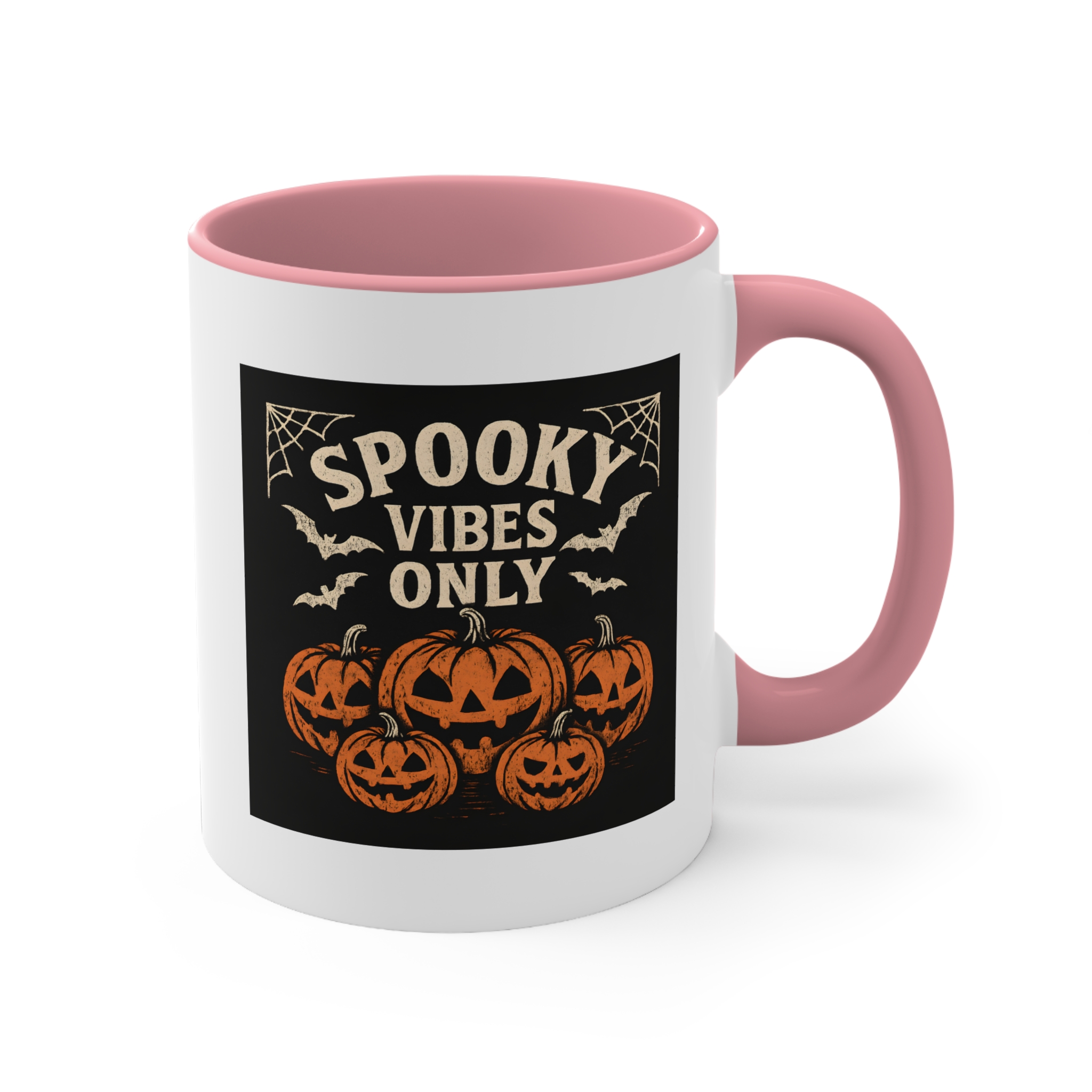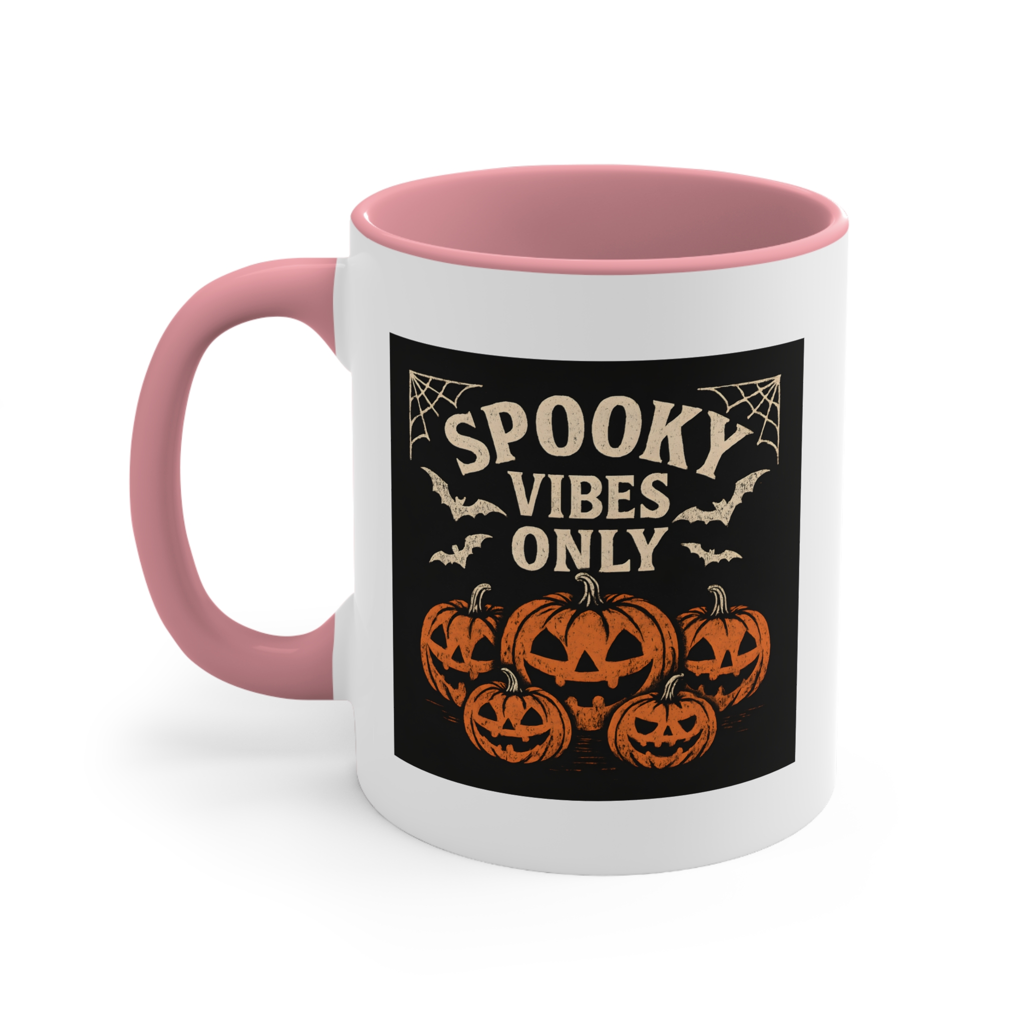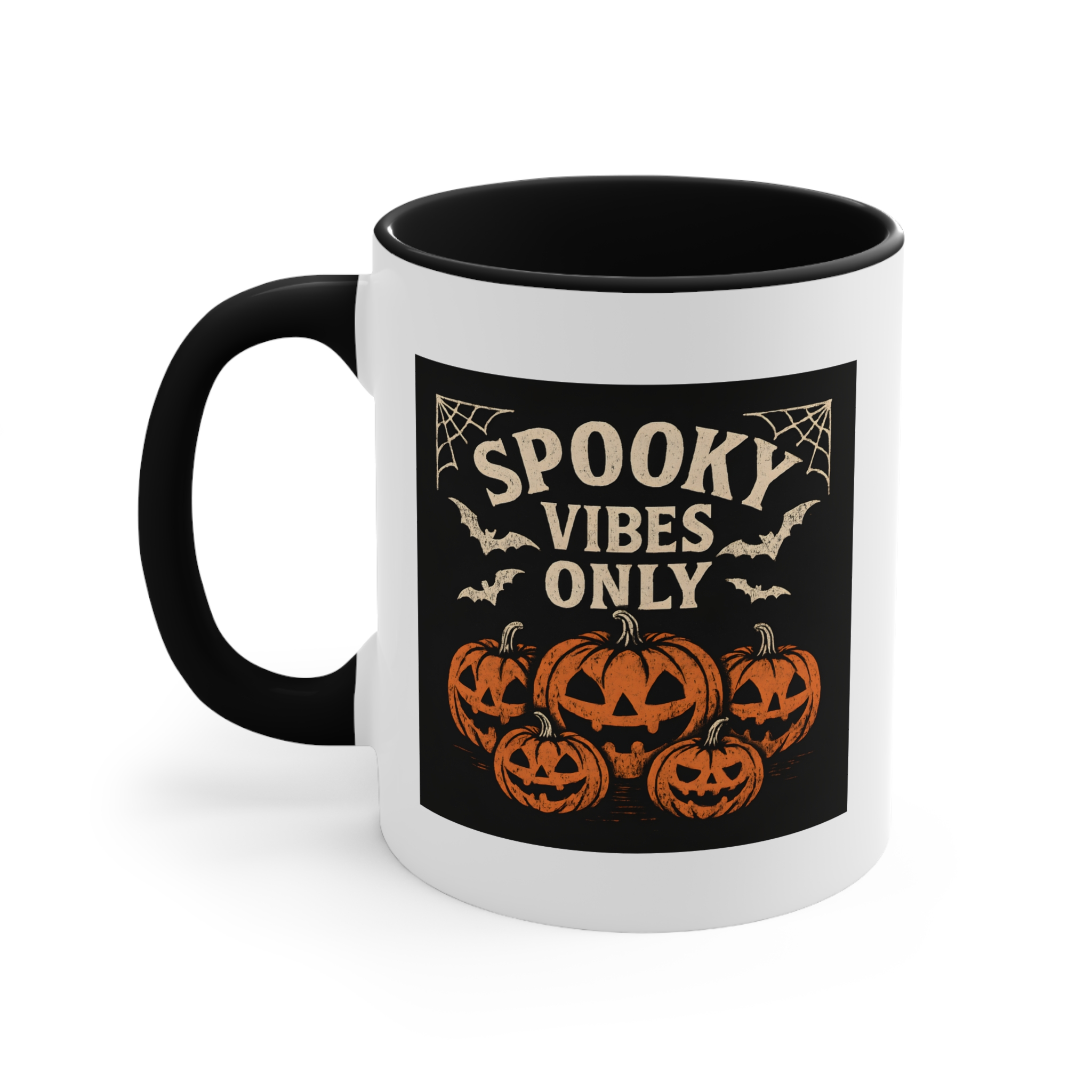 Bring the Halloween spirit to your morning brew with this jack o’lantern mug! Featuring a spooky lineup of carved pumpkins, bats, and spider webs with the phrase “Spooky Vibes Only”, this mug is perfect for anyone who loves the eerie charm of October nights.