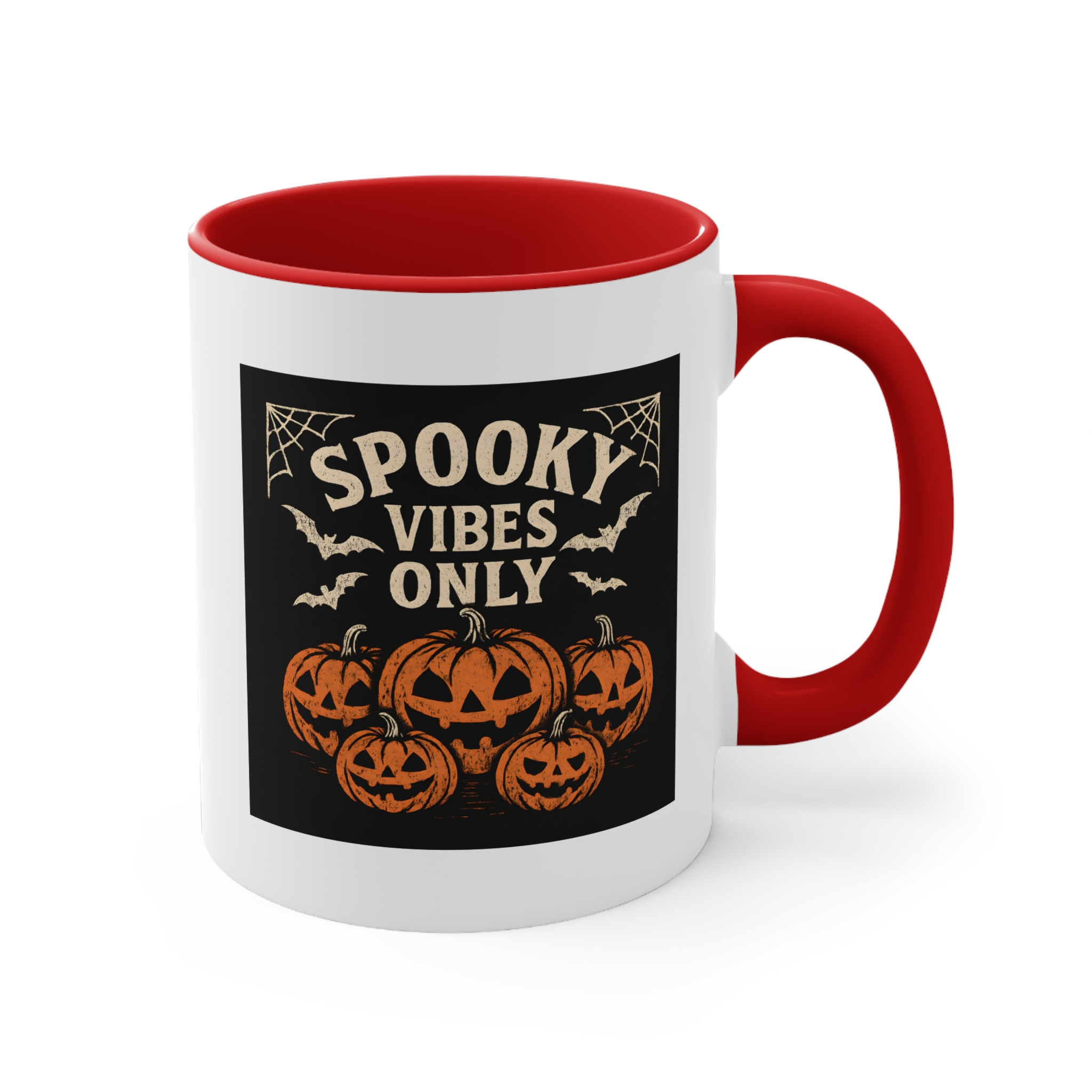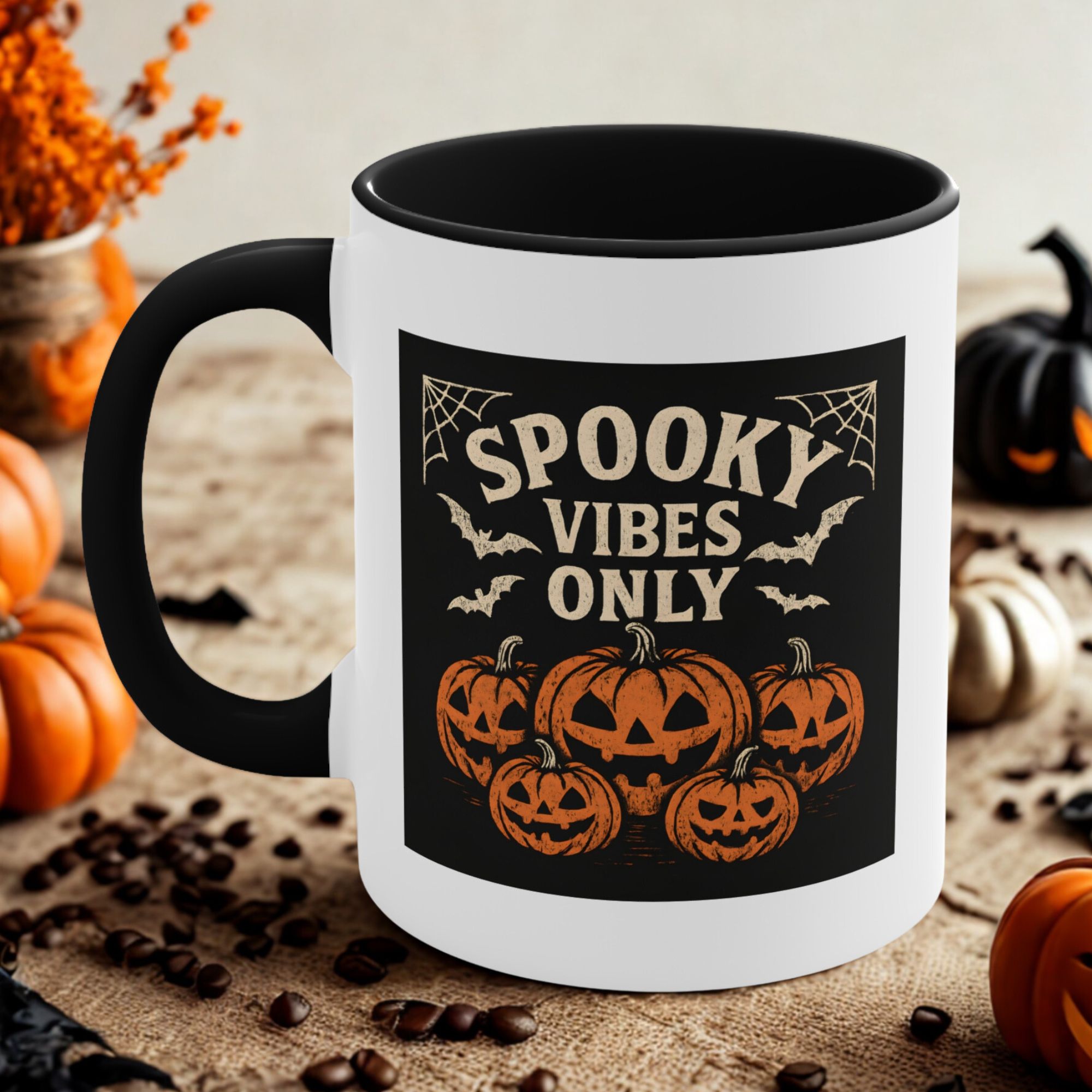 Jack o’ lantern mug with “Spooky Vibes Only” design. 11oz ceramic coffee cup, dishwasher- and microwave-safe — perfect for Halloween lovers and pumpkin fans.