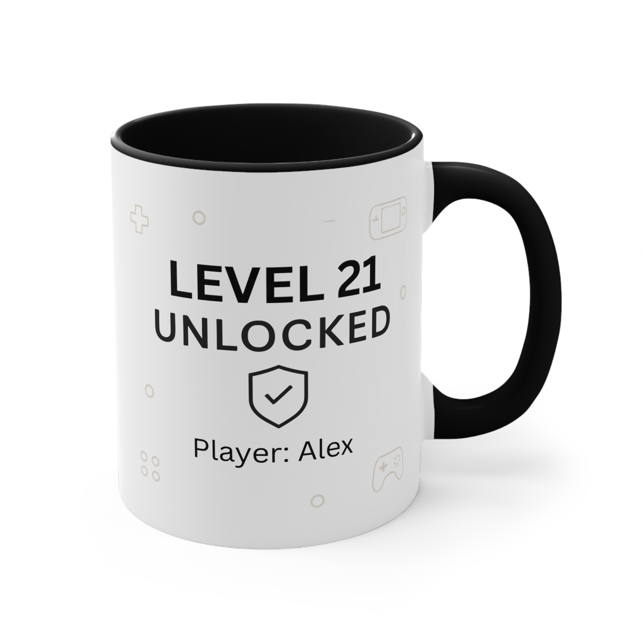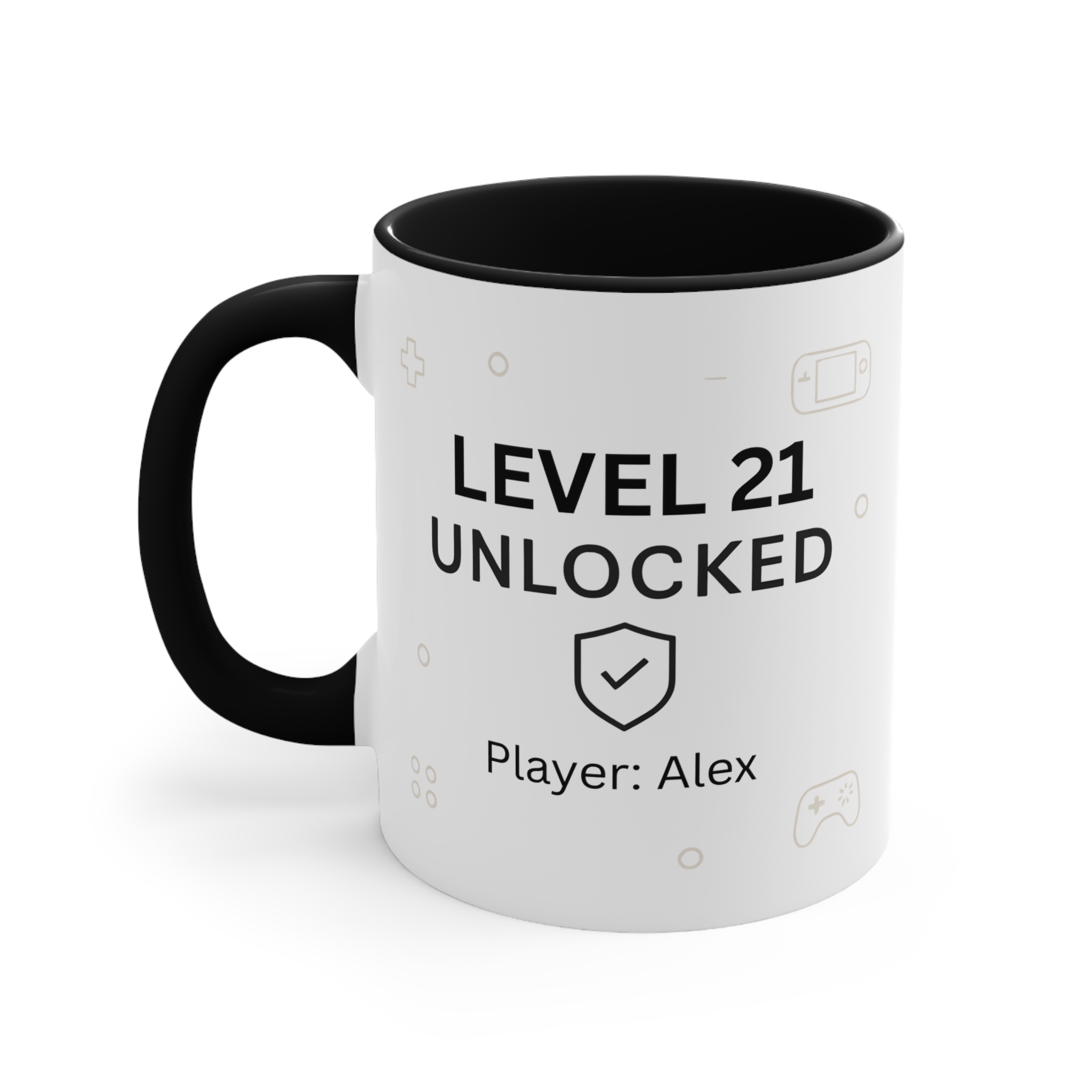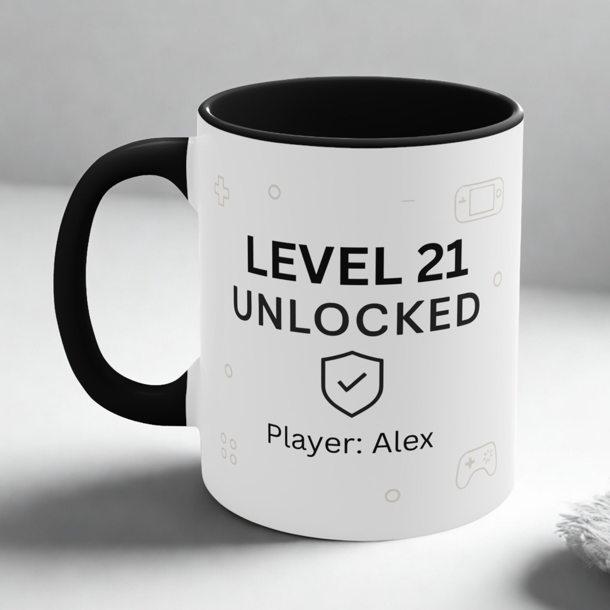 Personalised level 21 unlocked birthday mug. 11oz ceramic 21st birthday gamer coffee mug with custom name.