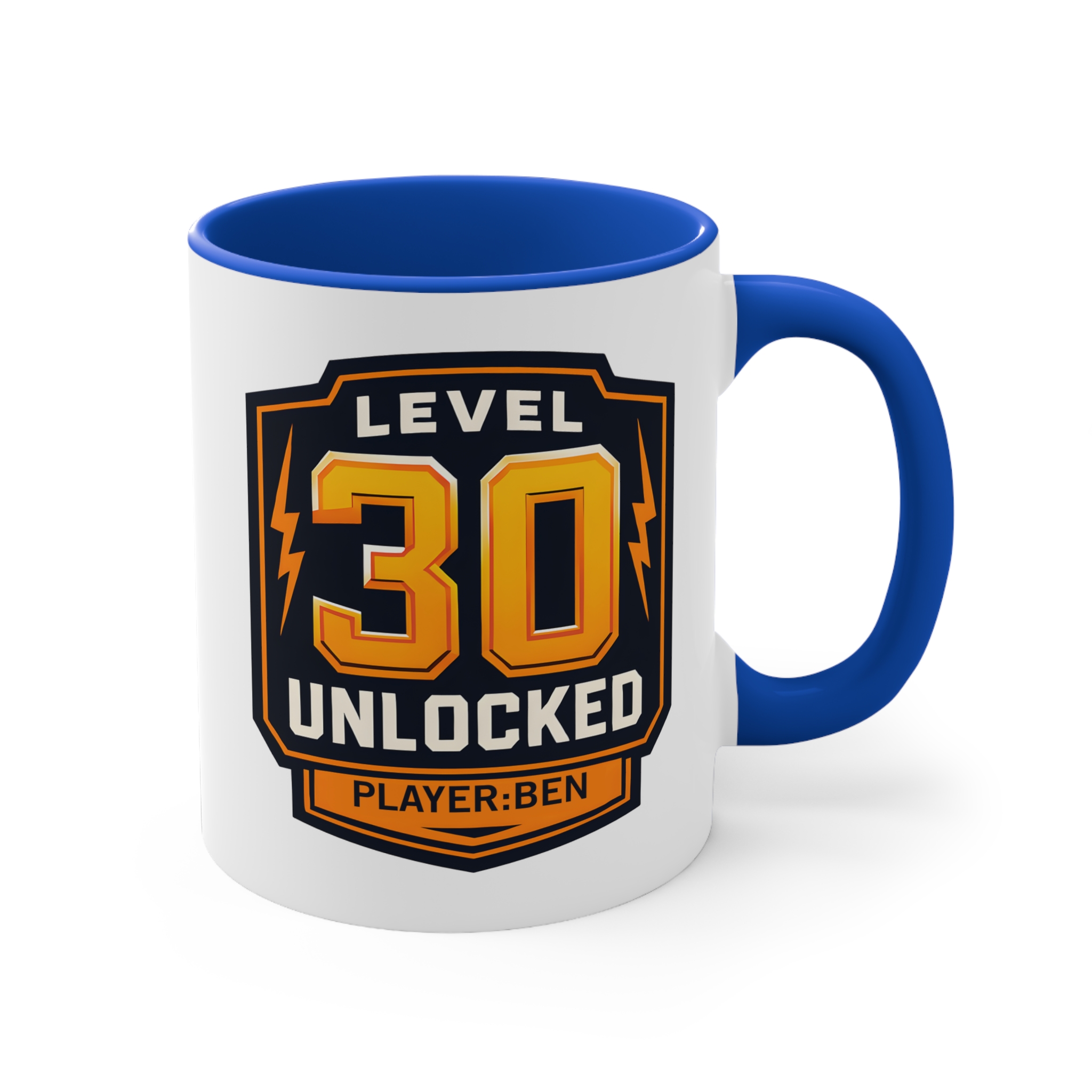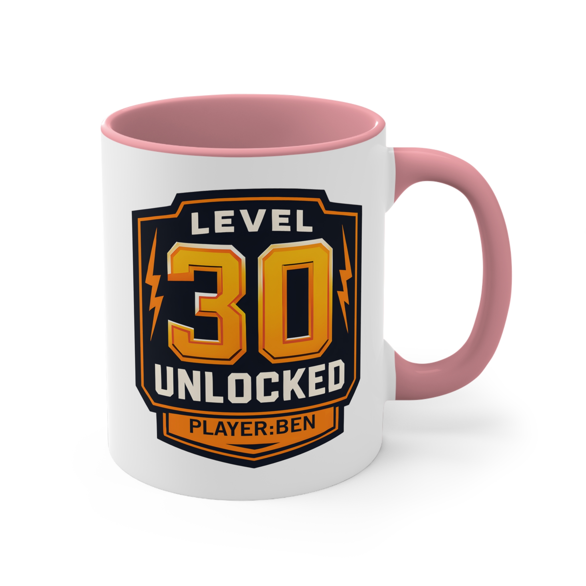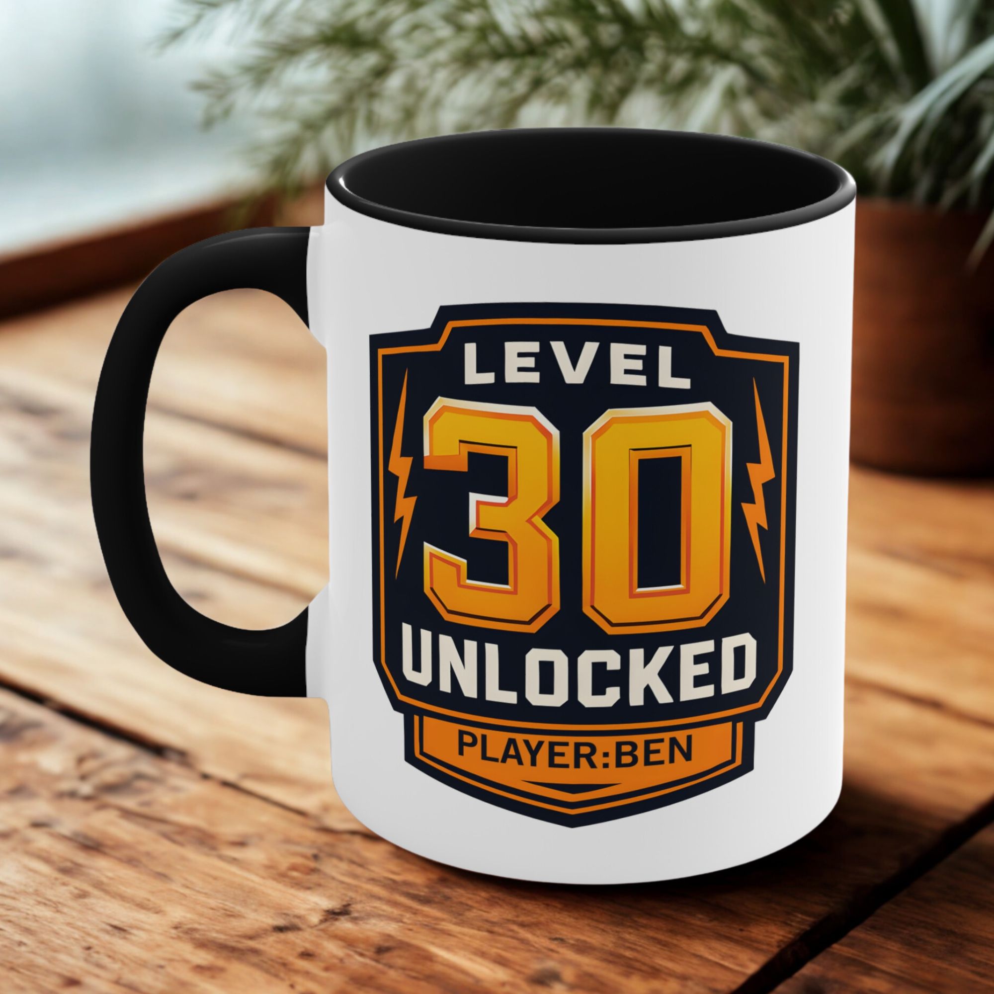 Level 30 unlocked personalised mug. 11oz ceramic custom 30th birthday gamer coffee mug with player name.