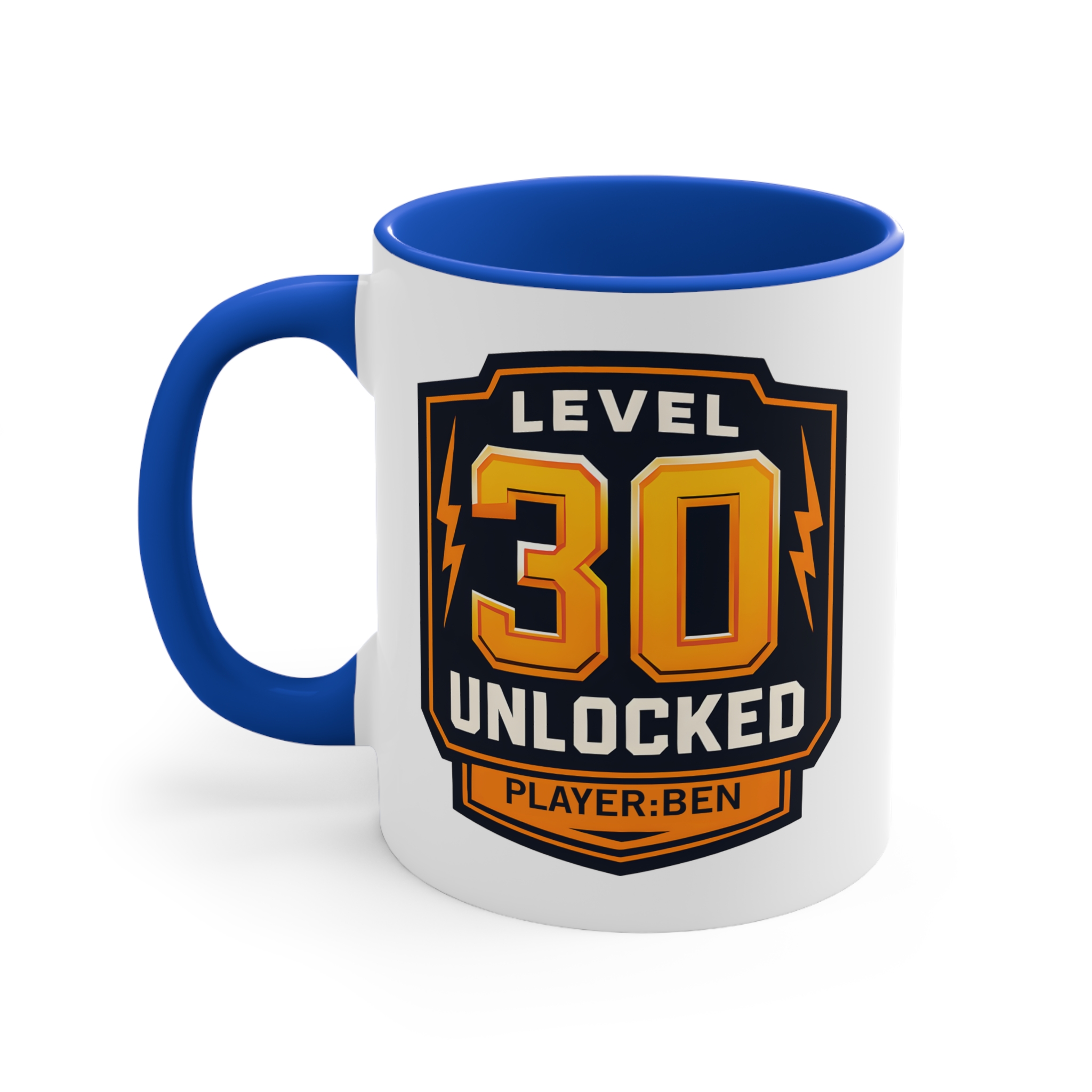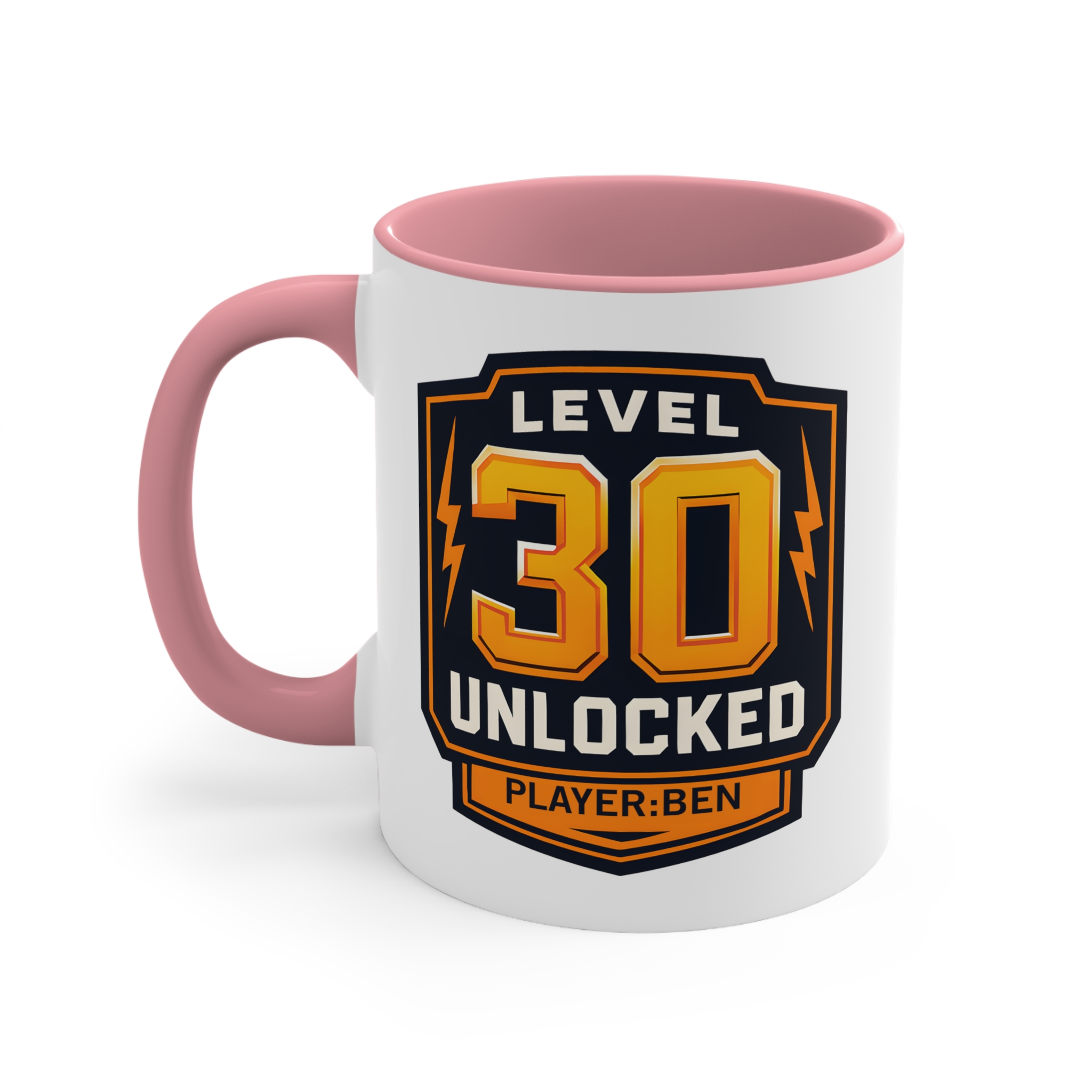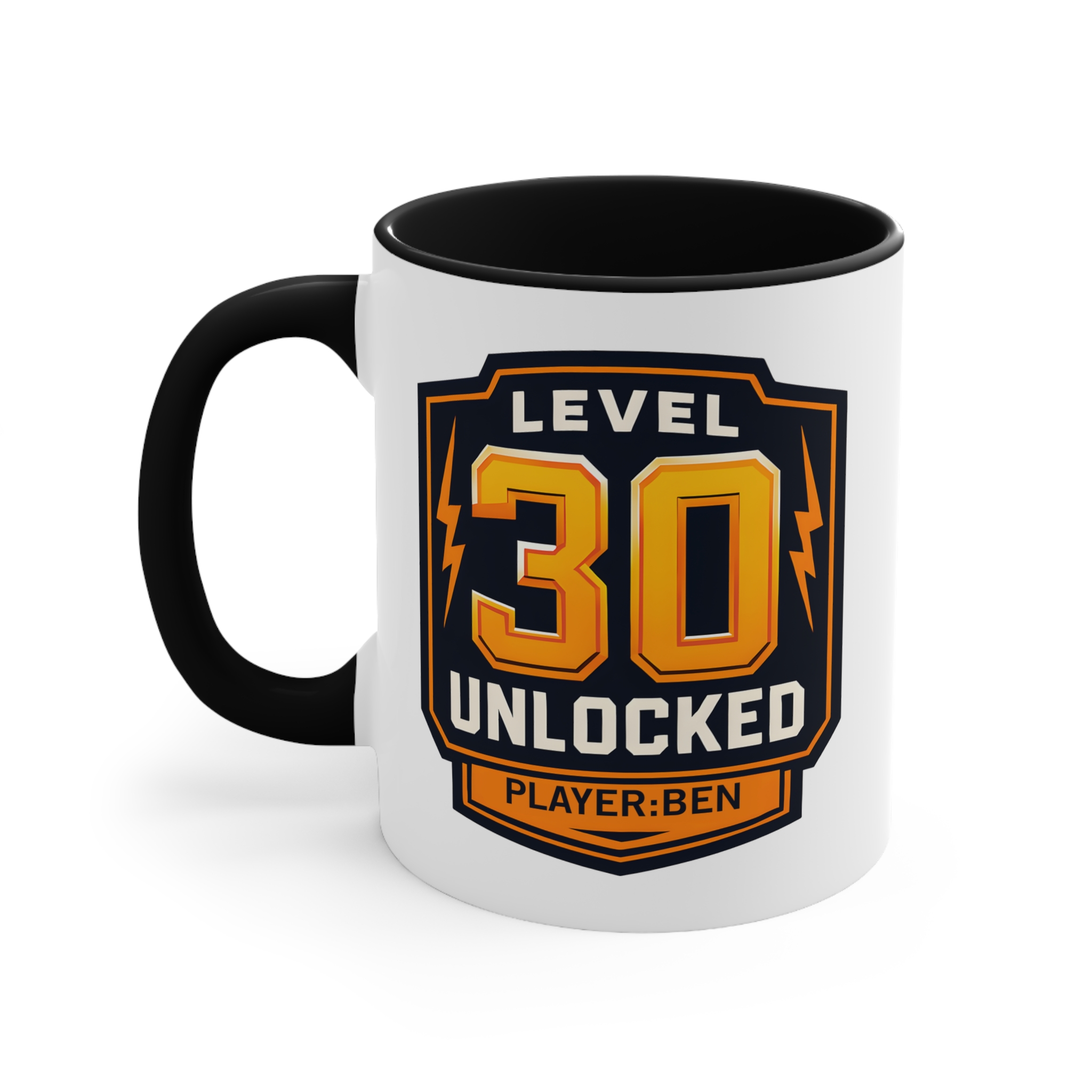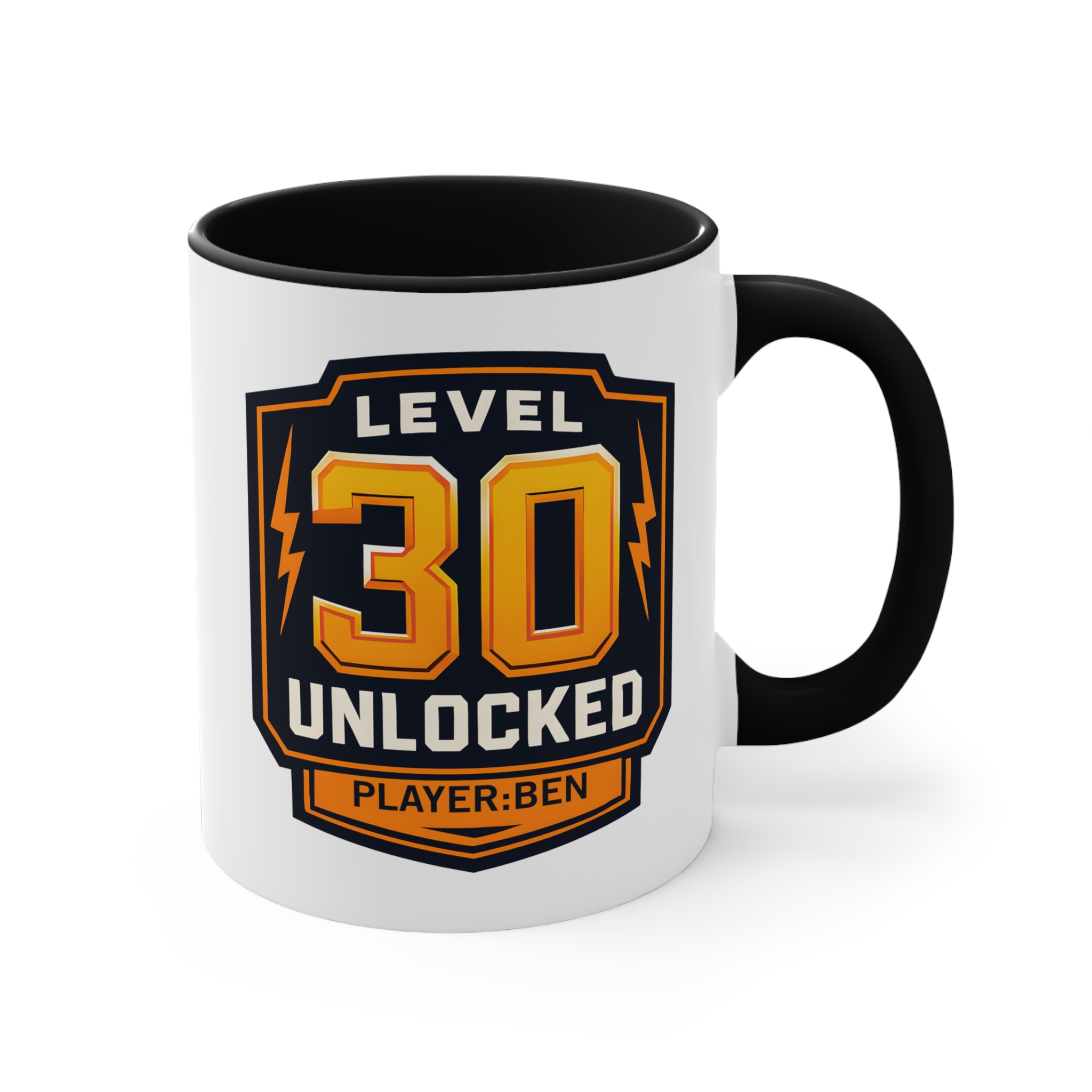 Level 30 unlocked personalised mug. 11oz ceramic custom 30th birthday gamer coffee mug with player name.