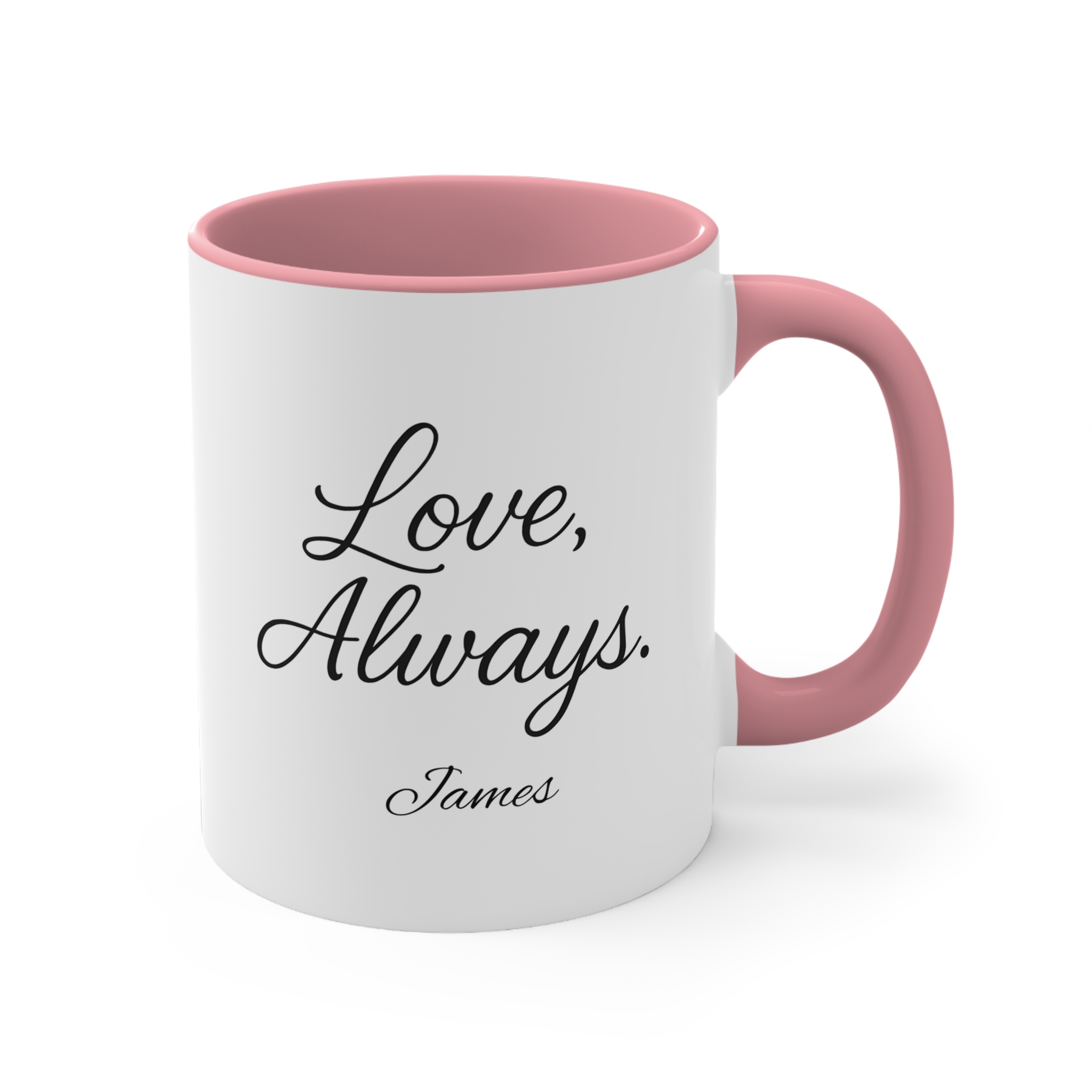 Say it simply and beautifully with this love always script mug. Personalised name, 11oz ceramic mug, available in black, red, blue or pink handle. Microwave safe, hand wash recommended.