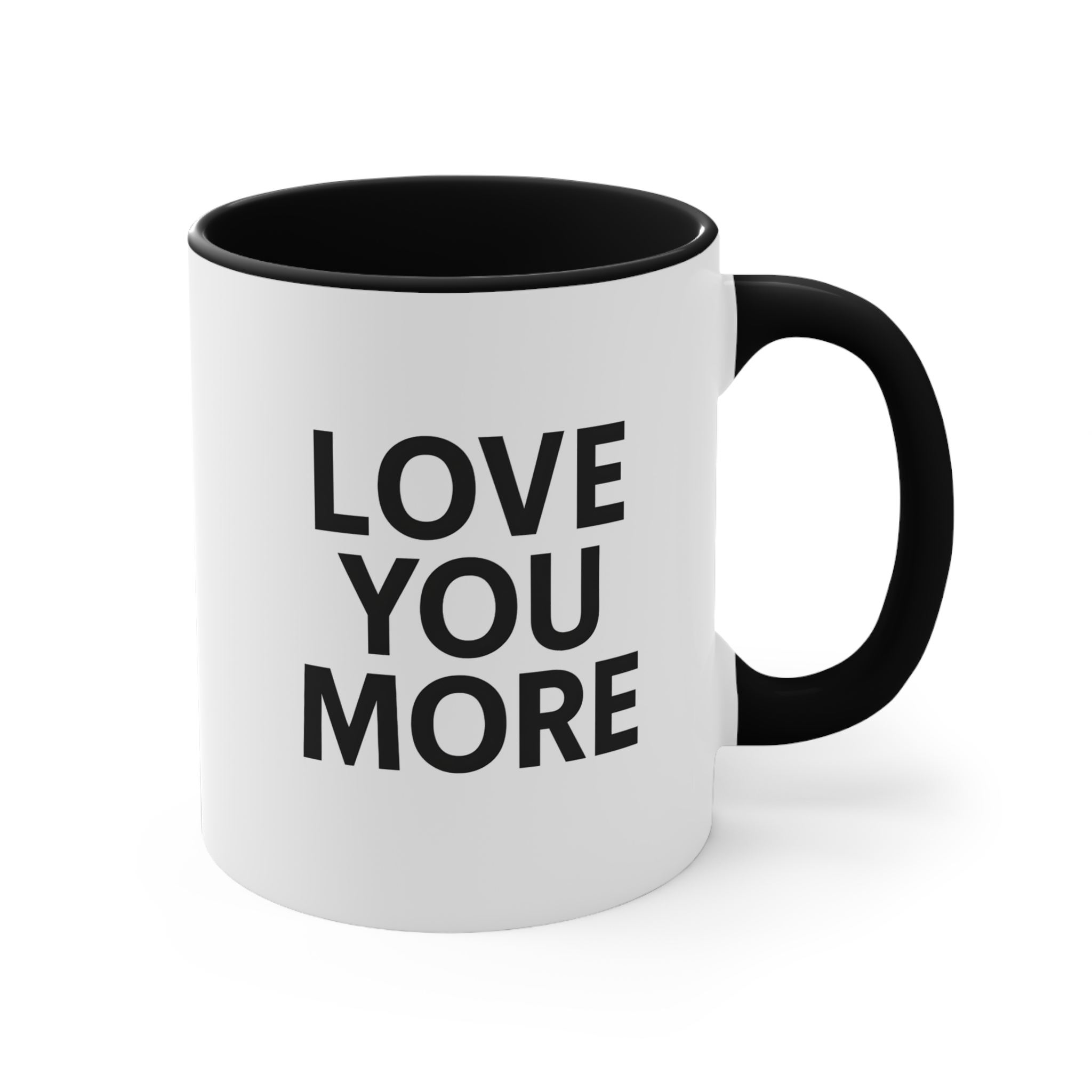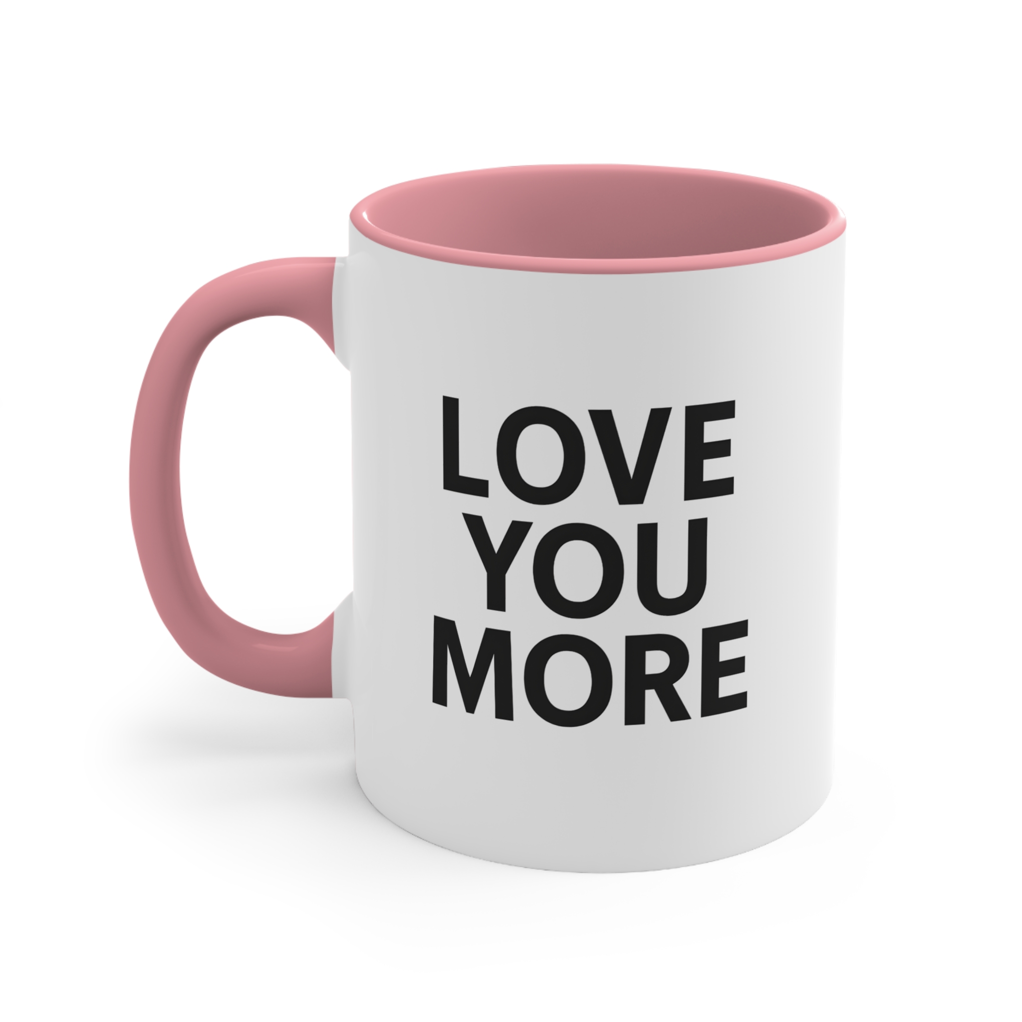 Keep it simple with this love you more text mug. 11oz ceramic mug, available in black, red, blue or pink handle, microwave safe, hand wash recommended.