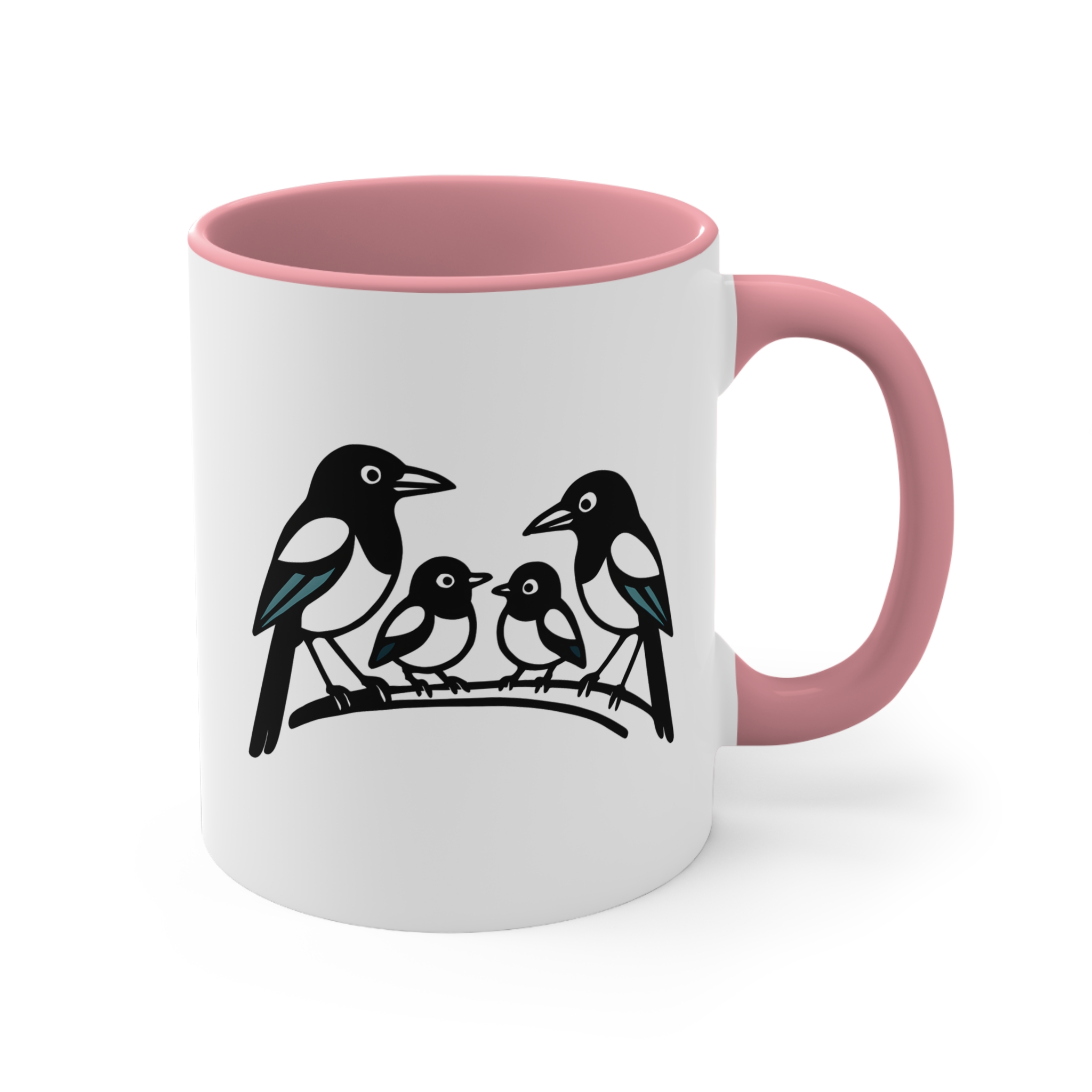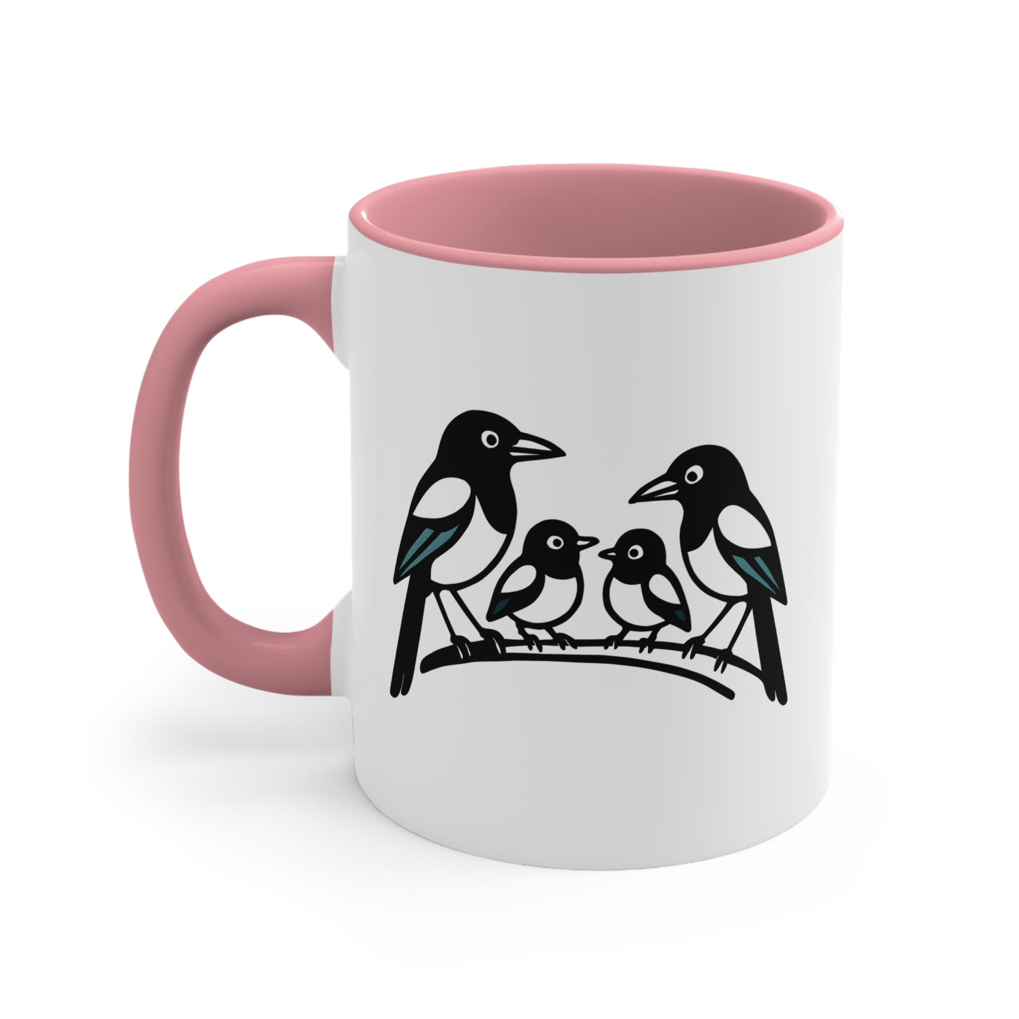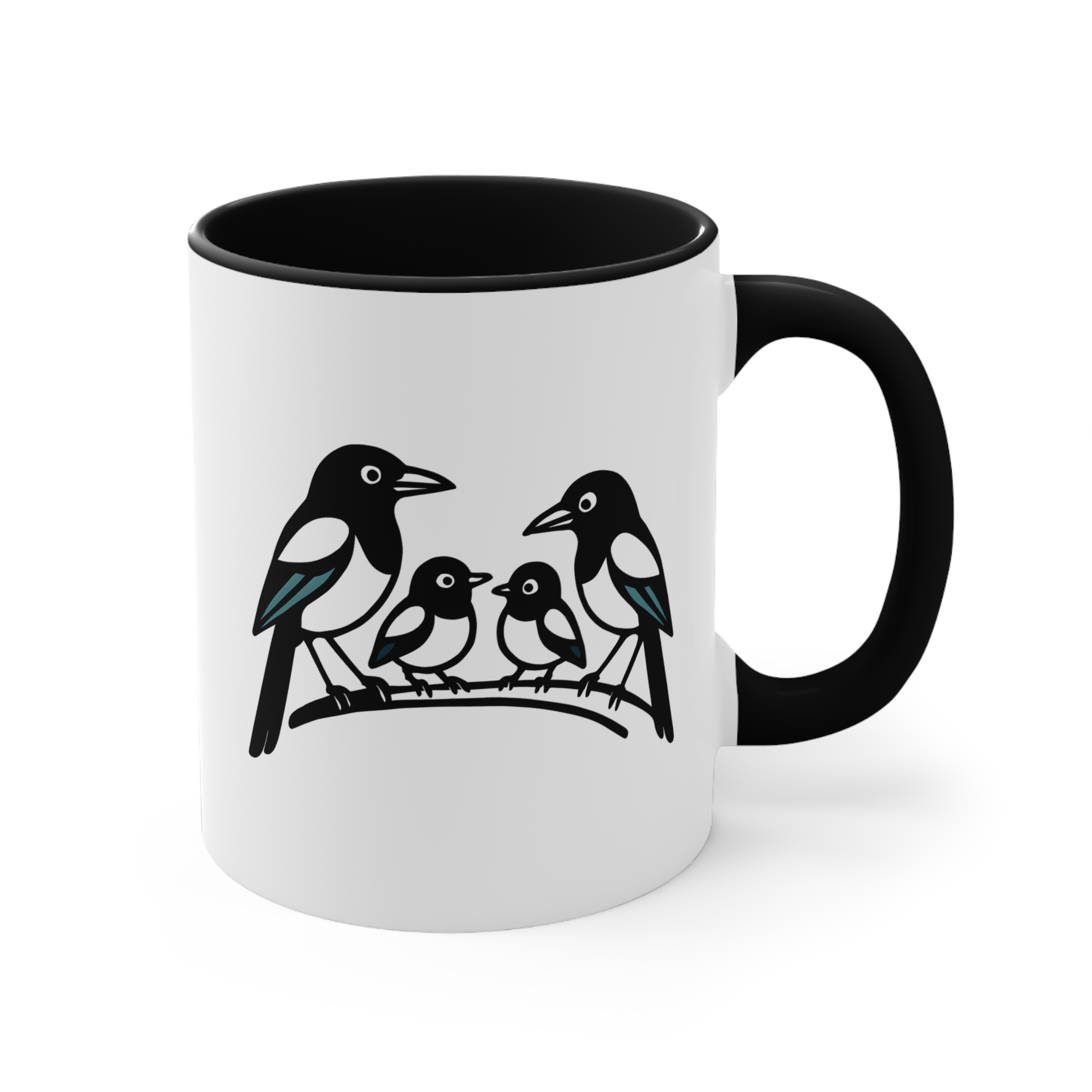 Magpie mug – 11oz ceramic, microwave safe, hand wash recommended, available in 4 colors.