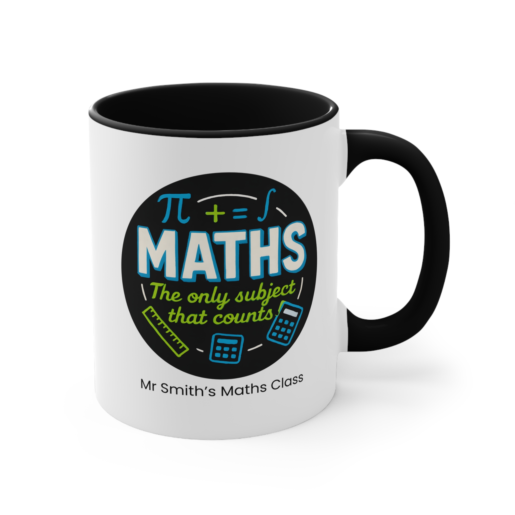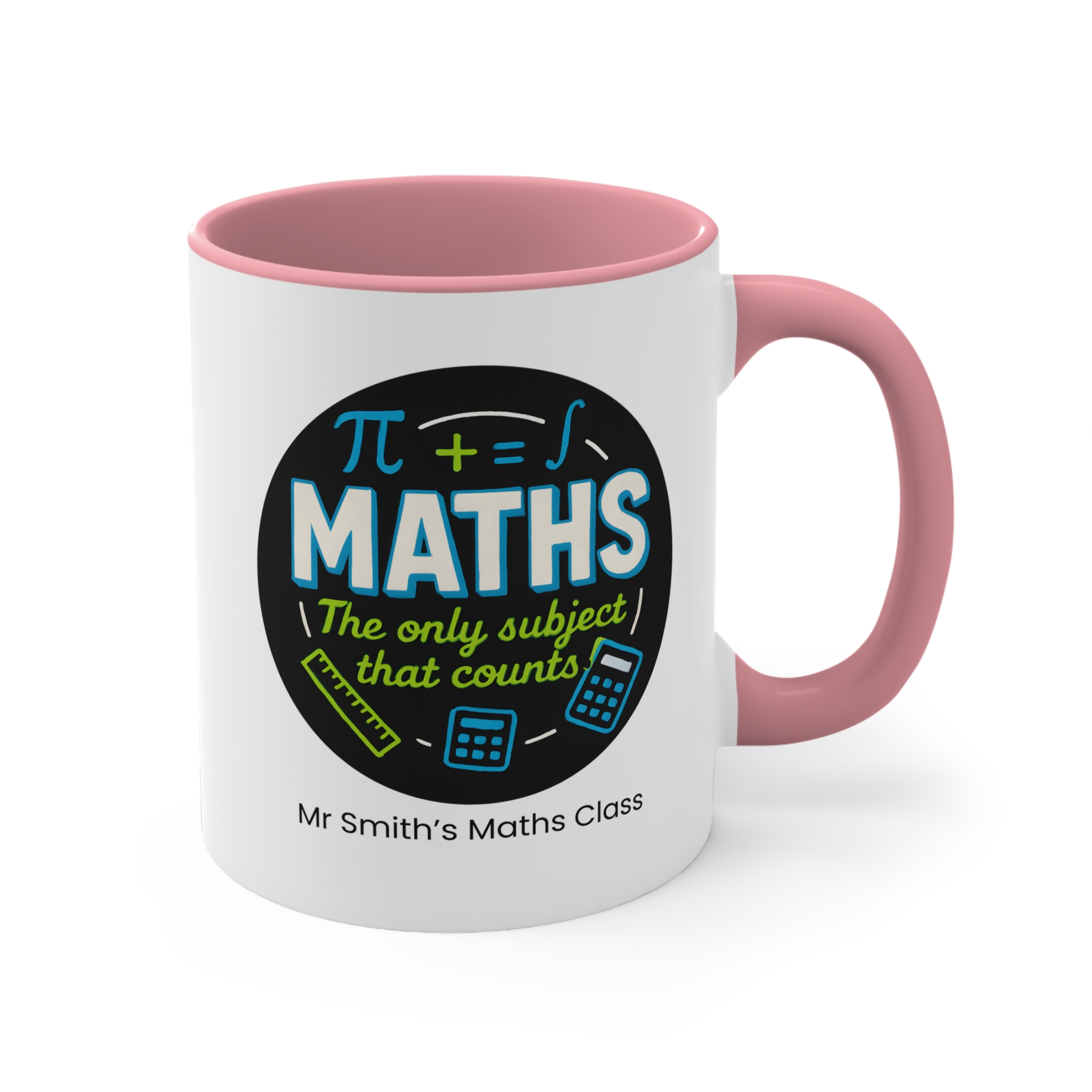 Custom maths teacher mug featuring “Maths – The Only Subject That Counts” design. Personalise with a teacher or class name. A fun and smart 11oz accent mug for maths educators and STEM lovers.