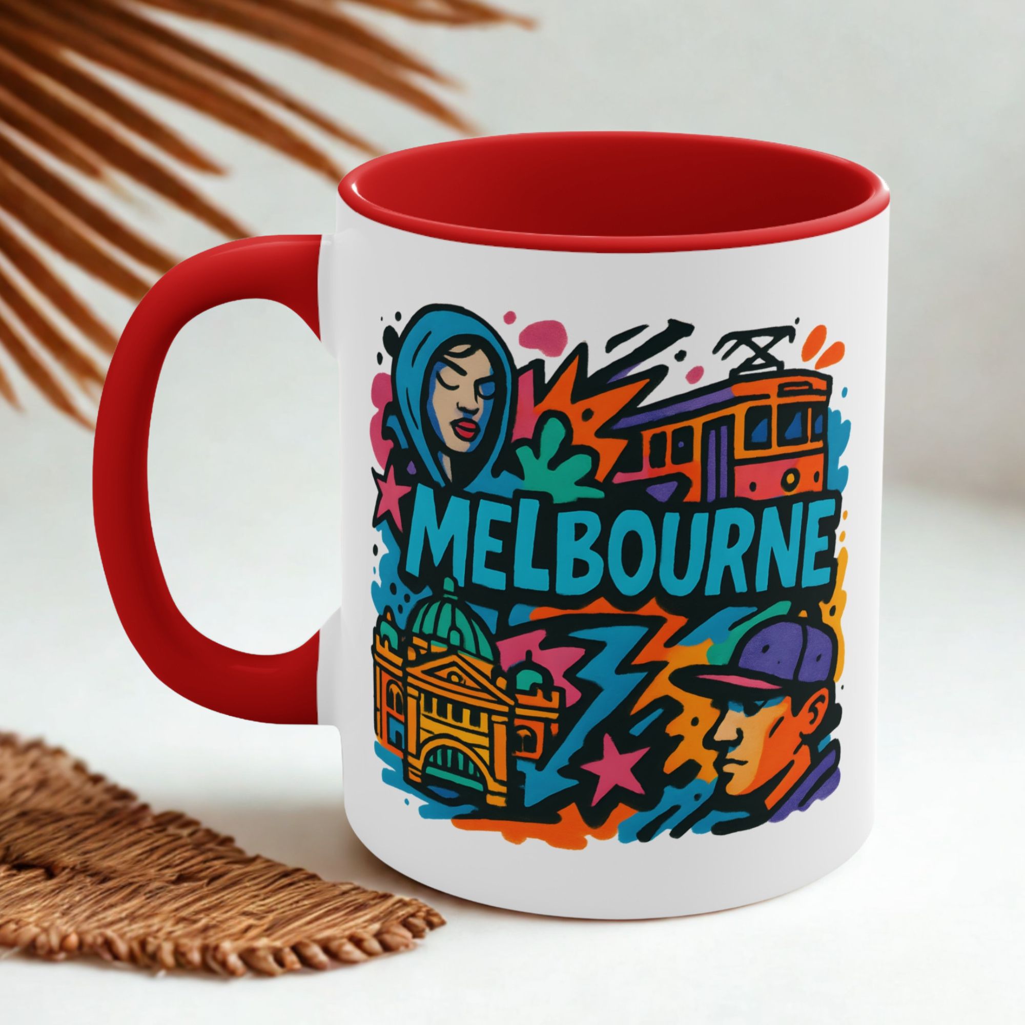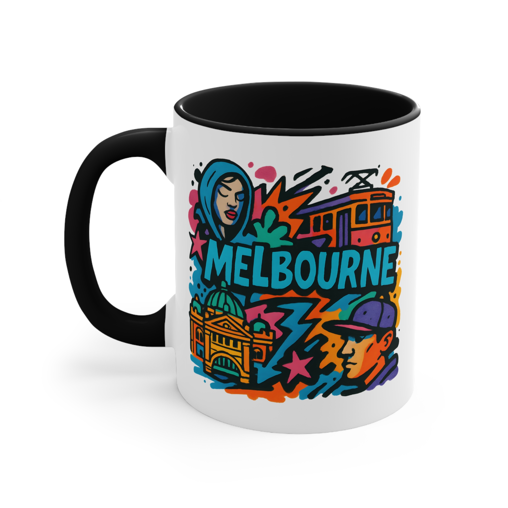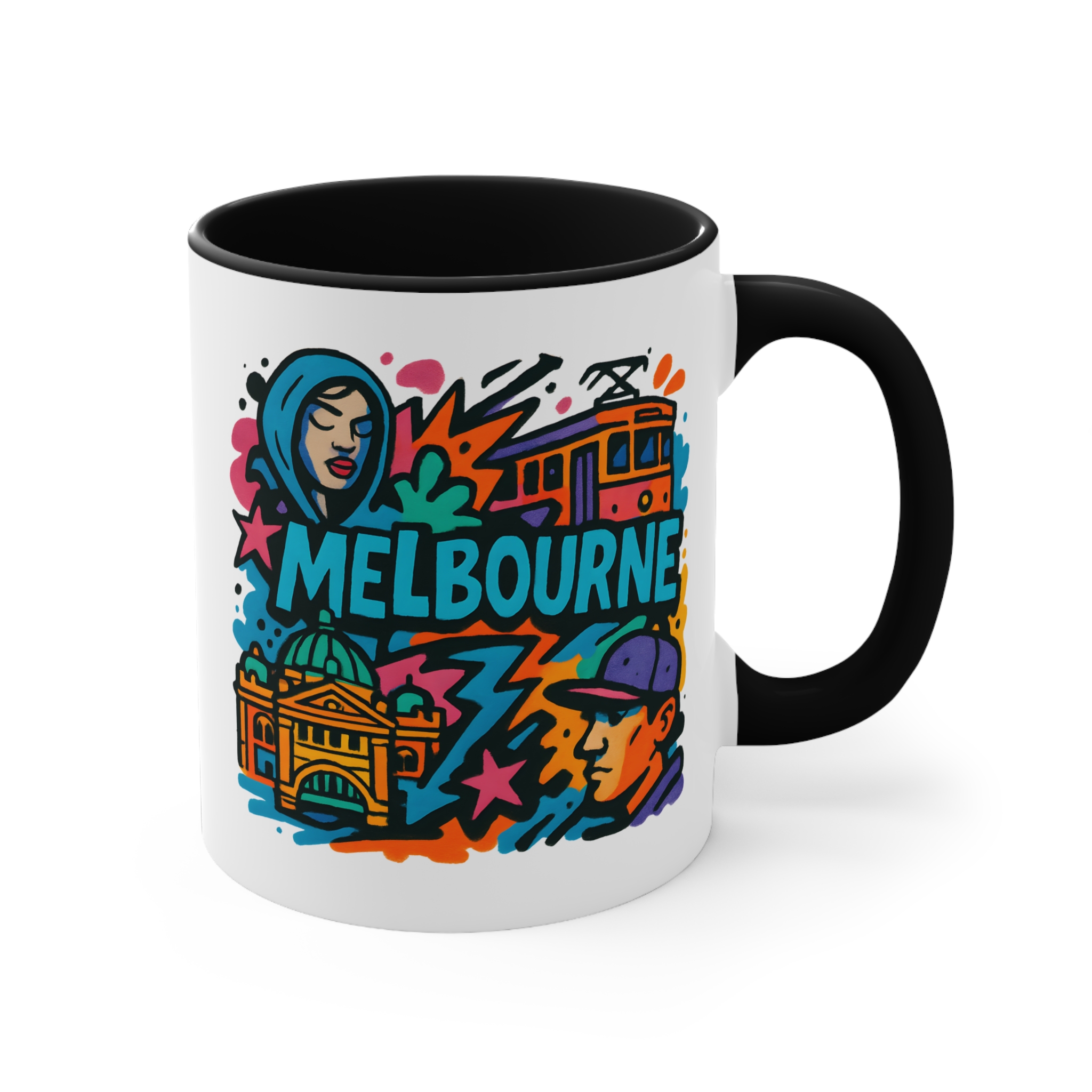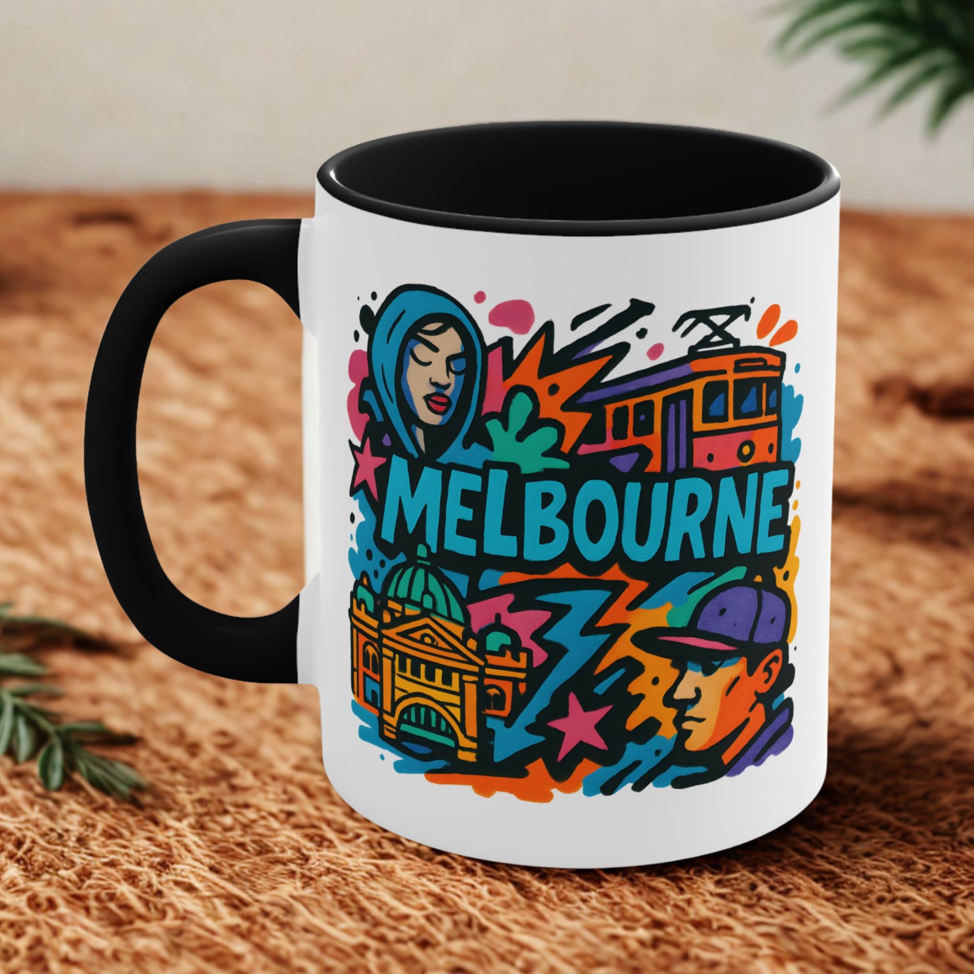 This eye-catching design blends urban street culture with famous city elements — from trams to architecture — all brought together in a vibrant graffiti-style composition. It’s the perfect way to bring a piece of Melbourne’s artistic vibe into your daily routine.
