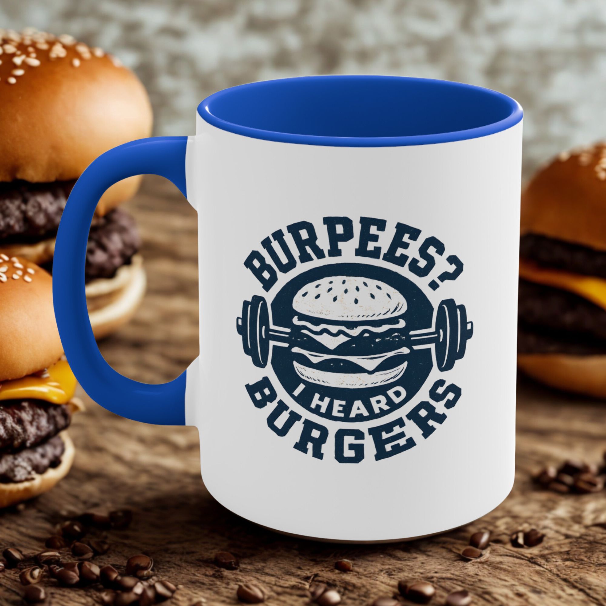 Clean, bold, and cheeky – this minimalist gym mug delivers the message loud and clear: “Burpees? I Heard Burgers.” With a solid navy print and burger-barbell icon, it’s the perfect low-key mug for gym-goers who don’t skip leg day or snack time.