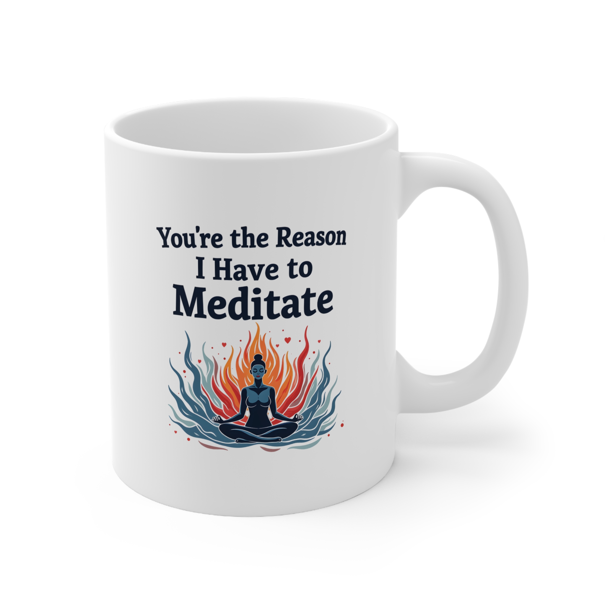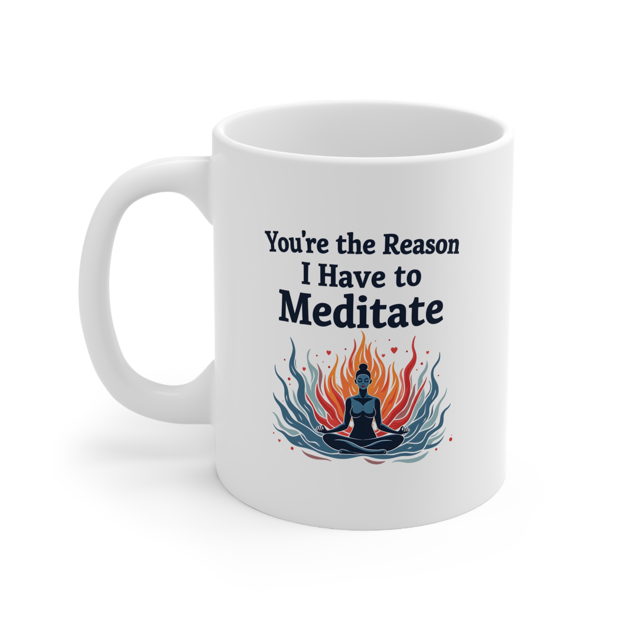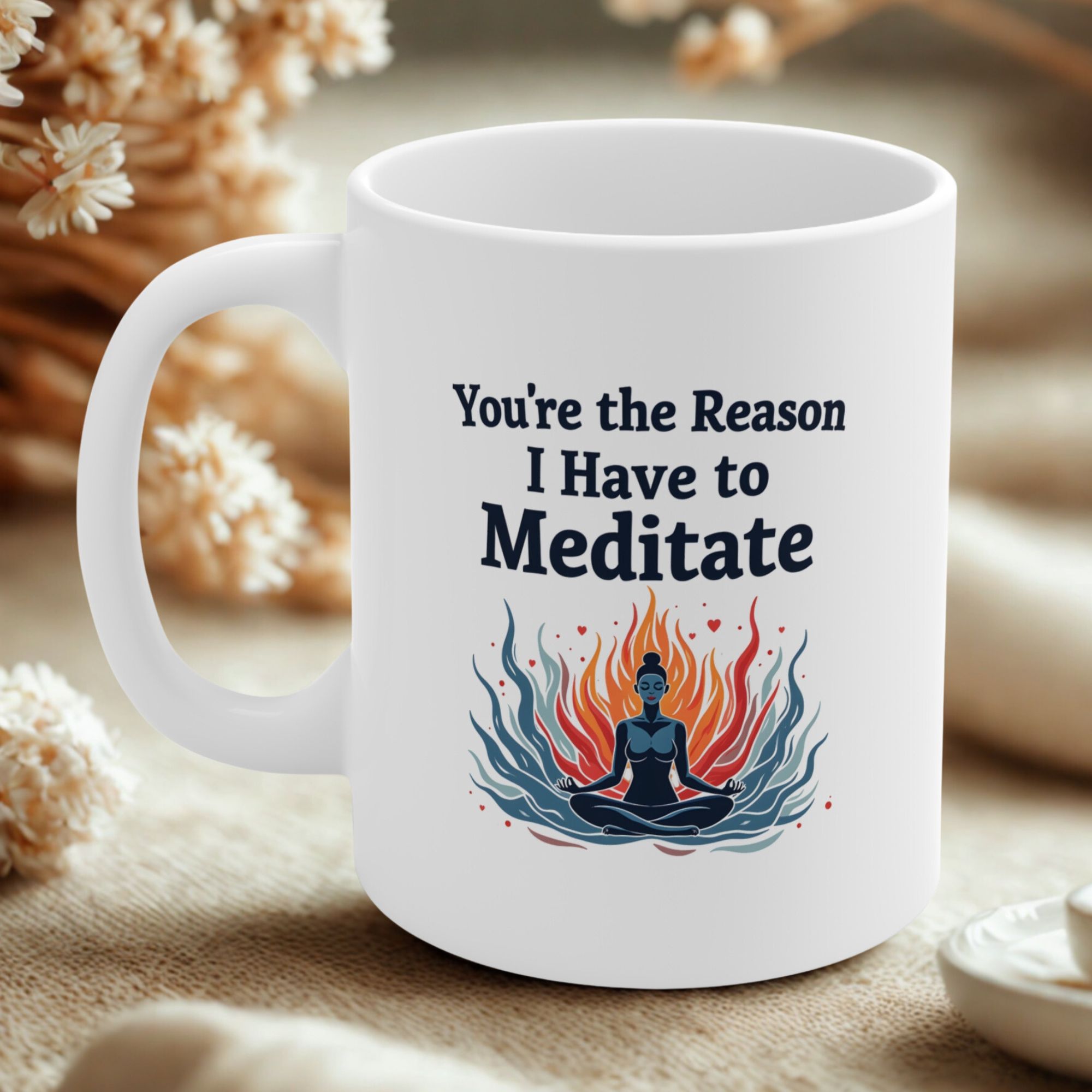 This funny yoga mug says what every peaceful soul really feels sometimes. Featuring the hilariously relatable phrase “You’re the Reason I Have to Meditate” in bold, all-caps sans-serif, this design balances sarcasm with spiritual chill.