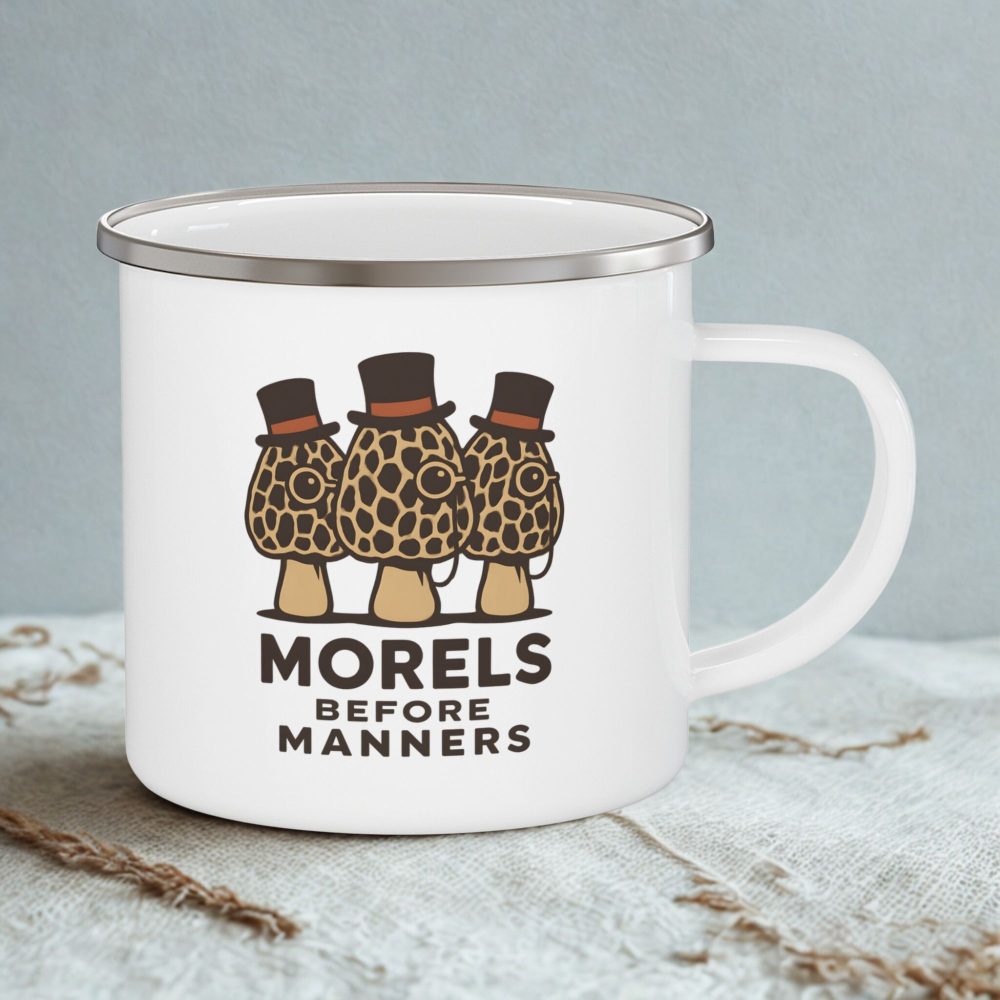 Mushroom foraging mug with the funny slogan “Morels Before Manners.” A 12oz enamel camping mug perfect for outdoor adventures.