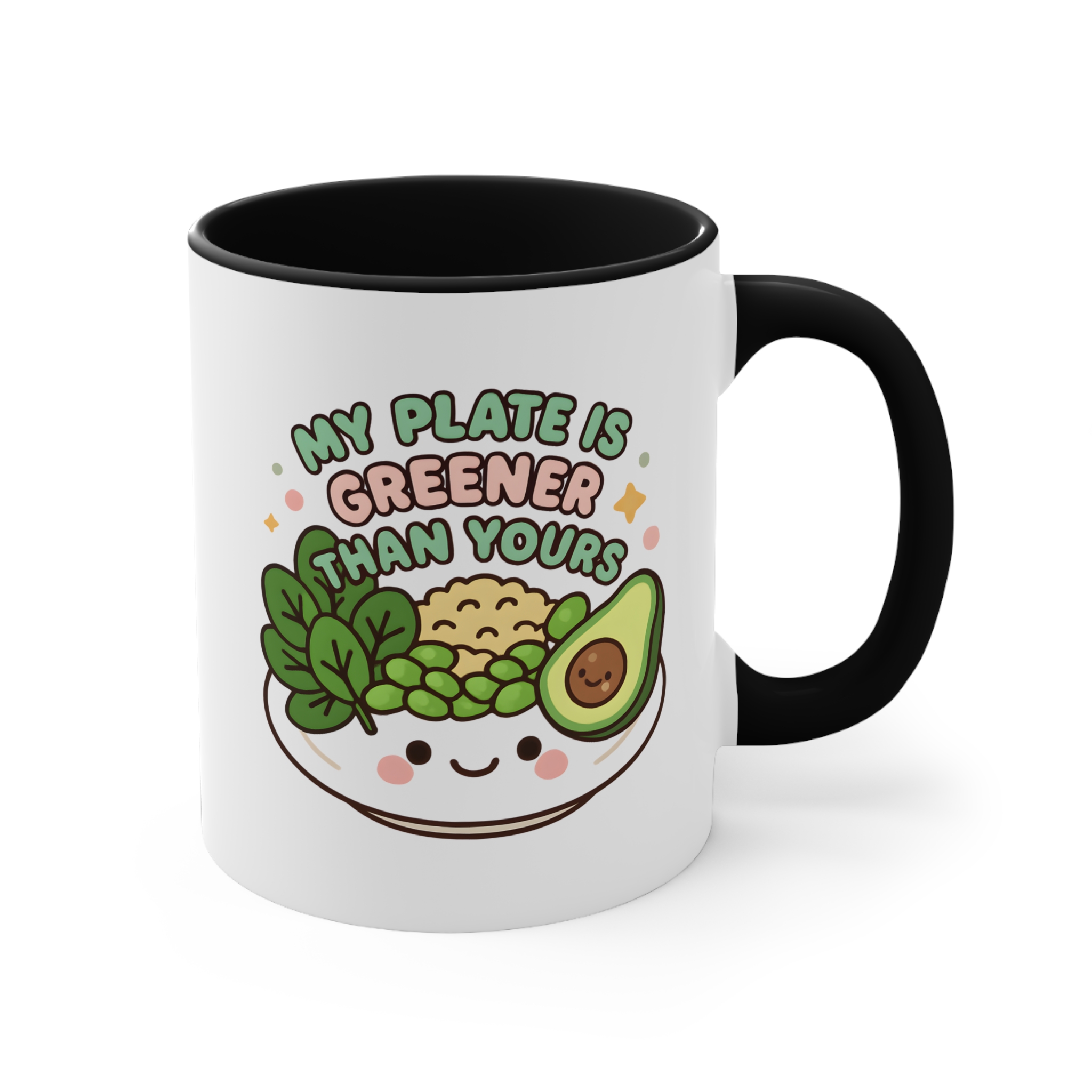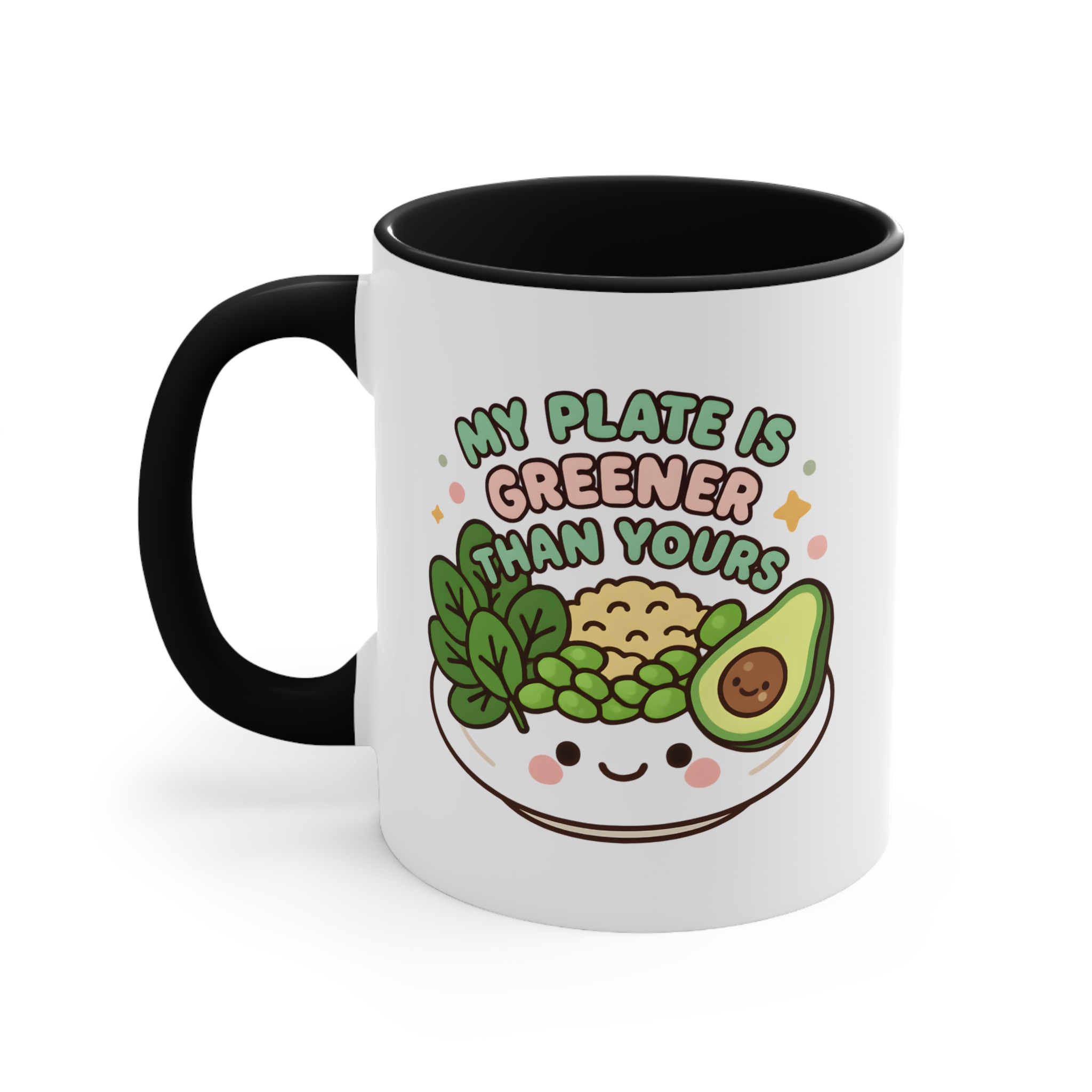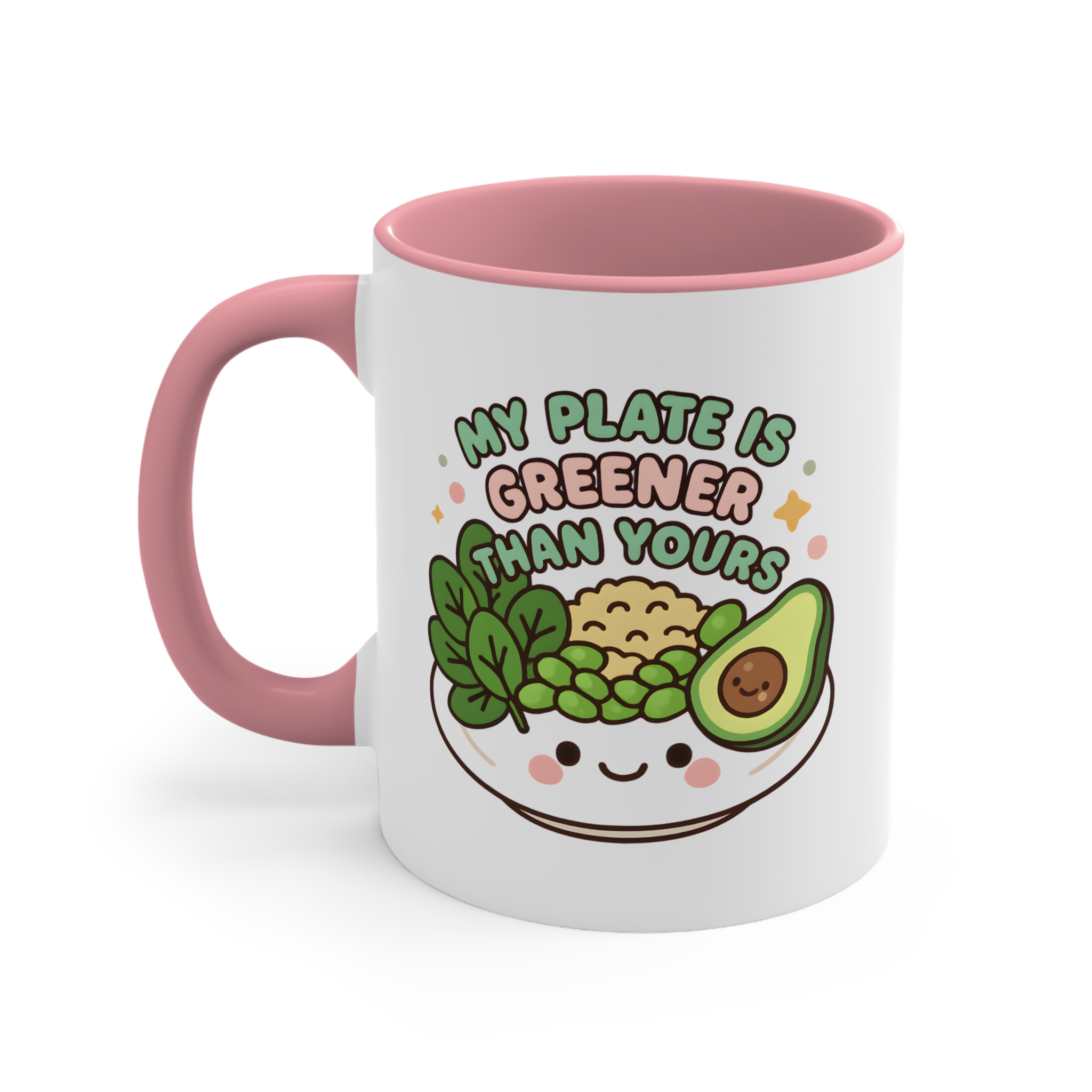 This my plate is greener mug is the perfect combo of sass and salad. Featuring a smiling bowl filled with leafy greens, peas, brown rice, and a cheerful avocado, it boldly declares: