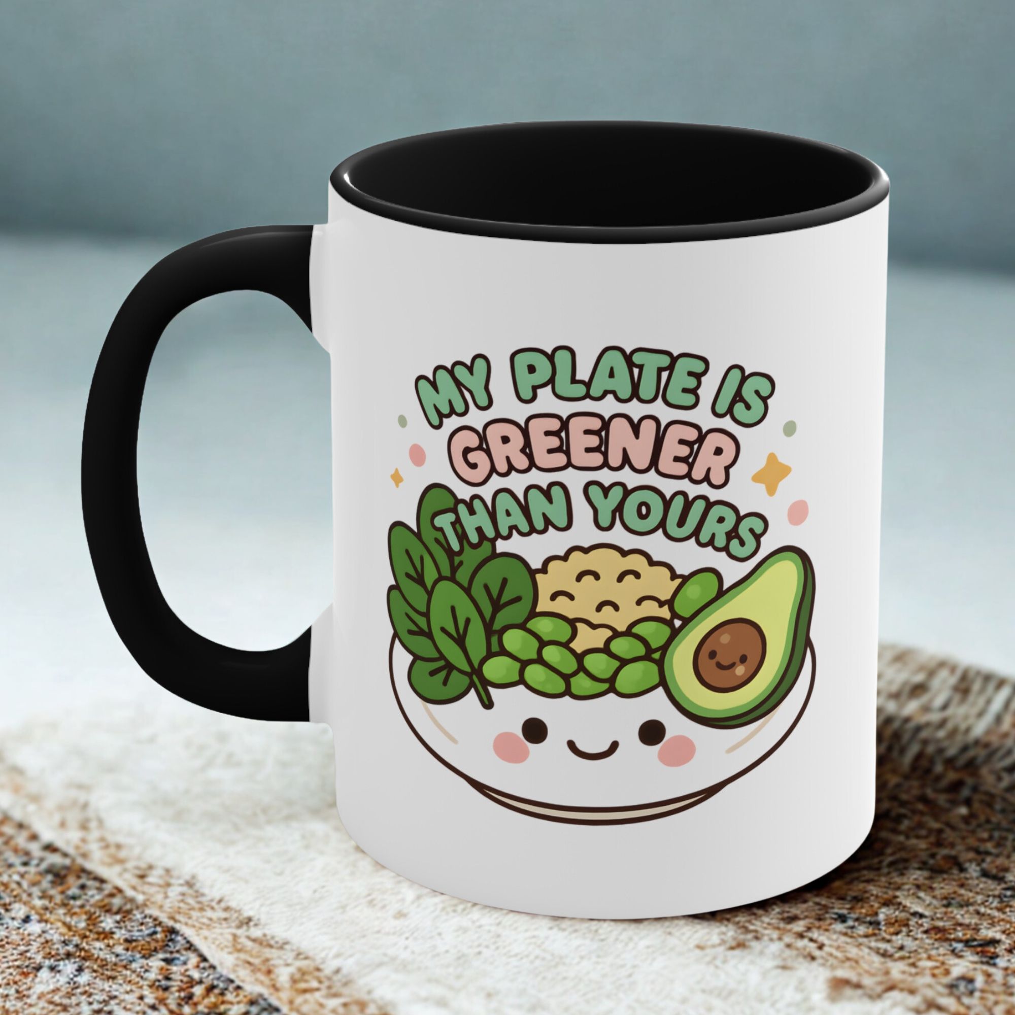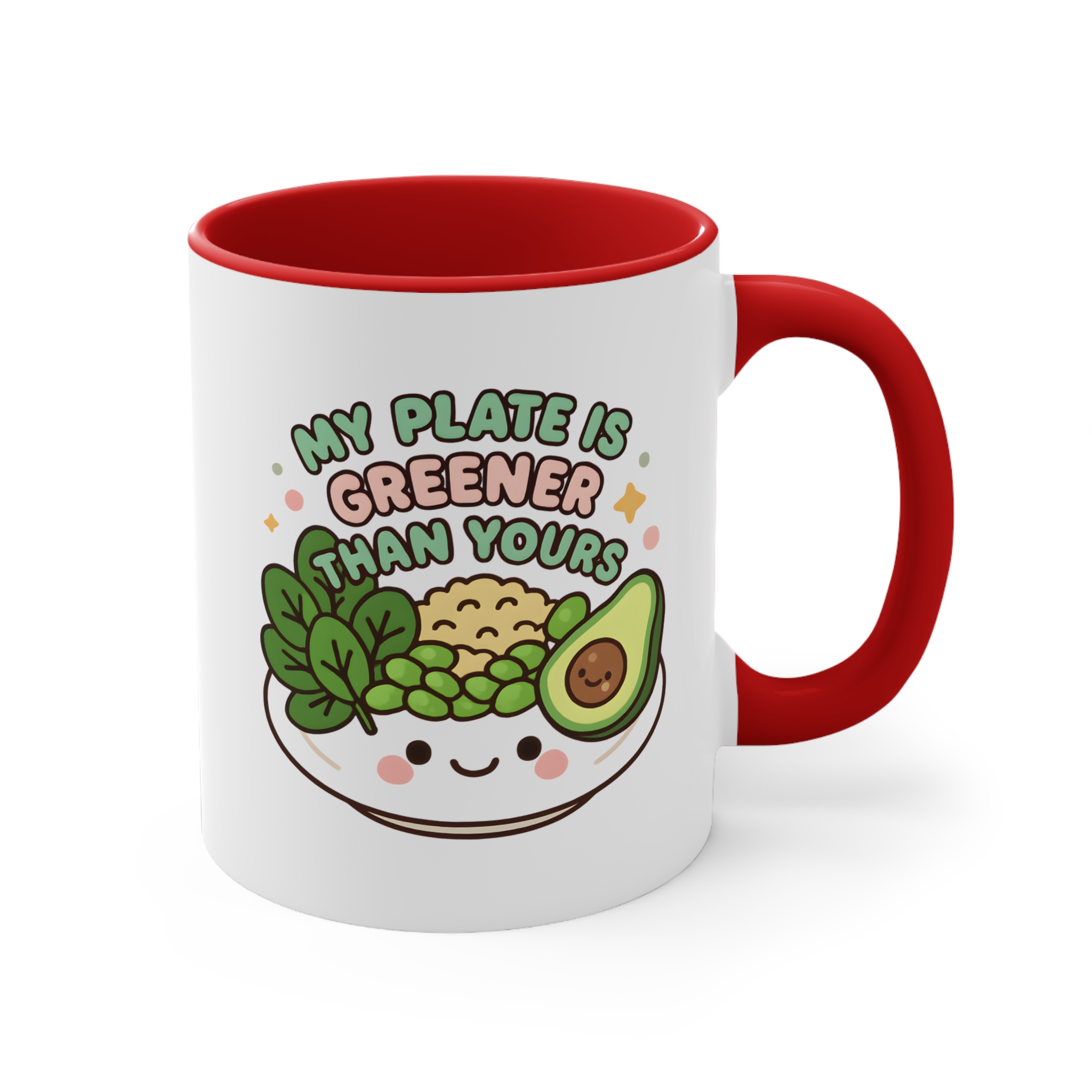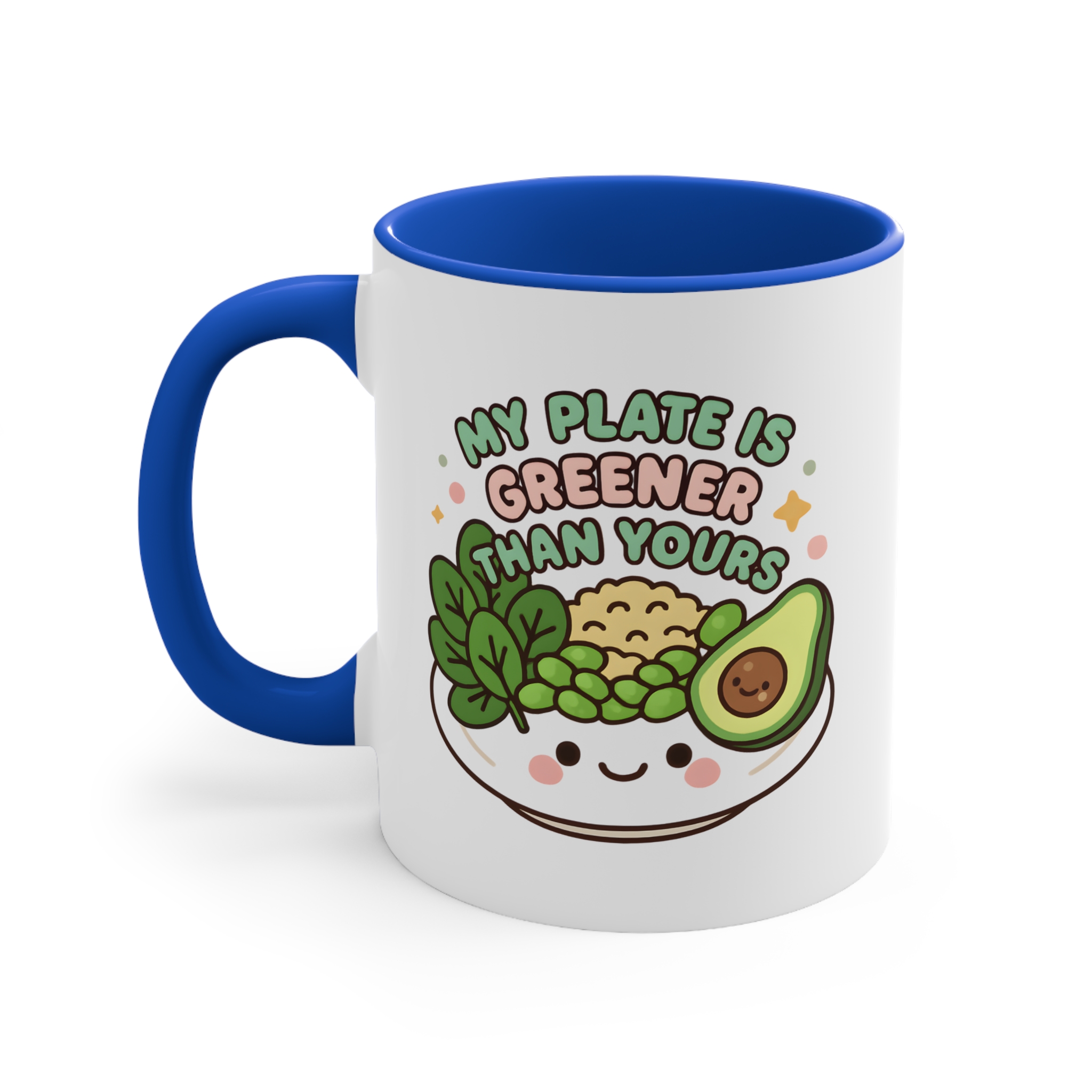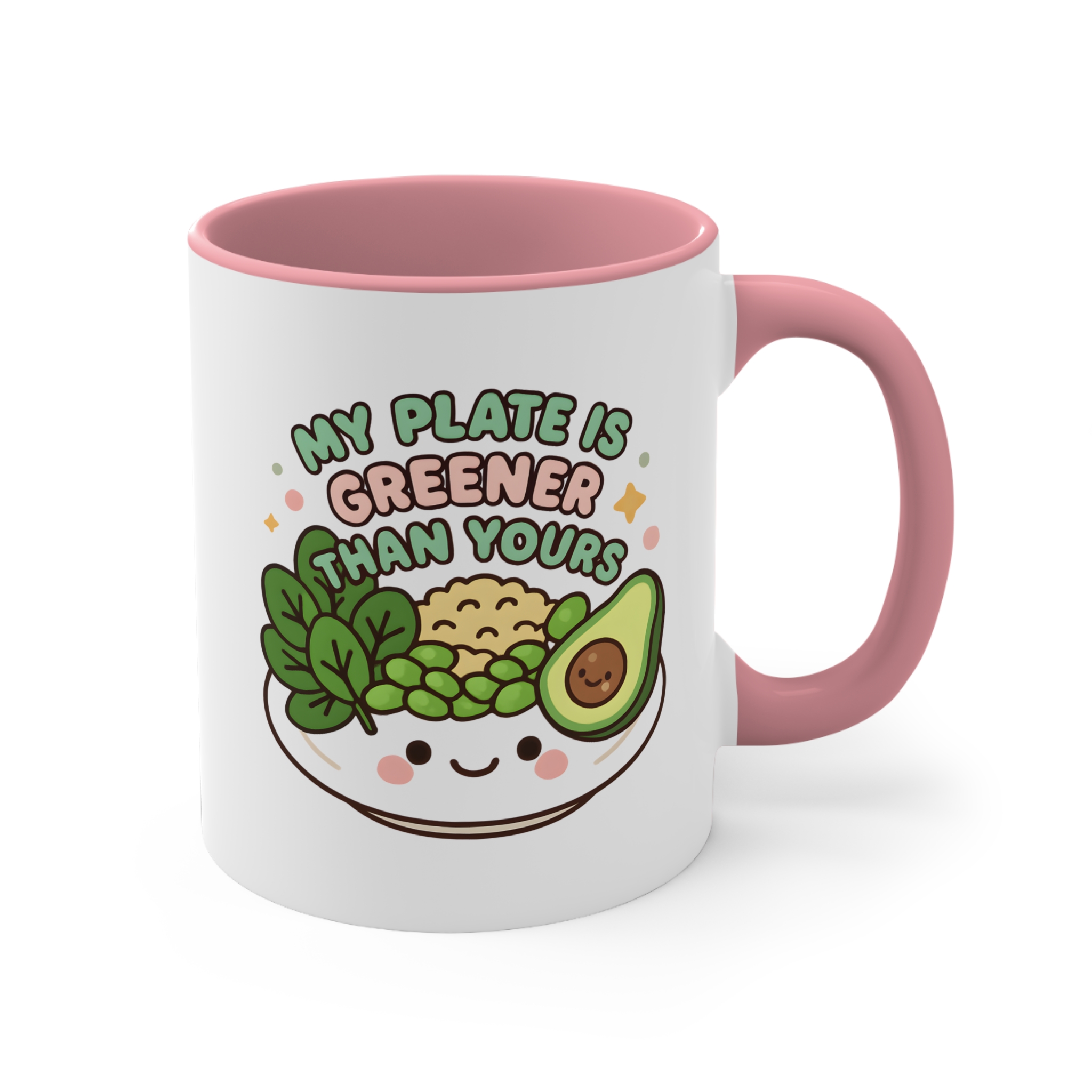 This my plate is greener mug is the perfect combo of sass and salad. Featuring a smiling bowl filled with leafy greens, peas, brown rice, and a cheerful avocado, it boldly declares: