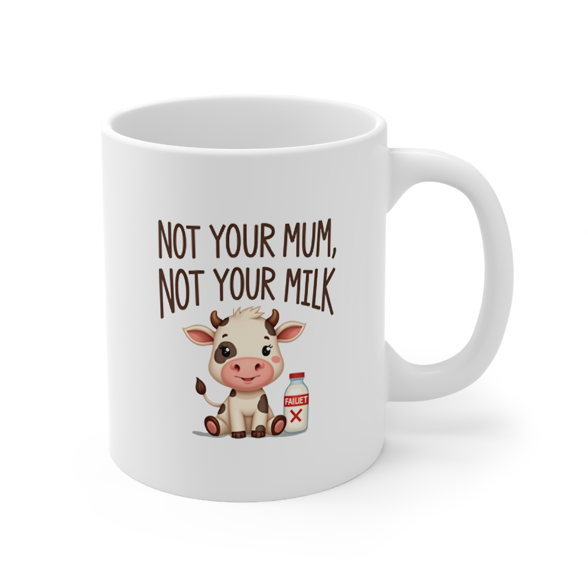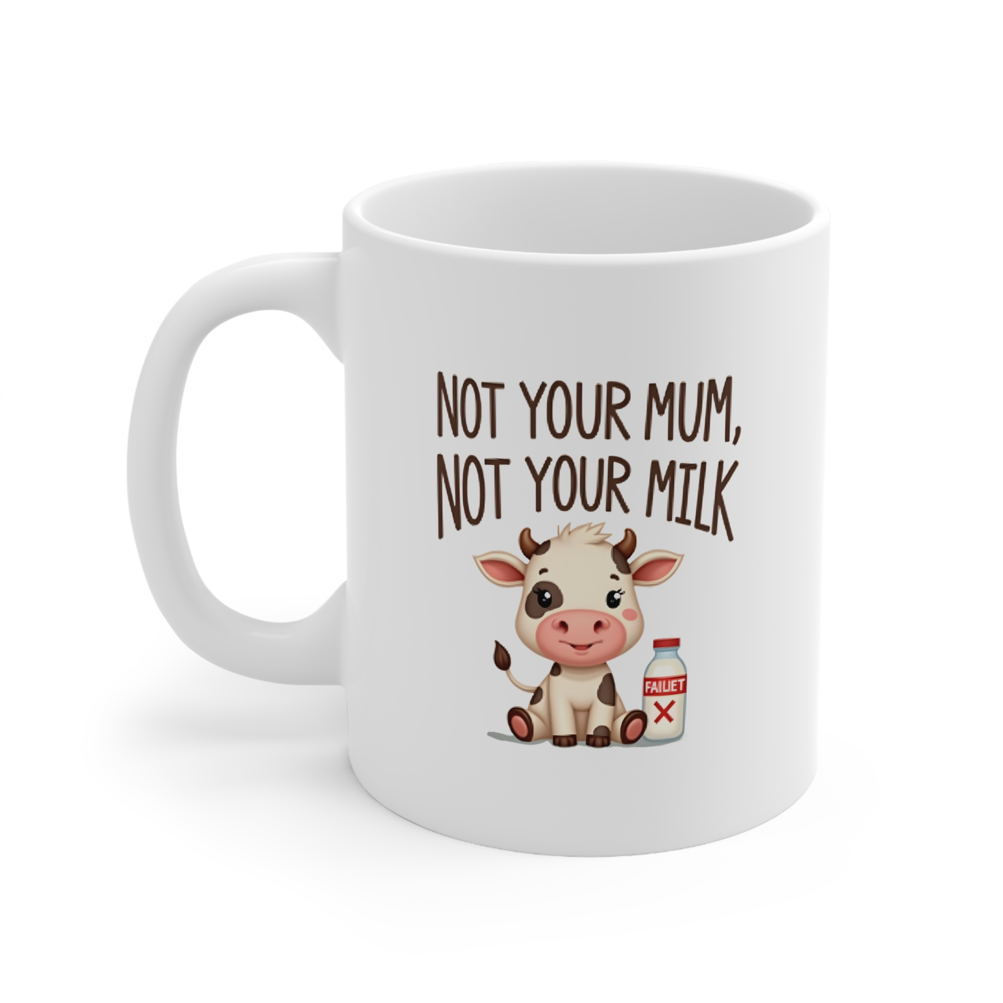 Make a gentle statement with this powerful vegan mug featuring the message “Not Your Mum, Not Your Milk.” The playful, rounded text arcs above an irresistibly cute baby cow with big, expressive eyes. Beside the calf, a crossed-out milk bottle sends a clear, compassionate message in a soft, friendly style.