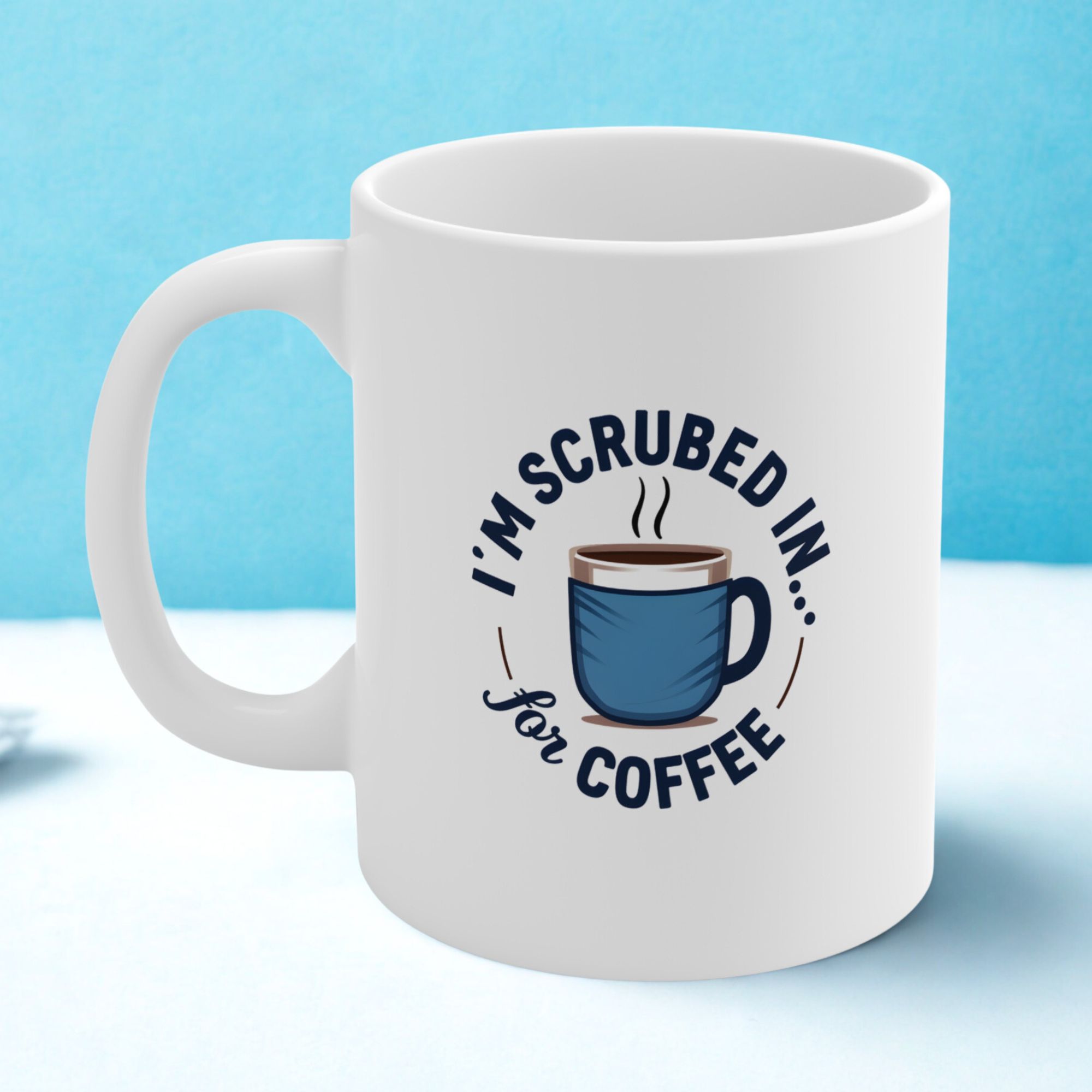 This nurse coffee break mug is perfect for caffeine-loving healthcare workers—“I’m Scrubbed In… for Coffee” in a clean, minimalist scrub-style design.