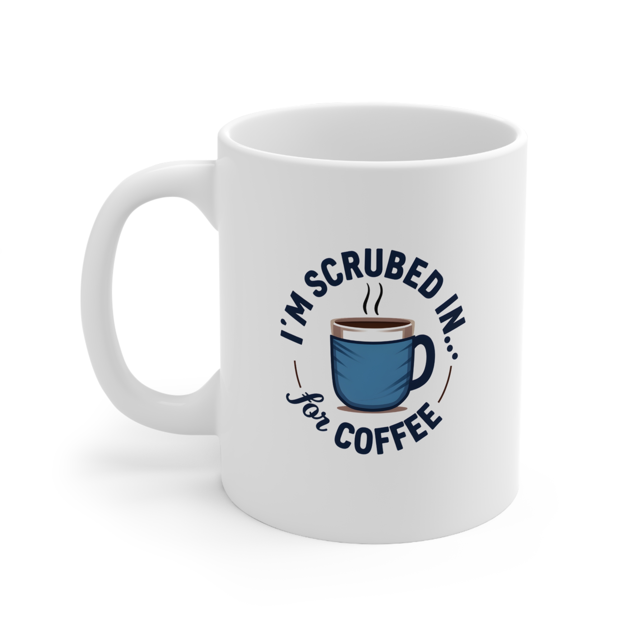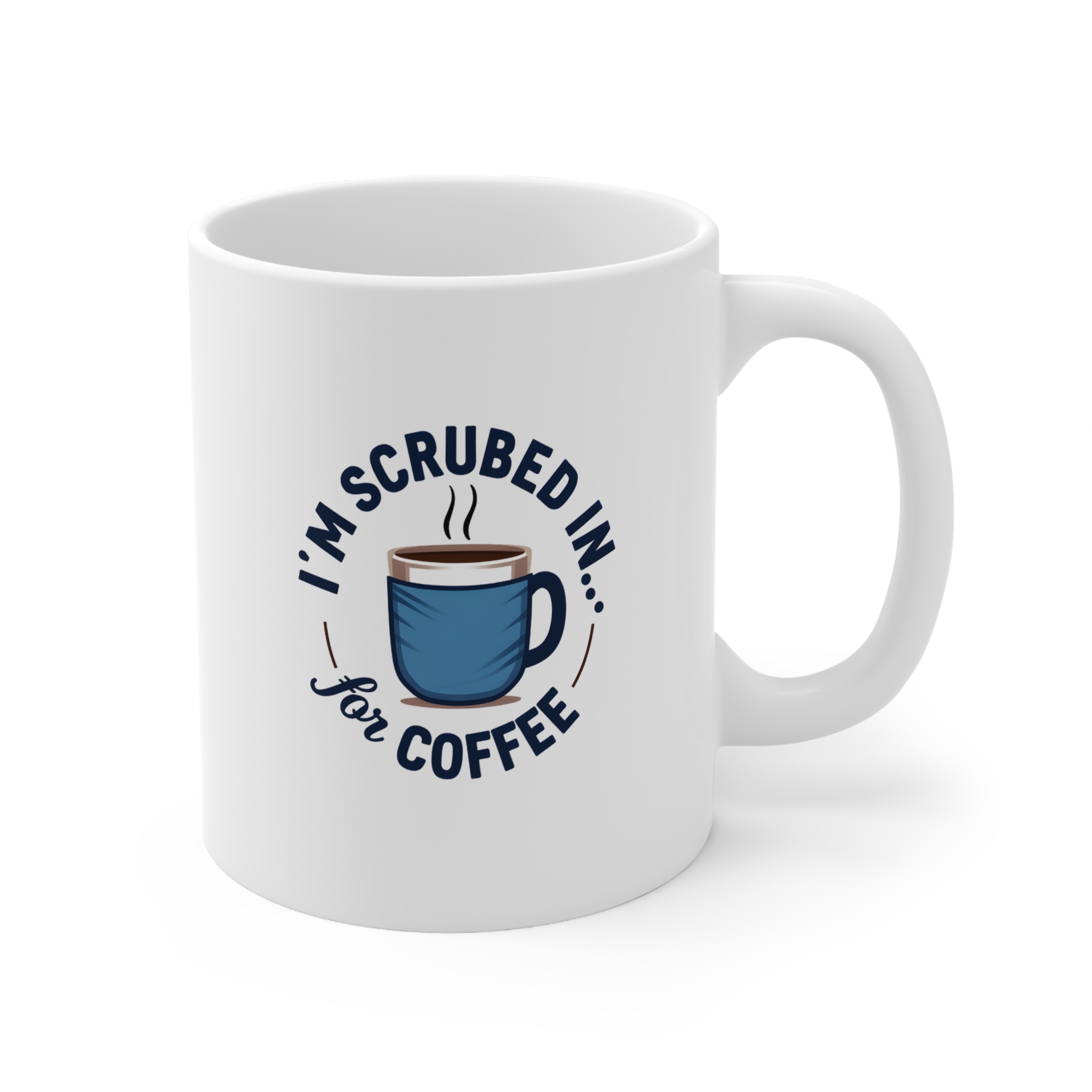 🎨 Design: Circular text in navy and brown, central coffee mug wrapped in blue scrubs with rising steam