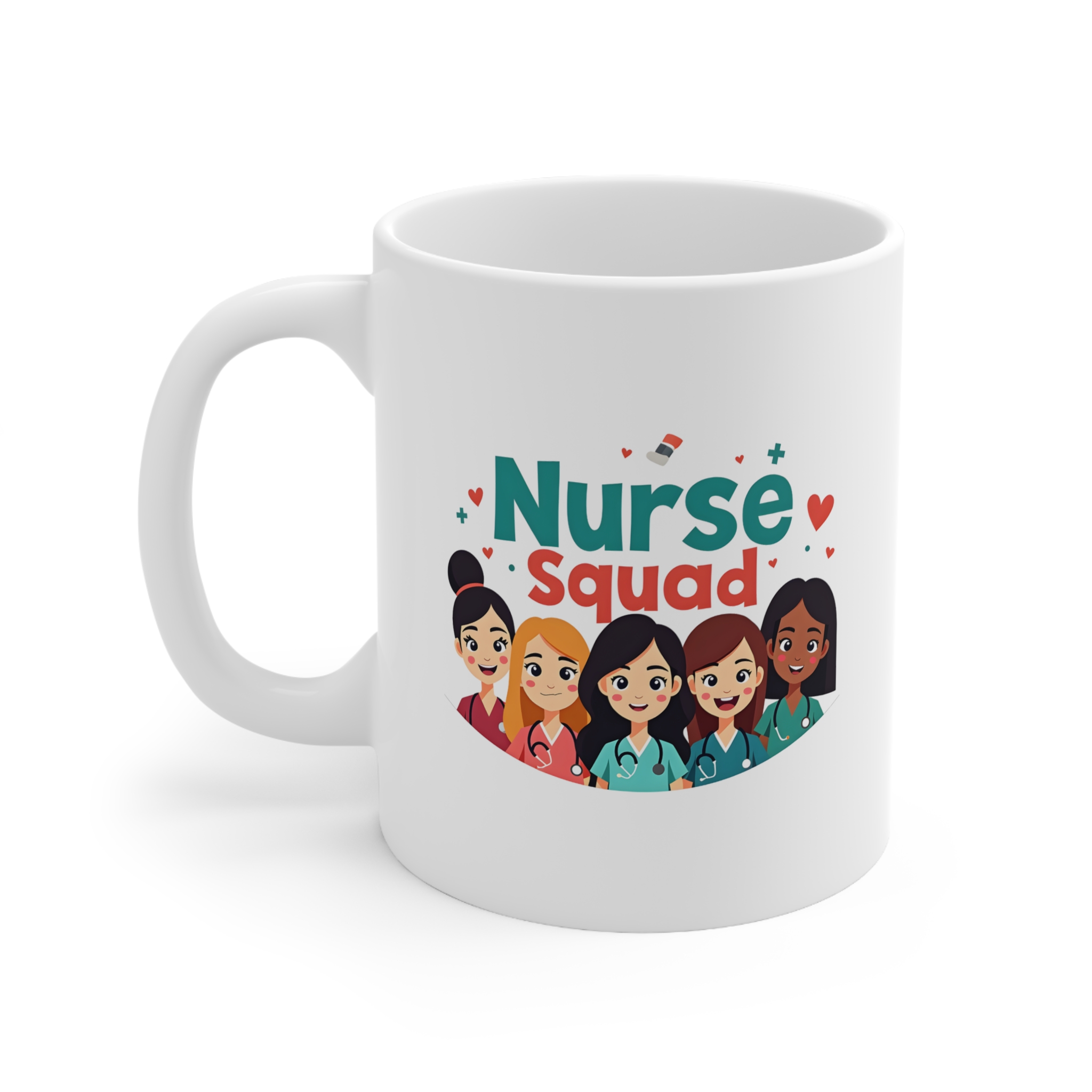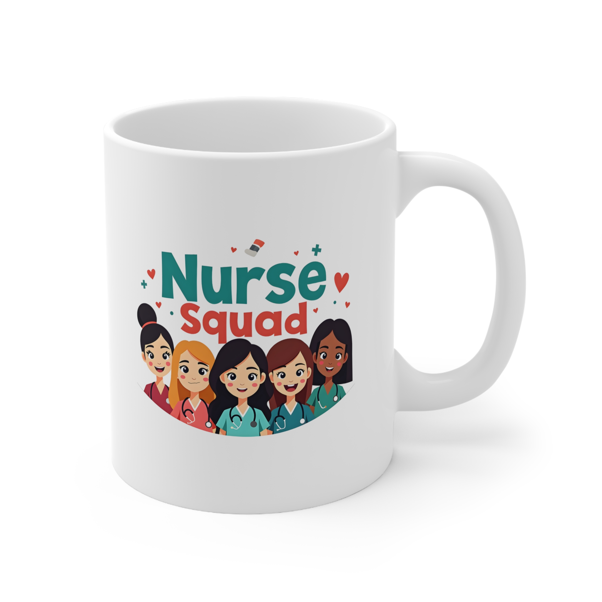 Celebrate your team with the “Nurse Squad” Mug—featuring cute cartoon avatars, colorful scrubs, and bold lettering perfect for nurse groups and friendships.