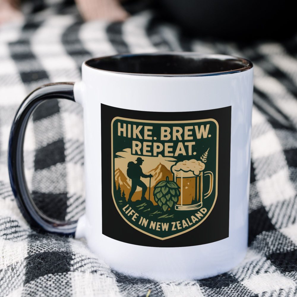 Celebrate New Zealand’s rugged trails and legendary craft beer culture with this bold hiking adventure mug. Featuring a badge-style design with a mountain hiker, frothy beer, and hops, it proudly proclaims: “Hike. Brew. Repeat. Life in New Zealand.” It’s the perfect companion for anyone who craves the outdoors by day and a cold one by night.