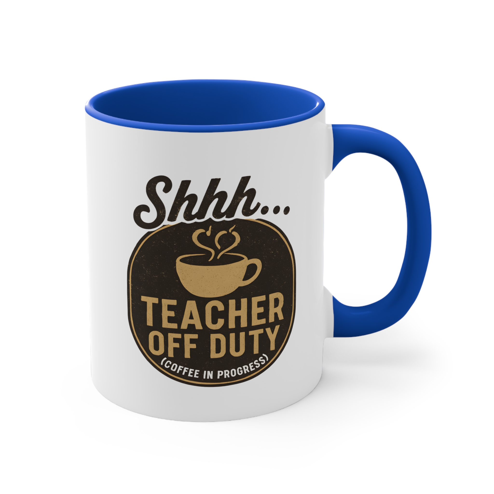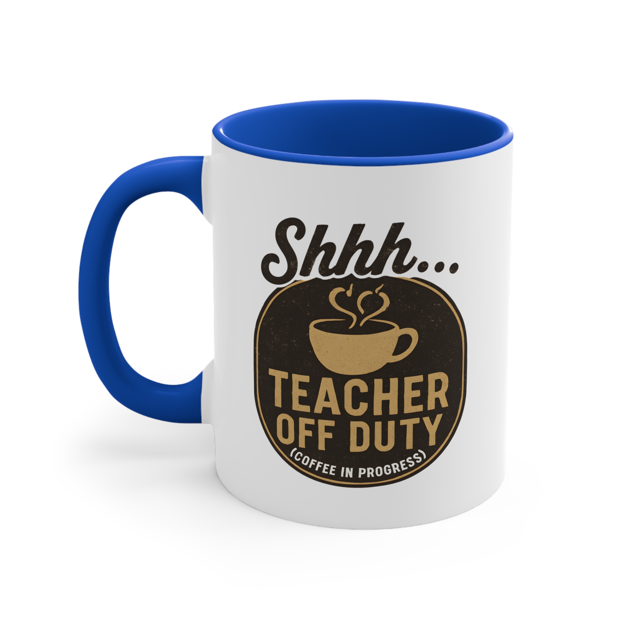 Sometimes the best lesson is silence—and coffee. This off duty teacher mug features the phrase “Shhh… Teacher Off Duty (Coffee in Progress)” in vintage-style typography with a steaming coffee cup. A hilarious and relatable gift for any teacher who needs their moment of peace before the school bell rings.
