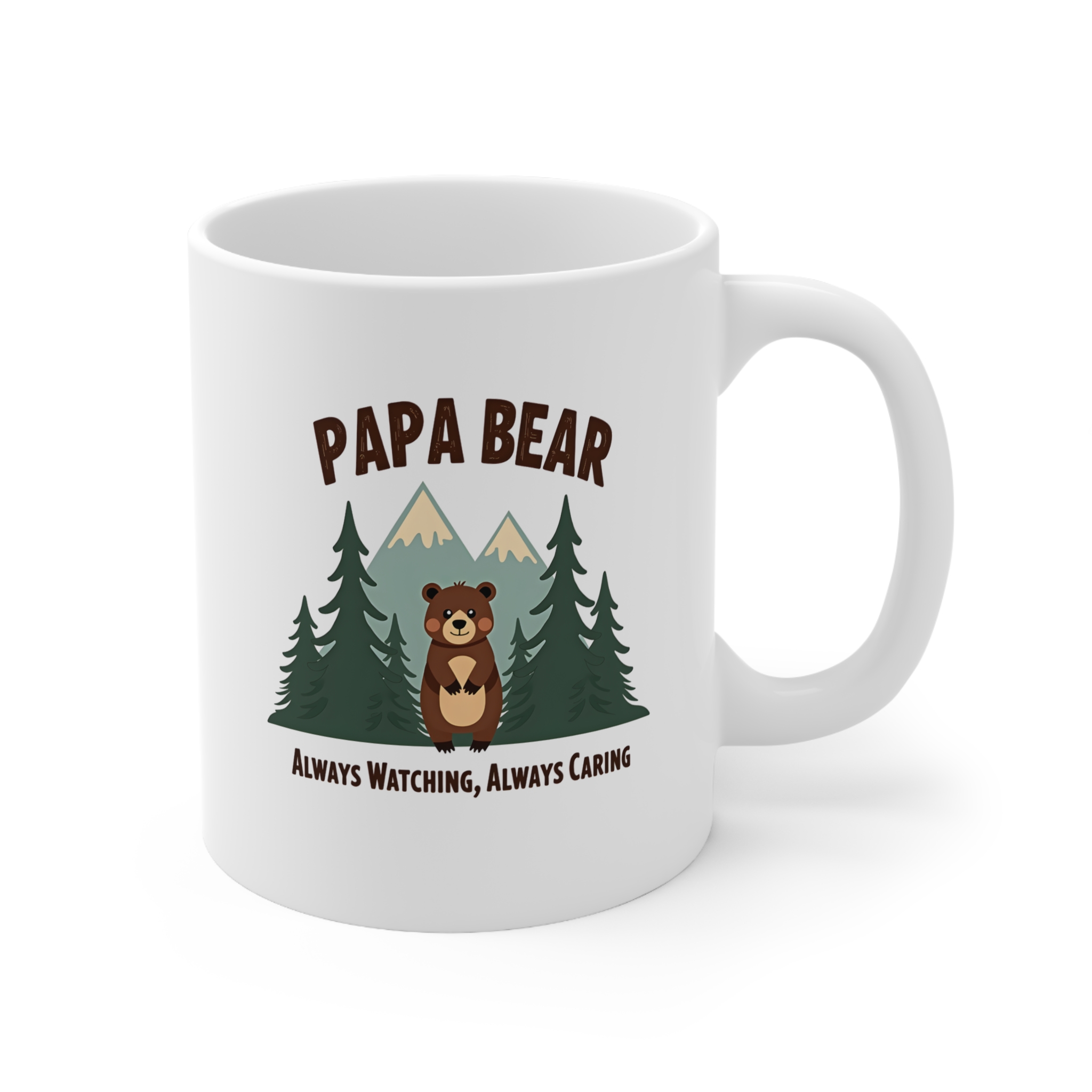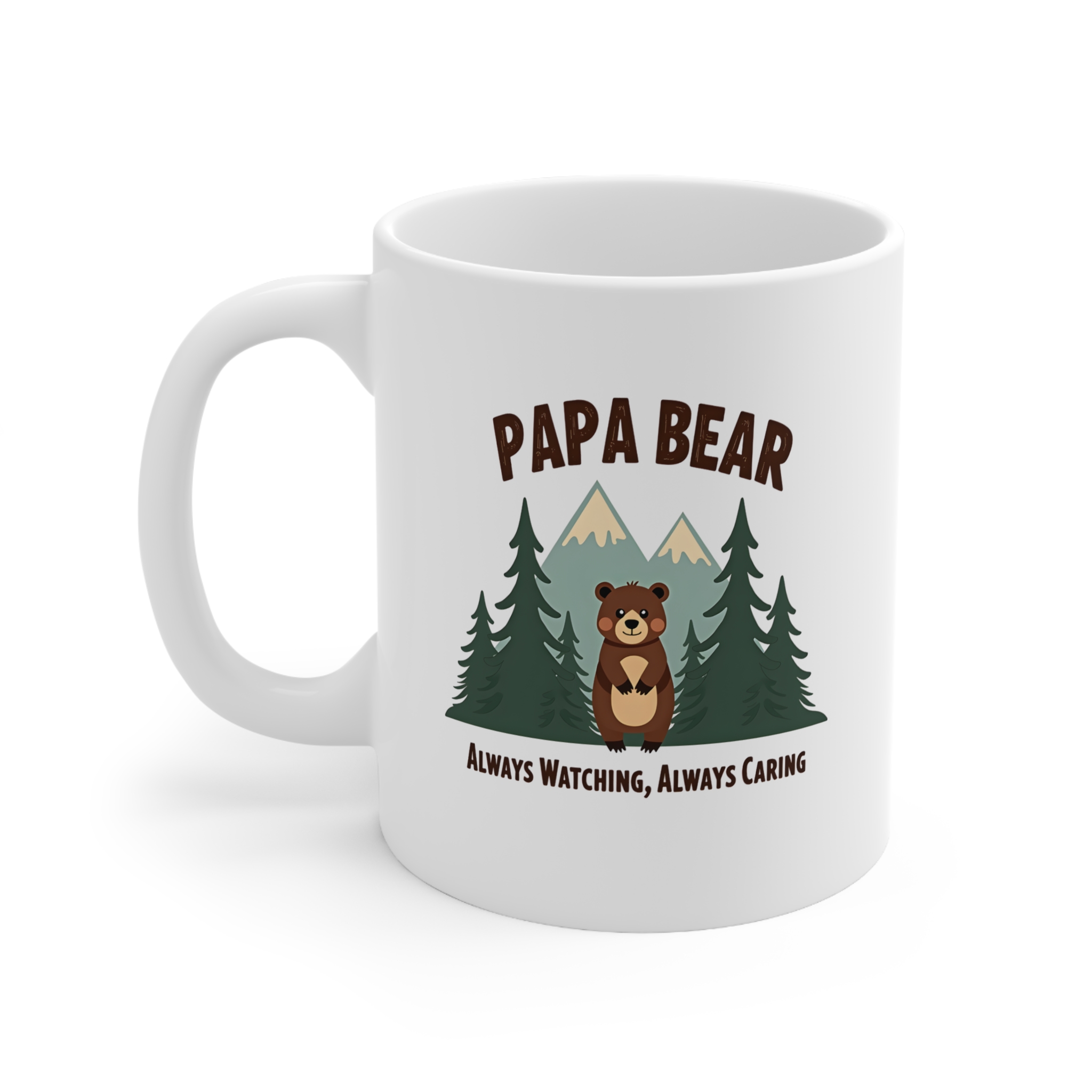 Strong, steady, and always watching—this Papa Bear mug is a heartwarming tribute to the protector and gentle giant in your life. Featuring a sweet bear illustration surrounded by pine trees and mountains, the message “Always Watching, Always Caring” captures everything that makes Dad or Grandpa so special.