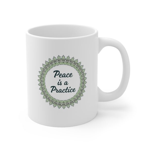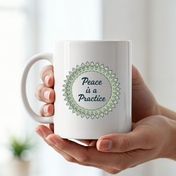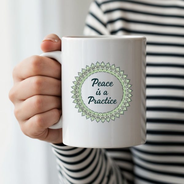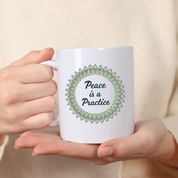Yoga mindfulness mug with mandala design and “Peace is a Practice” script—crafted in soothing tones for tranquil daily moments.