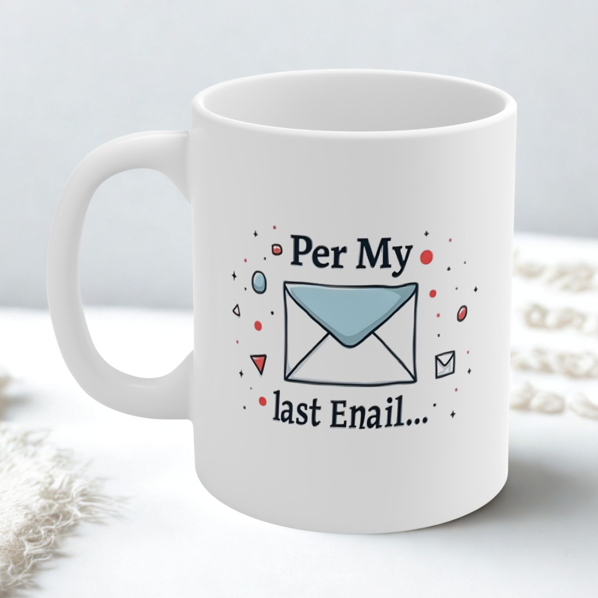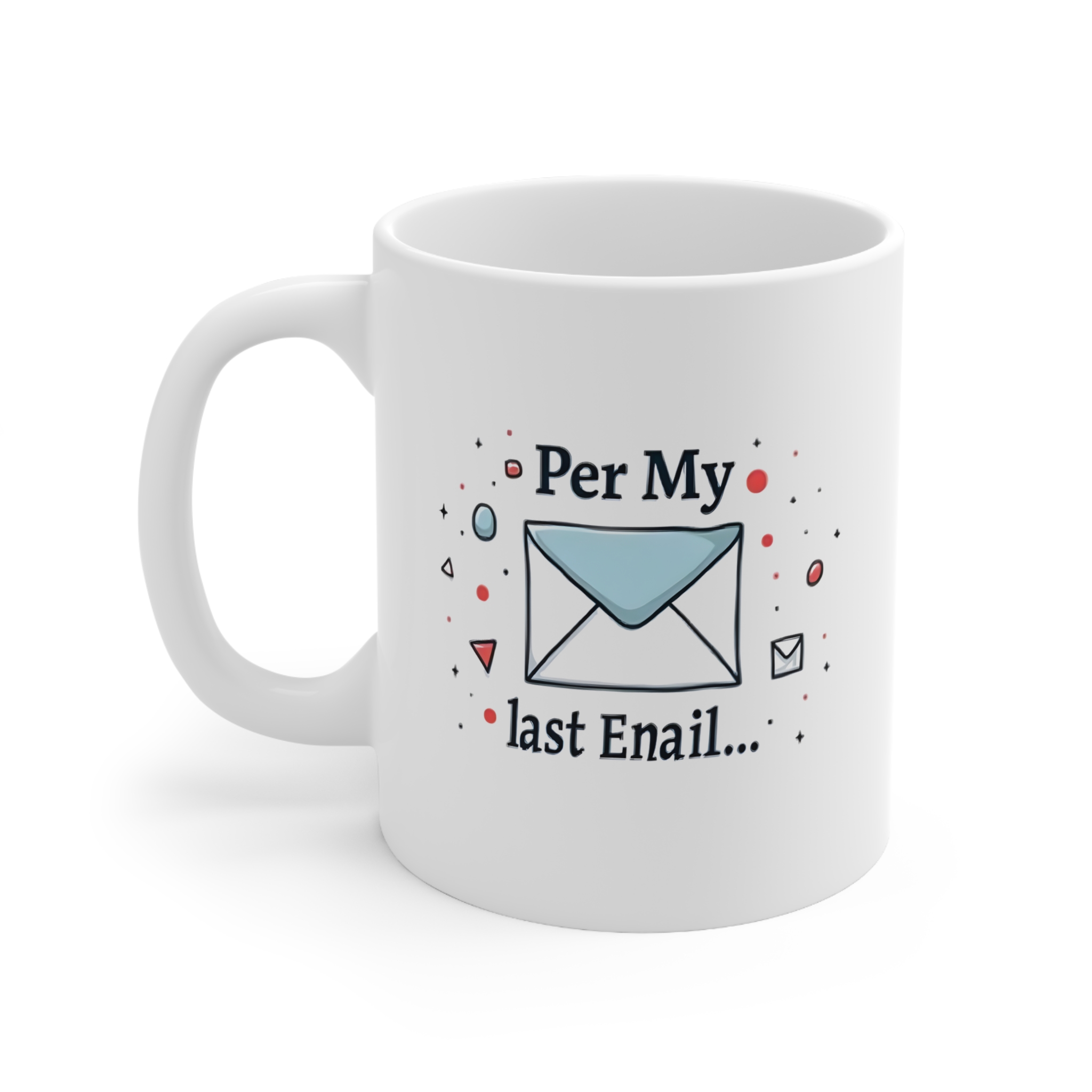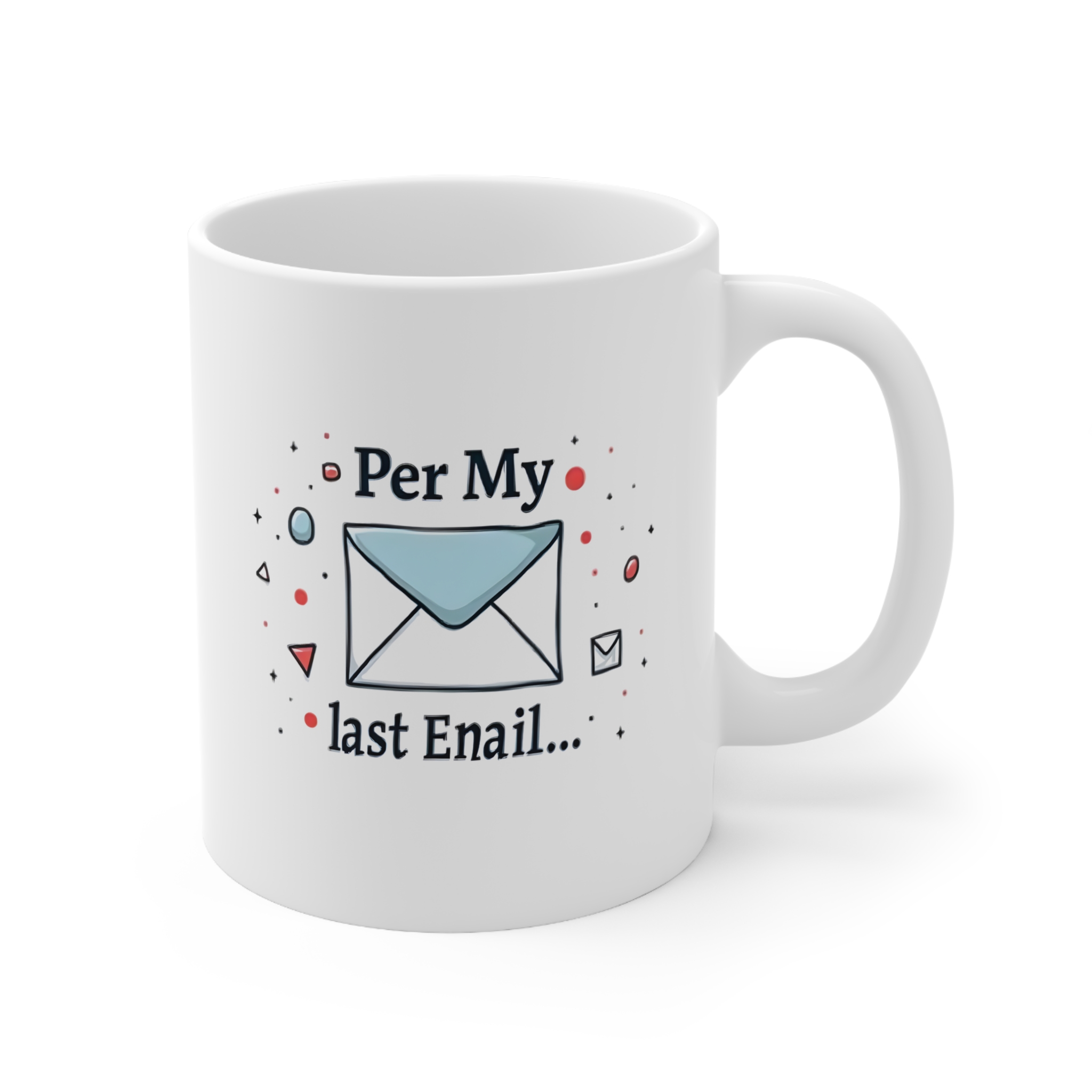 Our “Per My Last Enail…” Mug is the ultimate typo-fueled jab wrapped in corporate passive aggression. Bold sans-serif text sits front and center, surrounded by clean, abstract geometric shapes in soft blues, grays, and a pop of bright red—just enough flair to say, “I’m trying… but I’m also done.” It’s the ideal mug for office warriors who fight battles one email (or enail) at a time.