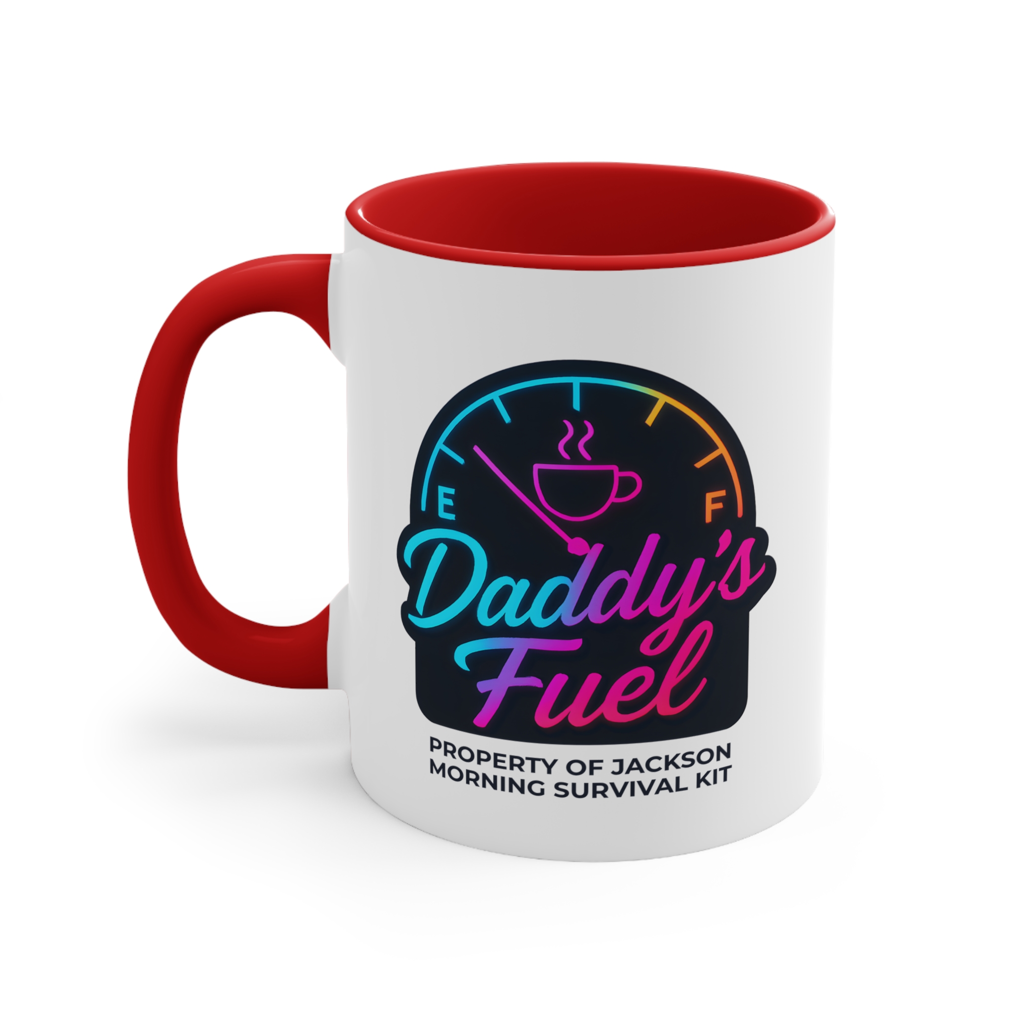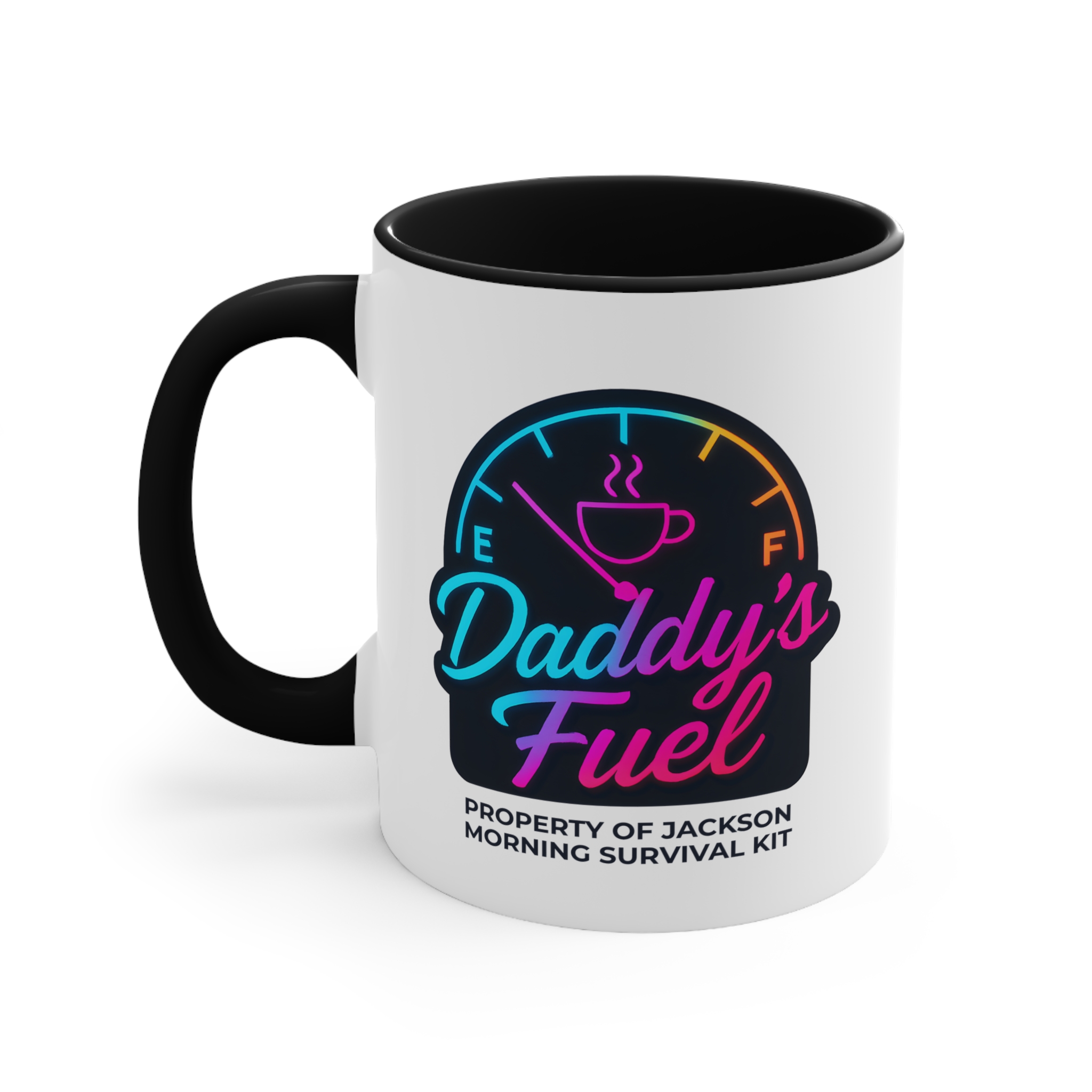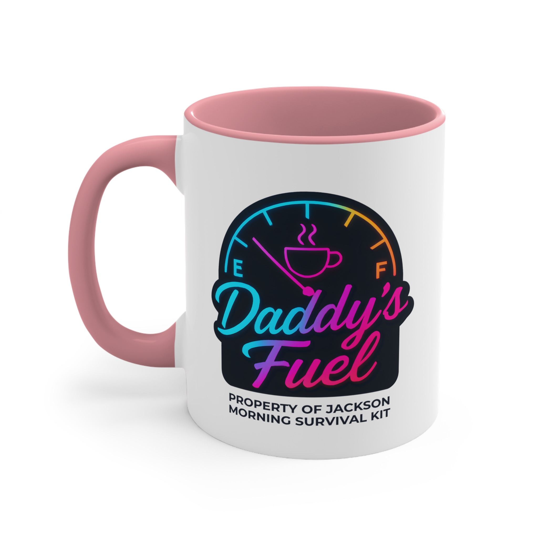 Start Dad’s engine the right way with this personalised dad mug featuring a vibrant neon fuel gauge design. With “Daddy’s Fuel” in bold, colourful script and “Property of [Child’s Name] – Morning Survival Kit” underneath, this mug is a perfect blend of fun and function. The glowing color gradient makes it stand out in any kitchen — and in Dad’s morning routine.