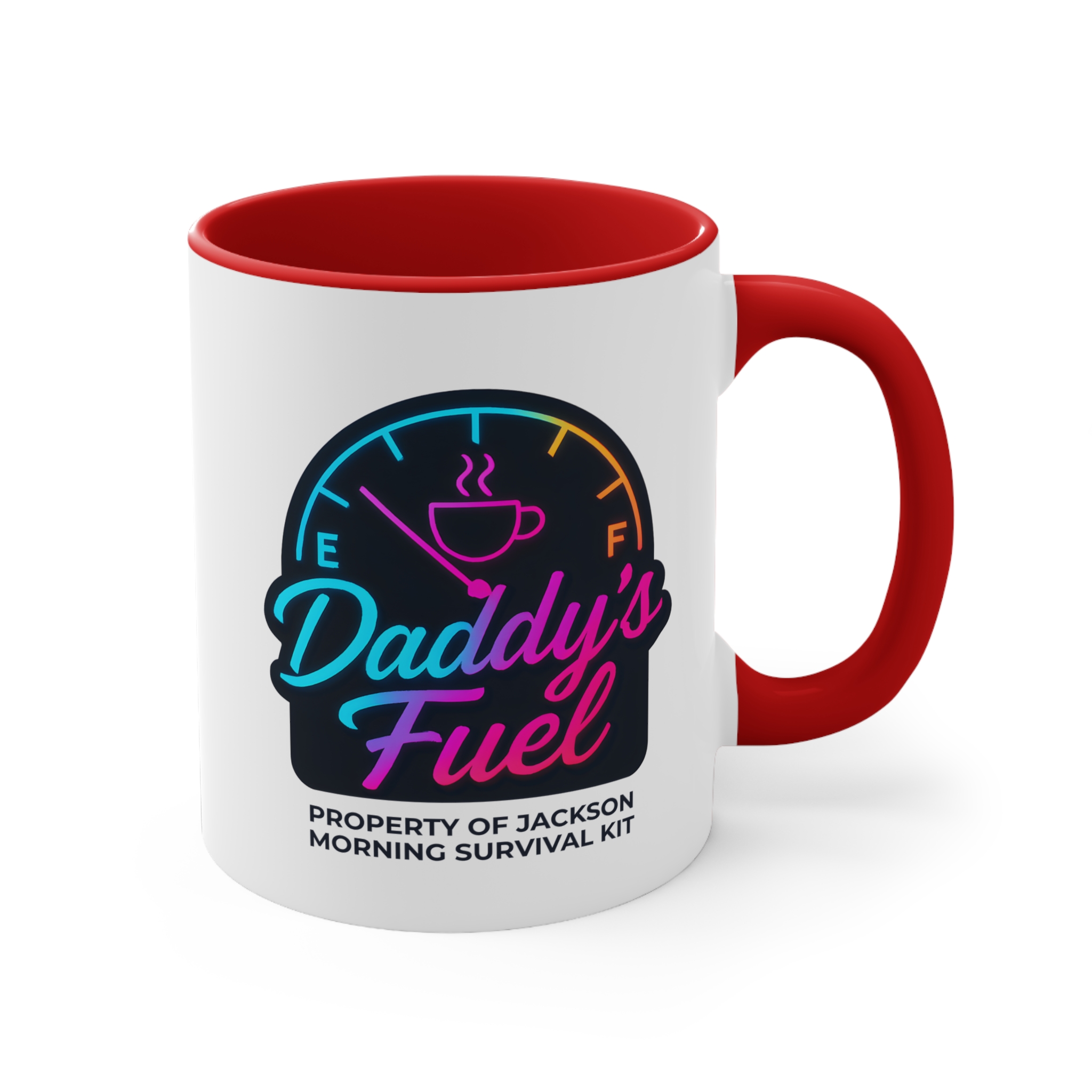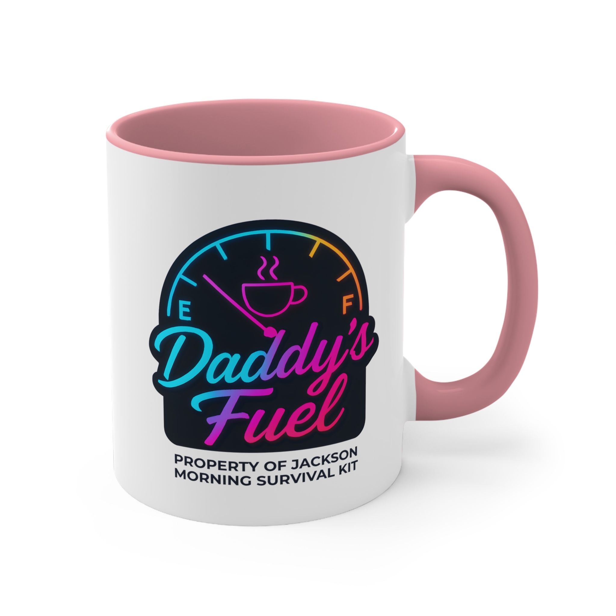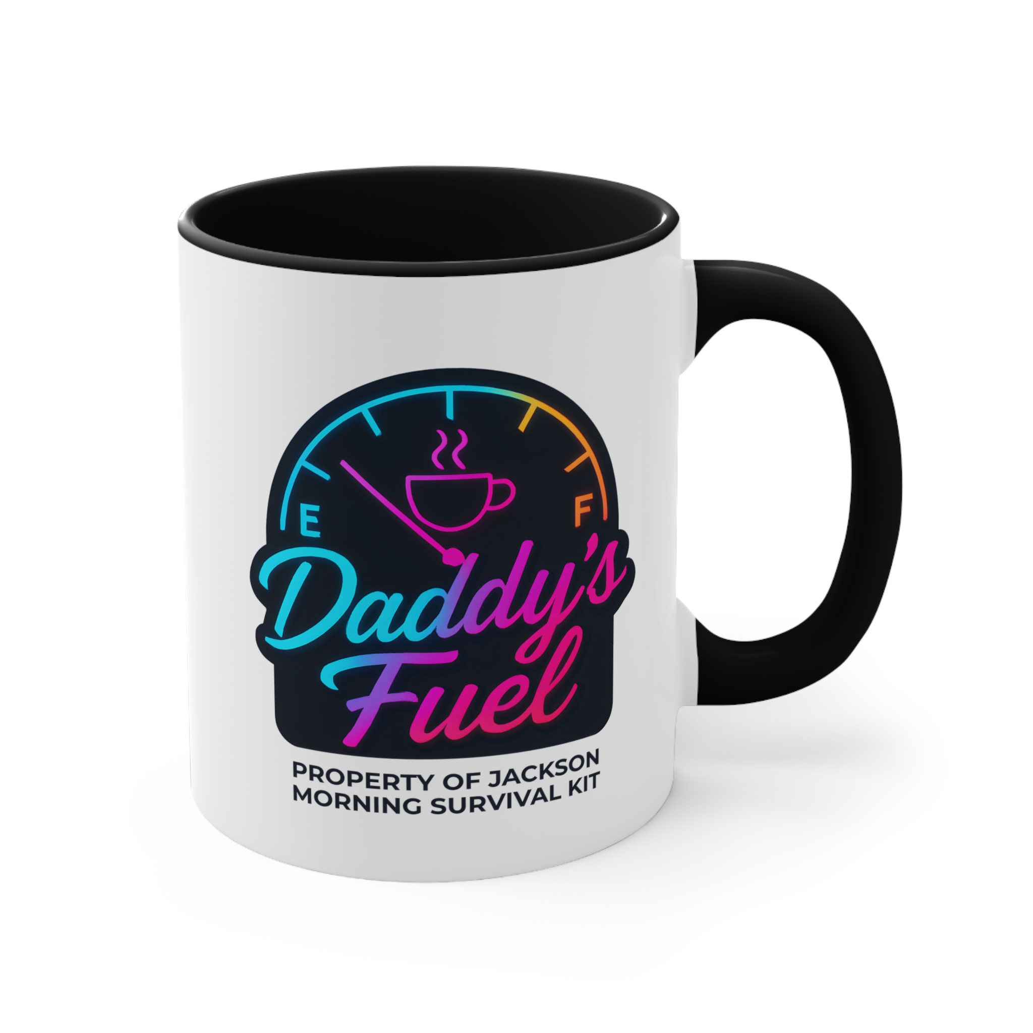 Start Dad’s engine the right way with this personalised dad mug featuring a vibrant neon fuel gauge design. With “Daddy’s Fuel” in bold, colourful script and “Property of [Child’s Name] – Morning Survival Kit” underneath, this mug is a perfect blend of fun and function. The glowing color gradient makes it stand out in any kitchen — and in Dad’s morning routine.