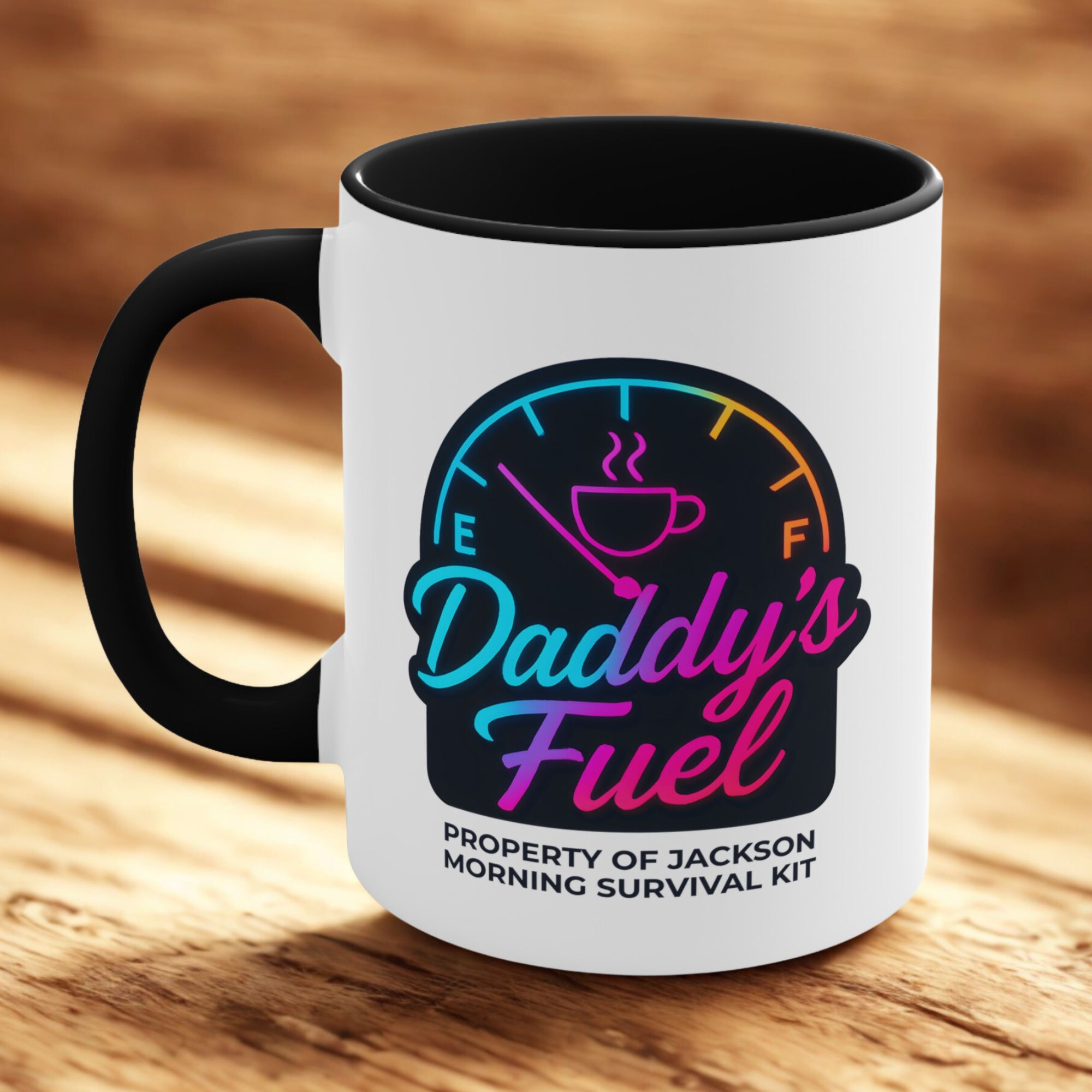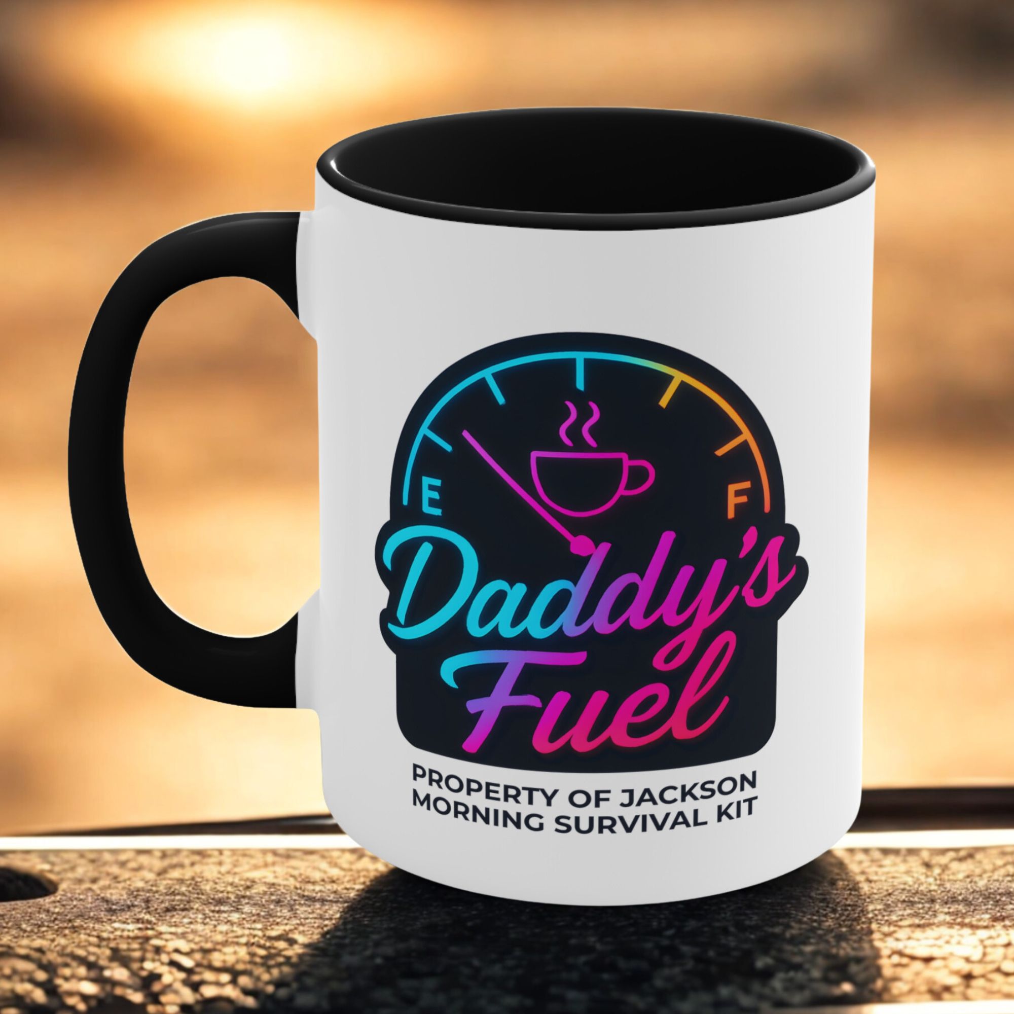 This personalised dad mug features a glowing neon fuel gauge and your child’s name — the ultimate morning survival kit for coffee-loving dads.