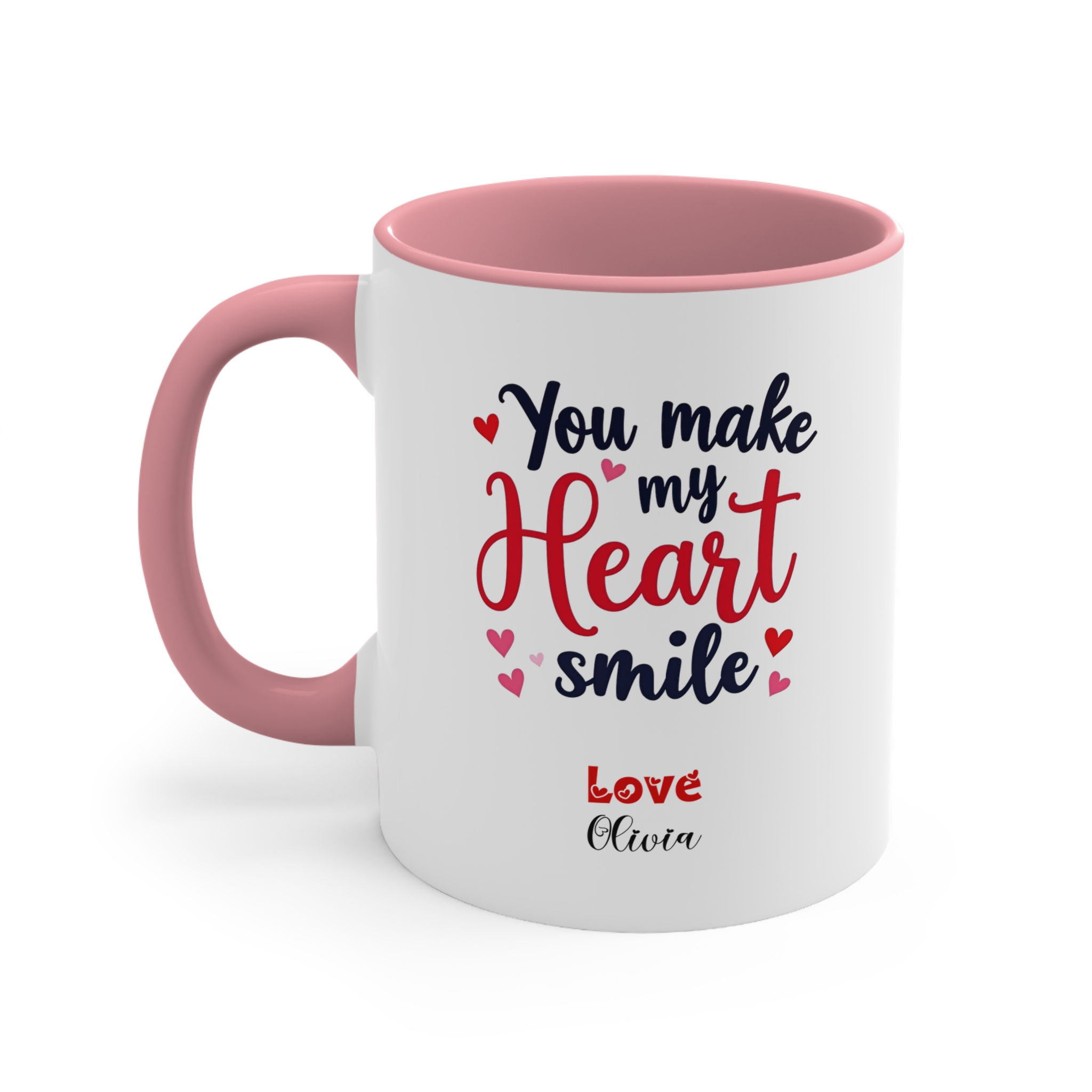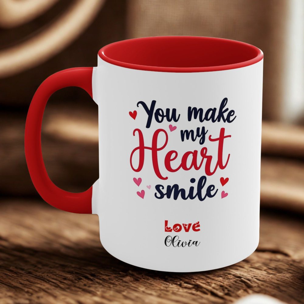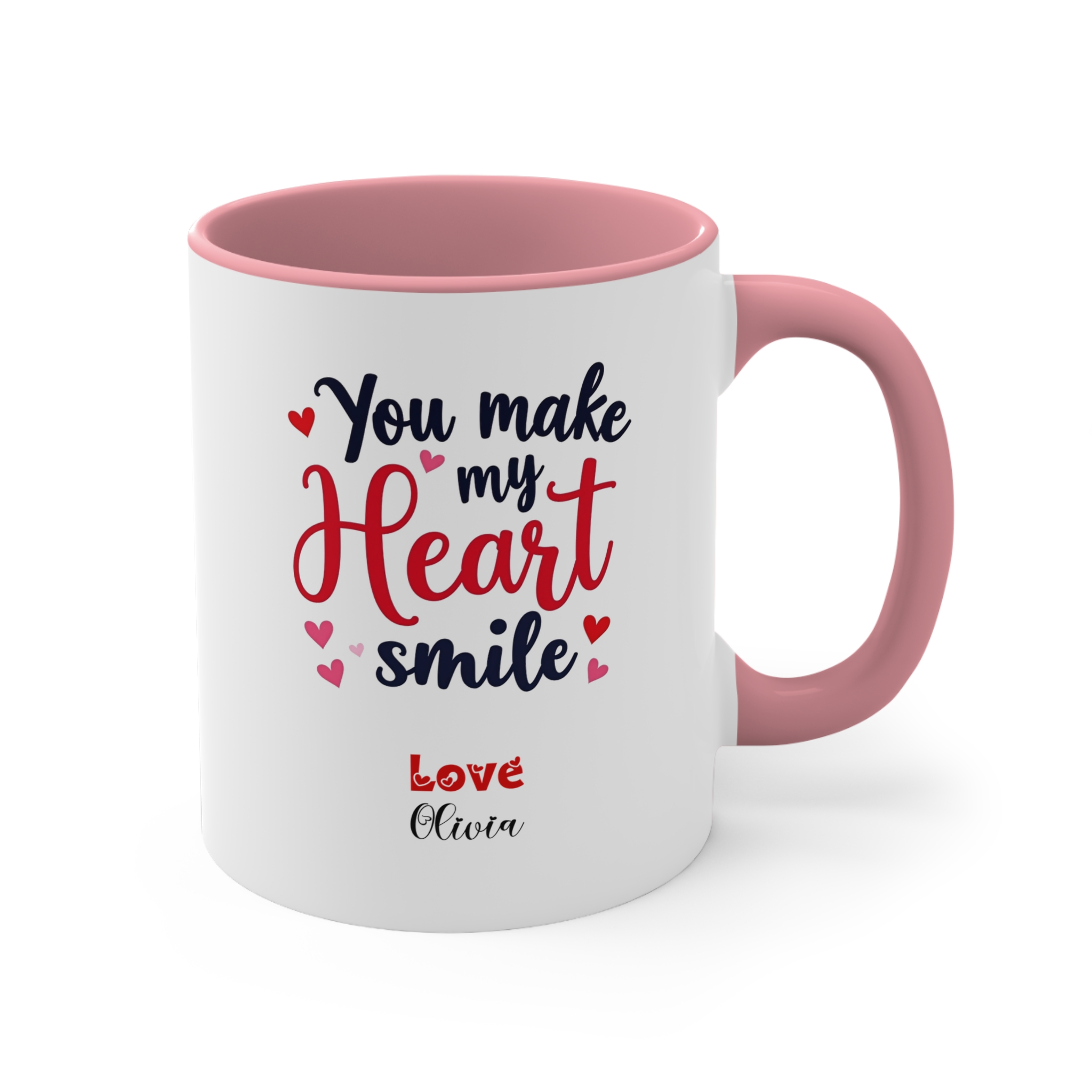 Personalised love mug with the quote “You Make My Heart Smile” and custom name. A thoughtful, heartwarming gift for partners or loved ones.