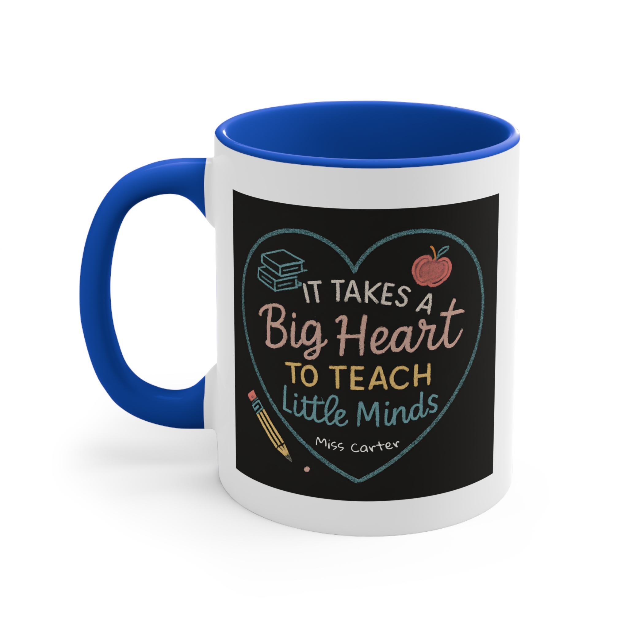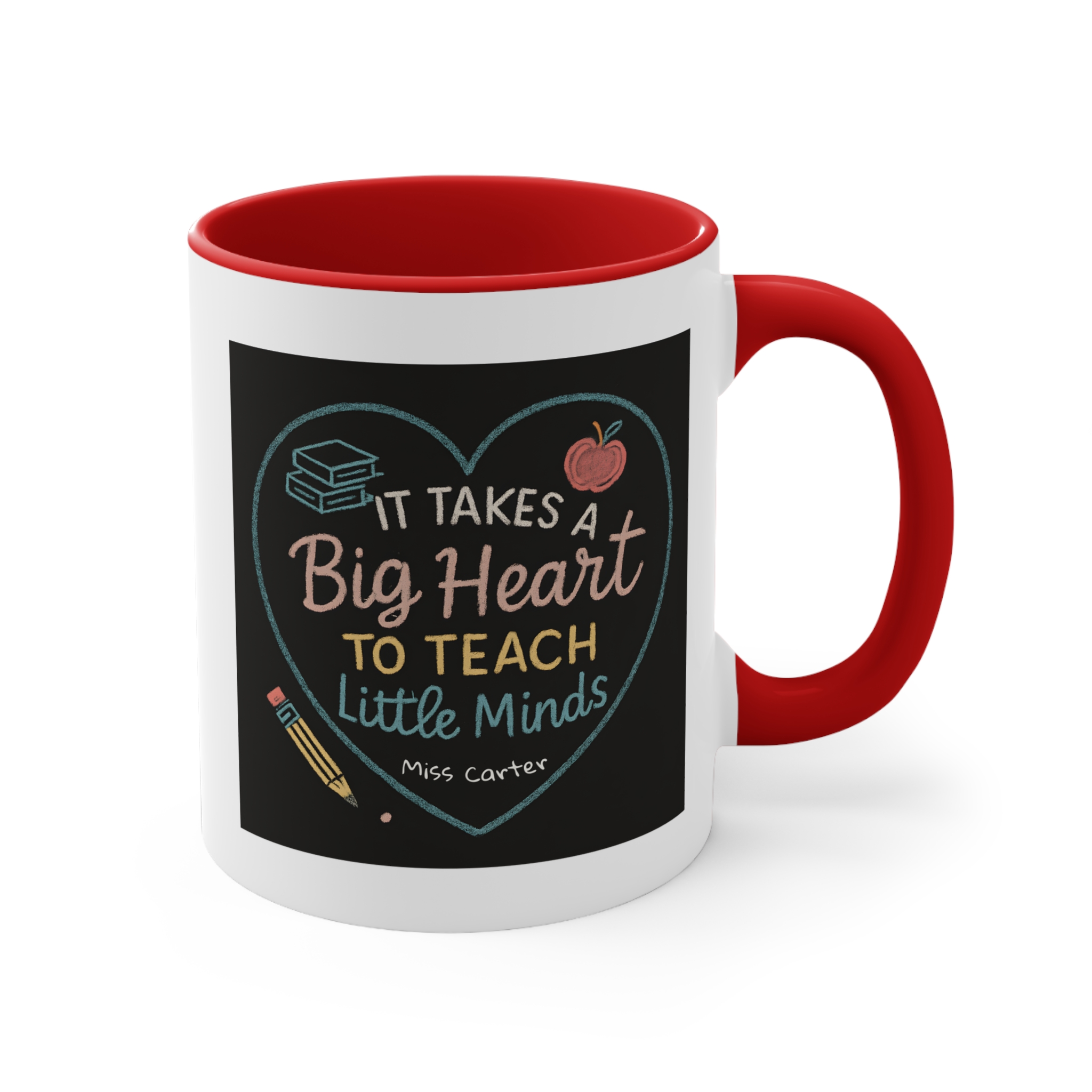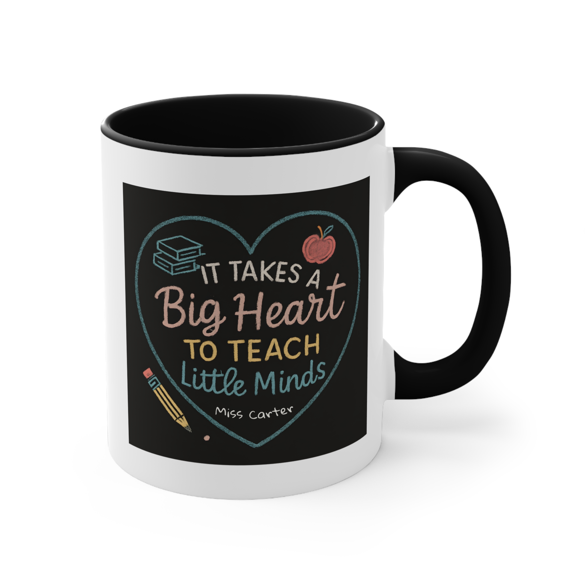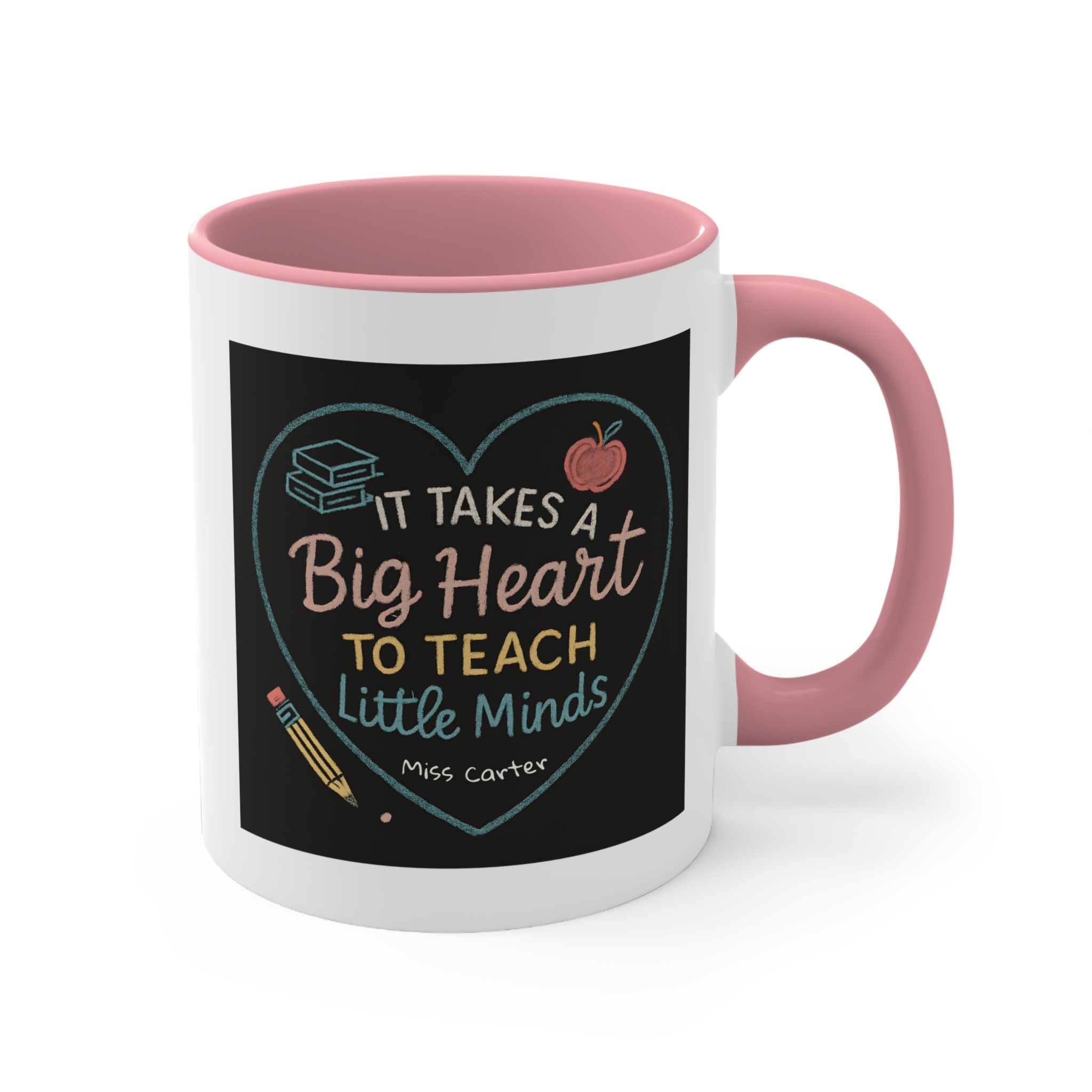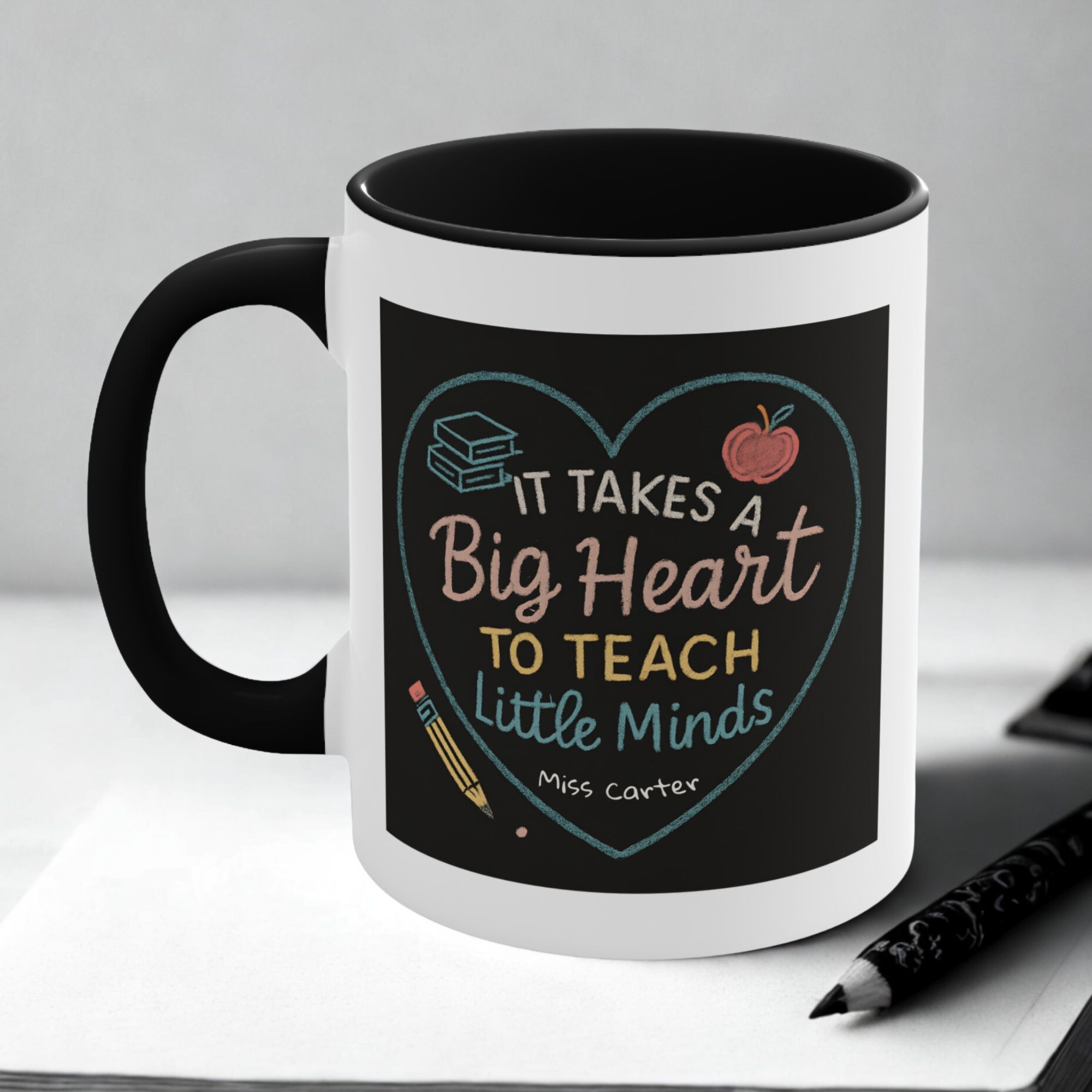 Celebrate an inspiring educator with this personalised teacher appreciation mug featuring the quote “It Takes a Big Heart to Teach Little Minds” and a custom teacher name.